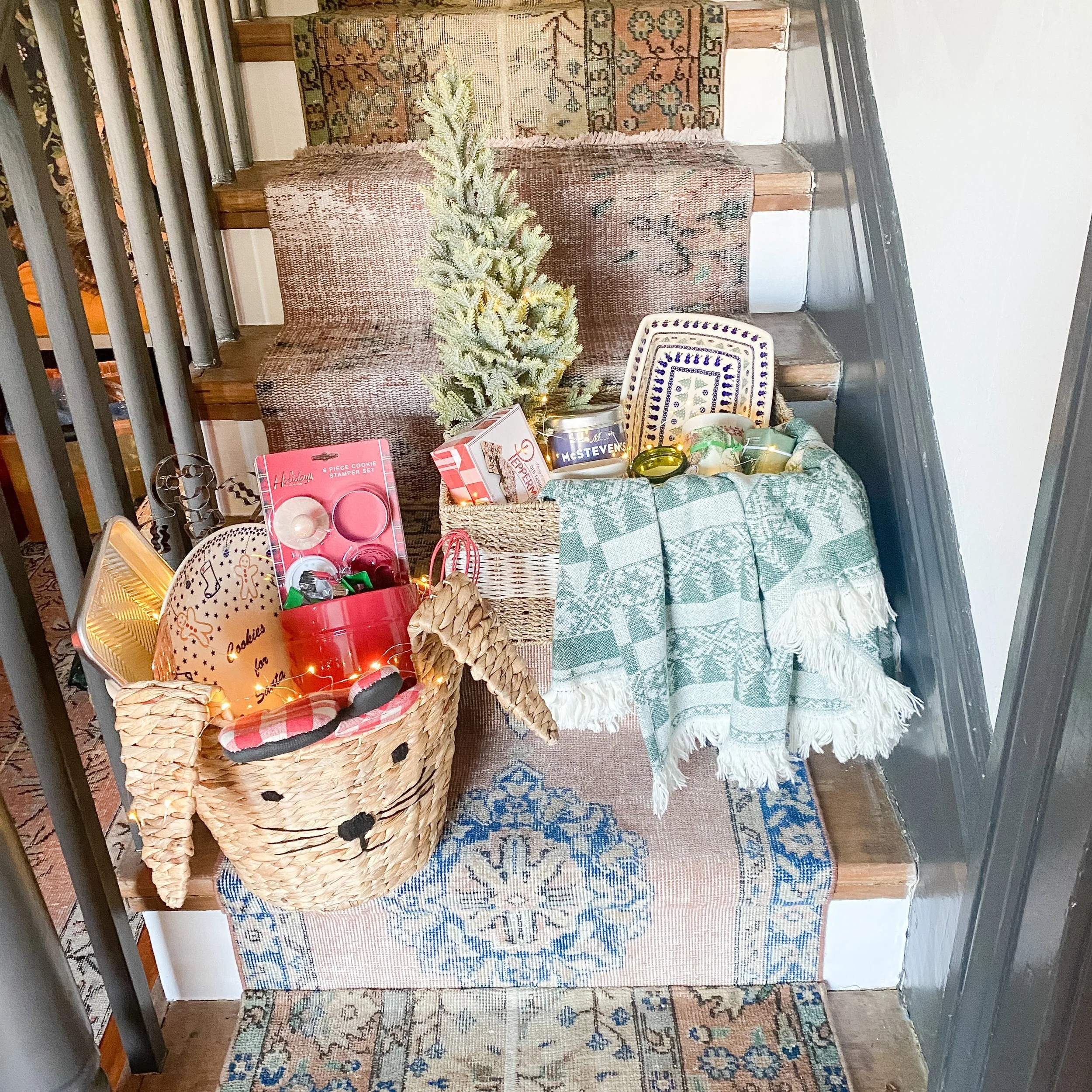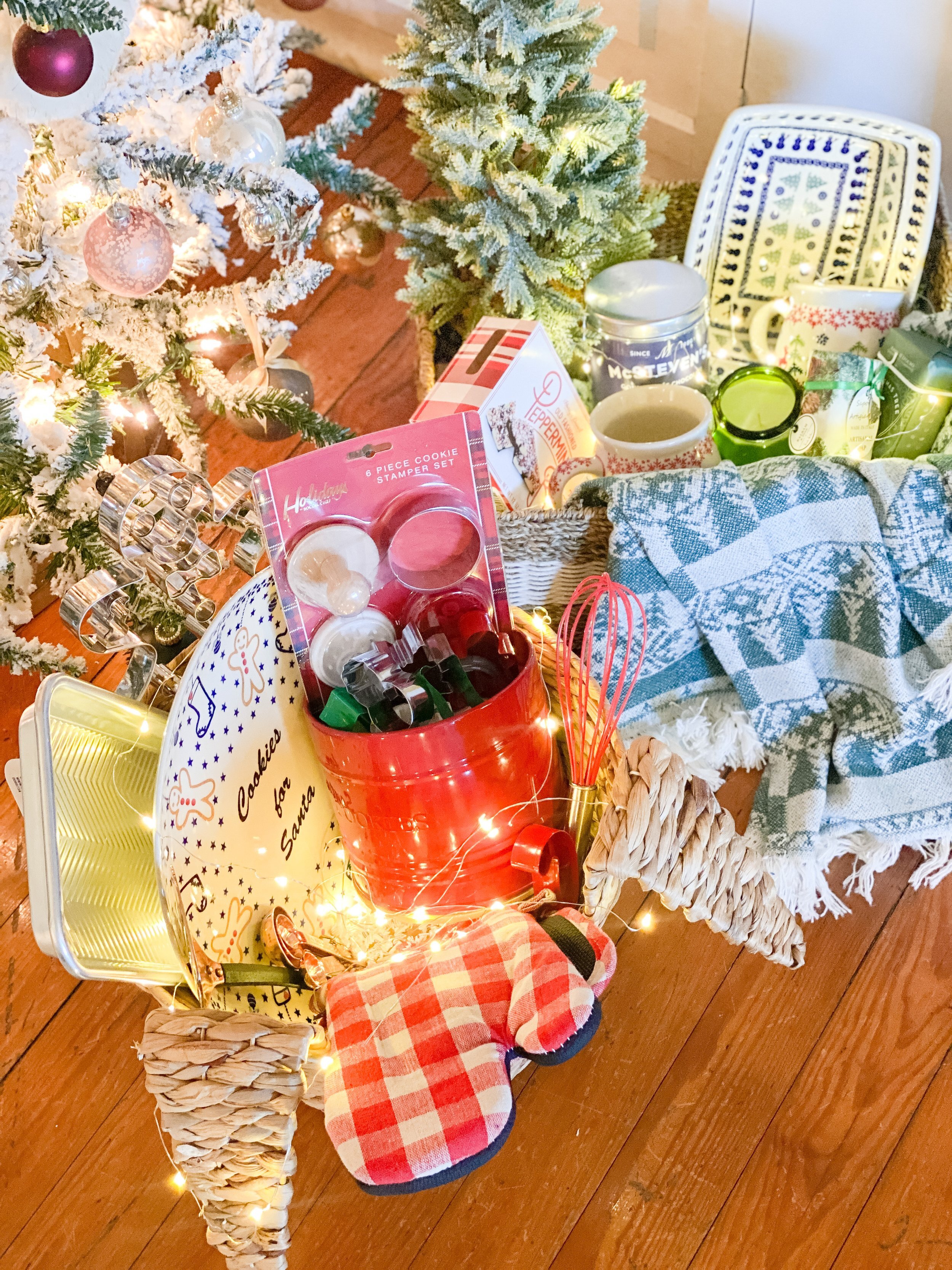 I also was inspired by all the cute baking and serving ware I saw at my local store, so the second basket I put together was a fun “Cookies for Santa” baking basket! I geared this one more towards little ones, since I found this adorable bunny shaped basket (they actually had several different kinds of cute animal baskets!). This basket includes everything you need for an afternoon of Christmas cookie baking: a whisk, measuring spoons, spatula, baking sheet, Cookies for Santa decorative platter, cookie cutter galore, cookie stamps, cookie jar, and oven mitt! Again this gift would be adorable for a teacher, neighbor, cousin, child, or classmate!