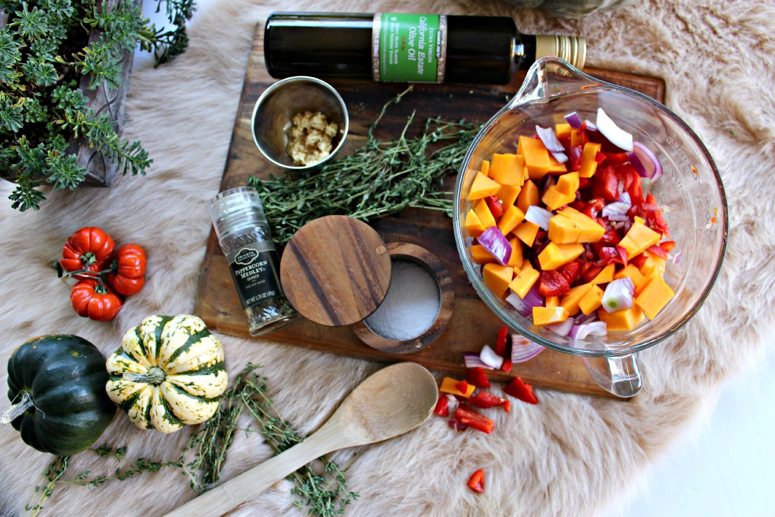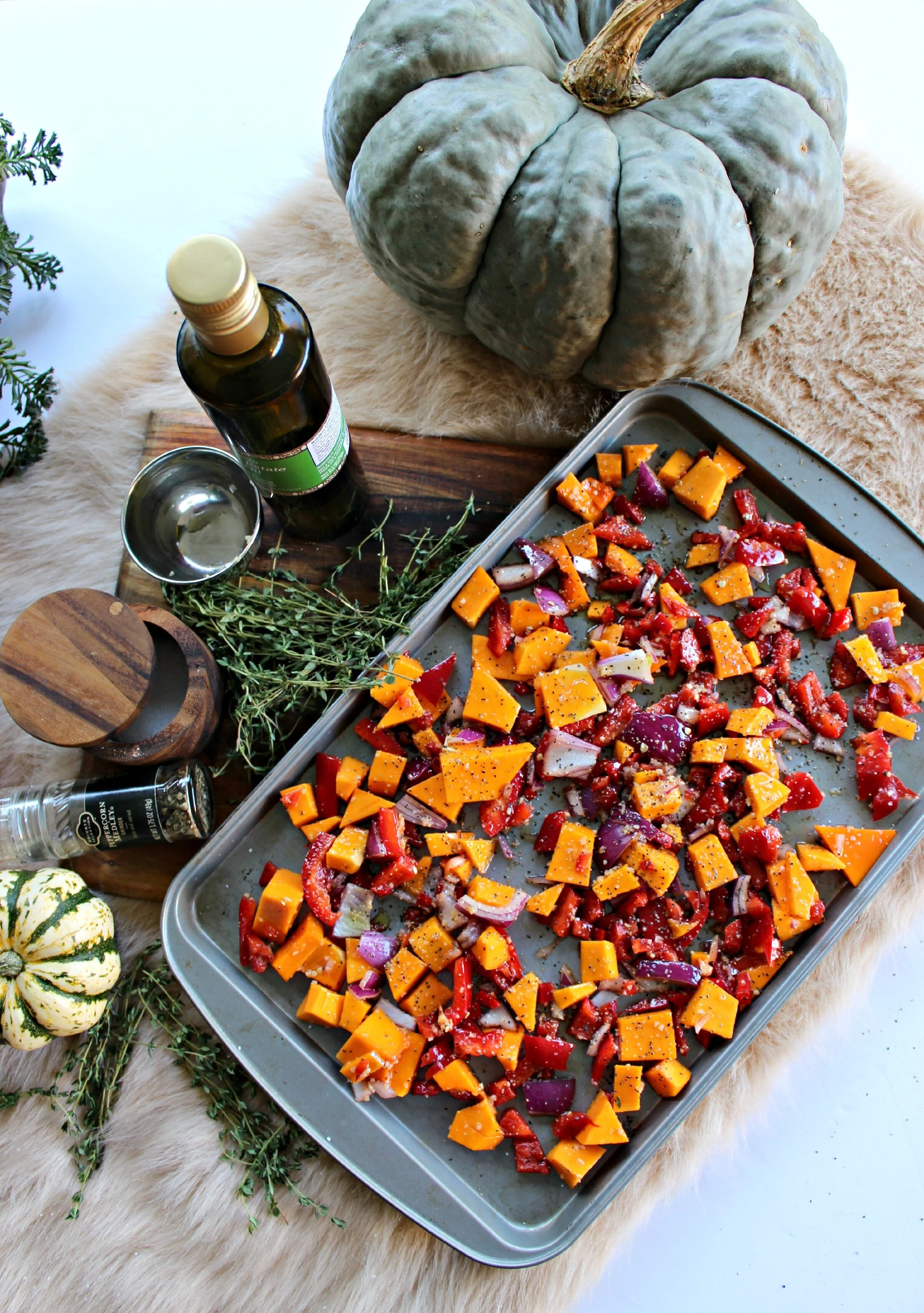 Preheat your oven to 450 degrees.  Chop all you veggies: squash (peel, seed and chop- find out how here), onion, and red pepper.  If pre-cut veggies are available at your grocery it will cut your prep time down a lot.