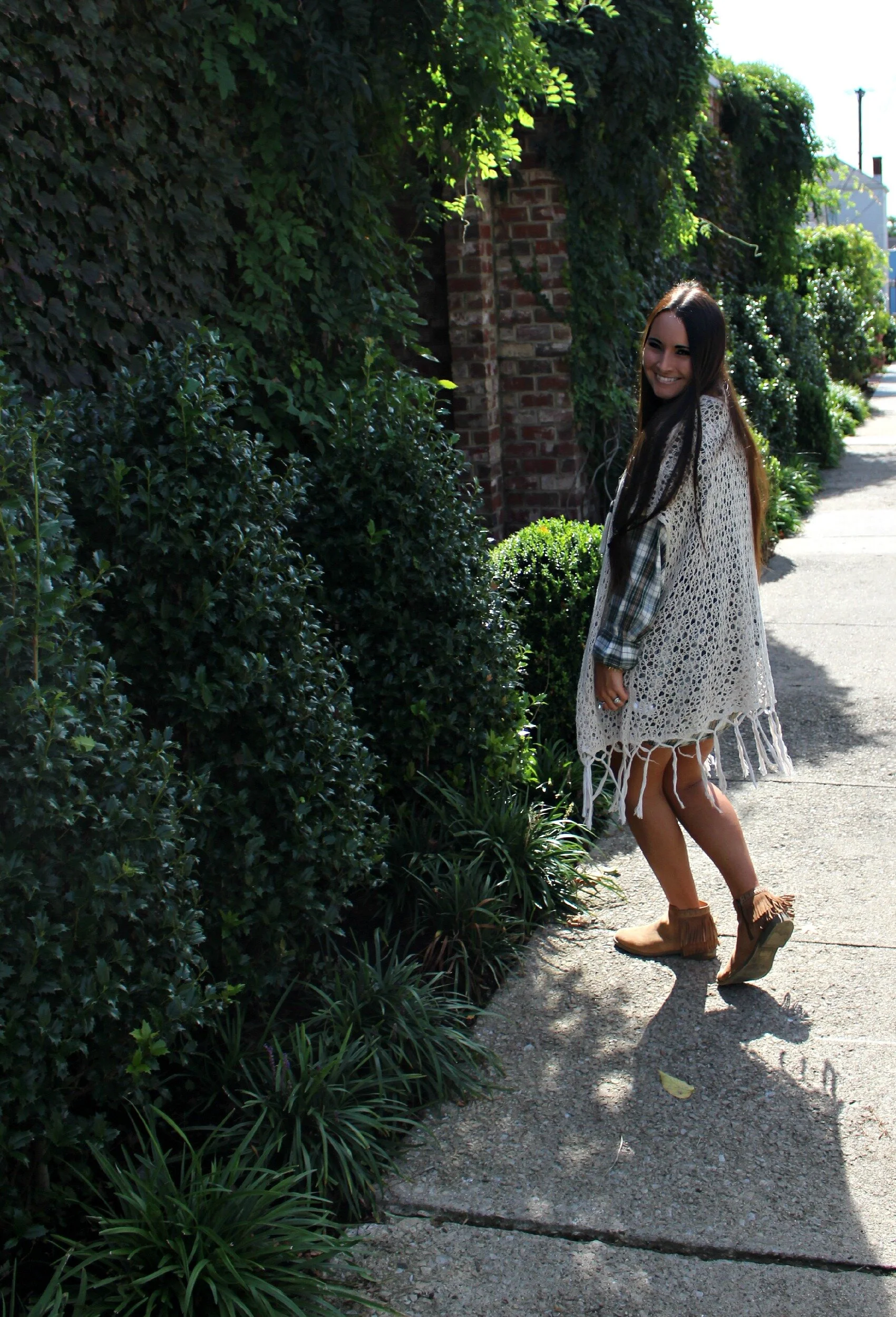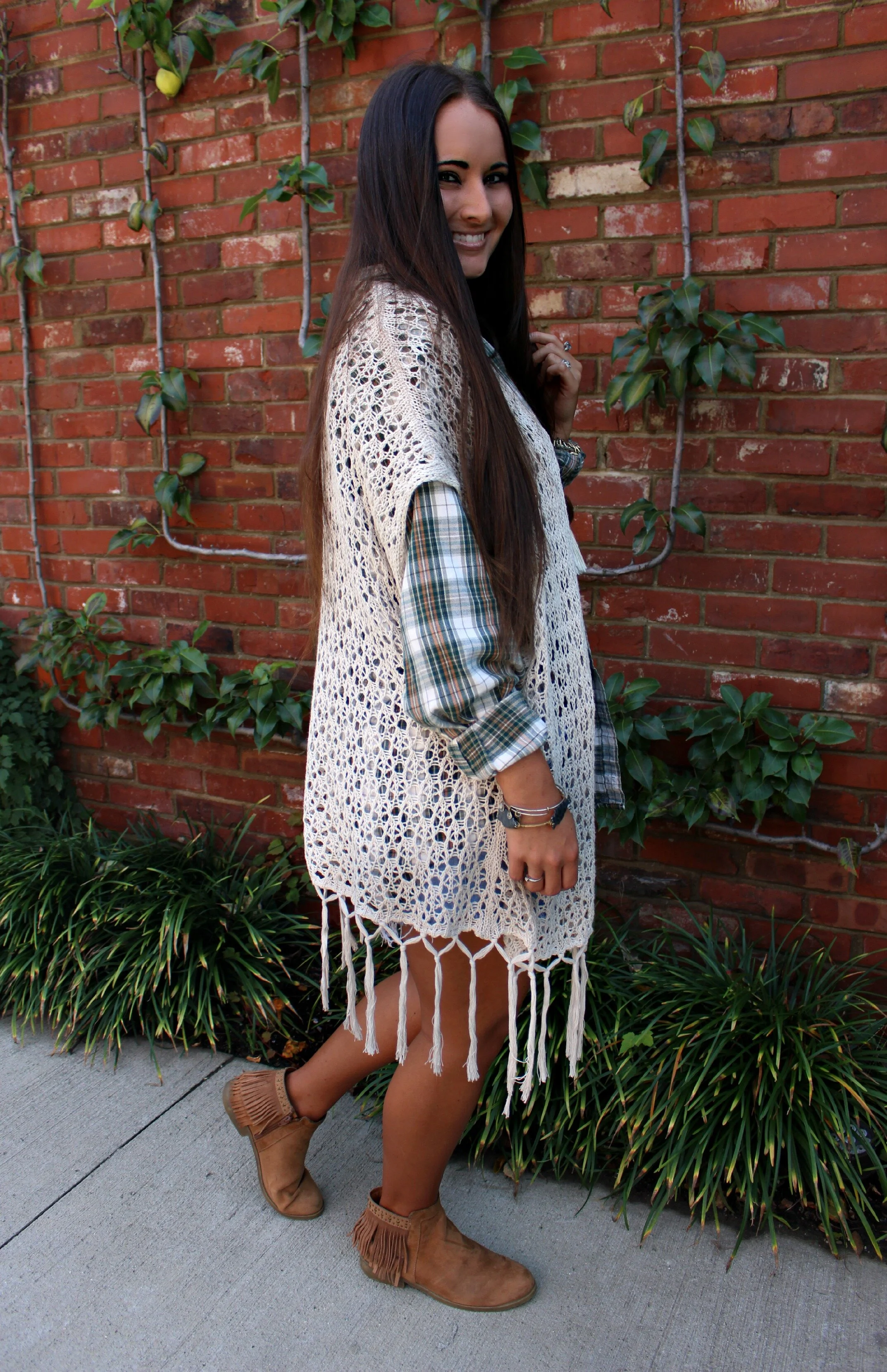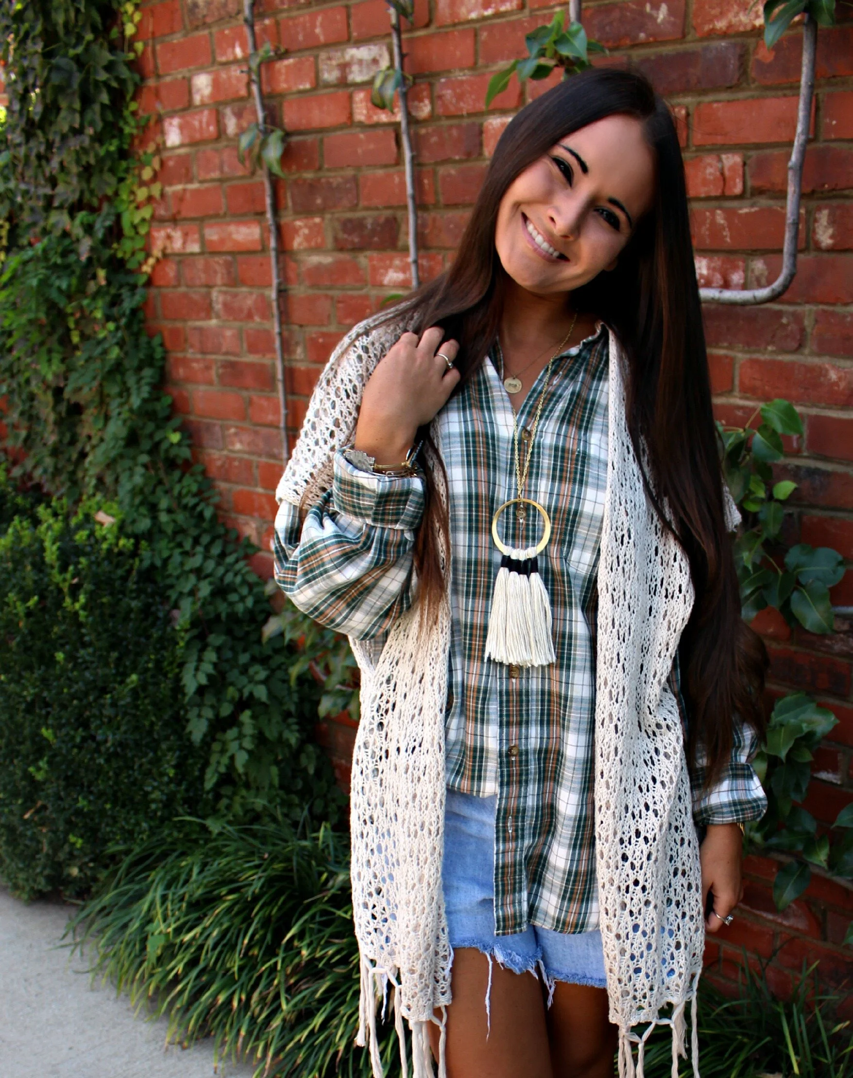 One of my favorite fall transitional outfits is pairing boots with shorts. It's the easiest way to wear some of your favorite fall pieces without looking too bundled up and still staying comfortable when it's sunny and warm out. I love to add some fall layers on top to balance out the look- flannels, slouchy sweaters, light jackets, vests, or flowy cardigans all work perfectly. This crochet fringed vest from Target has gotten a lot of wear in both the summer and fall- it's perfect for throwing on over dresses, blouses, or basic tees! I paired it with a vintage slouchy flannel, some layered necklaces, vintage cut-offs, and added even more fringe with these casual booties. I obviously can't get enough flannel or fringe- I keep wearing these fall staples over and over again!