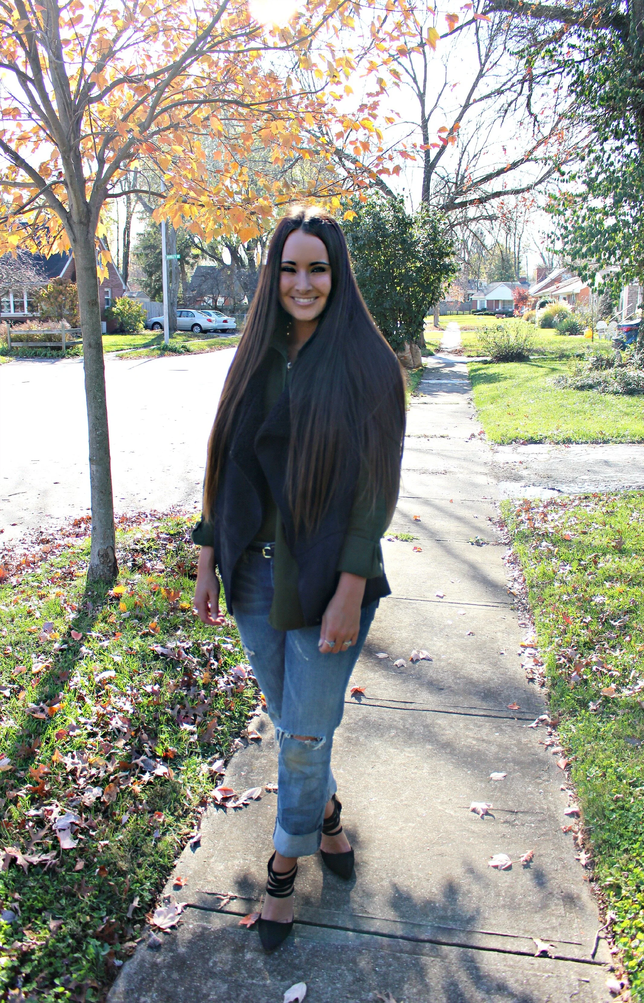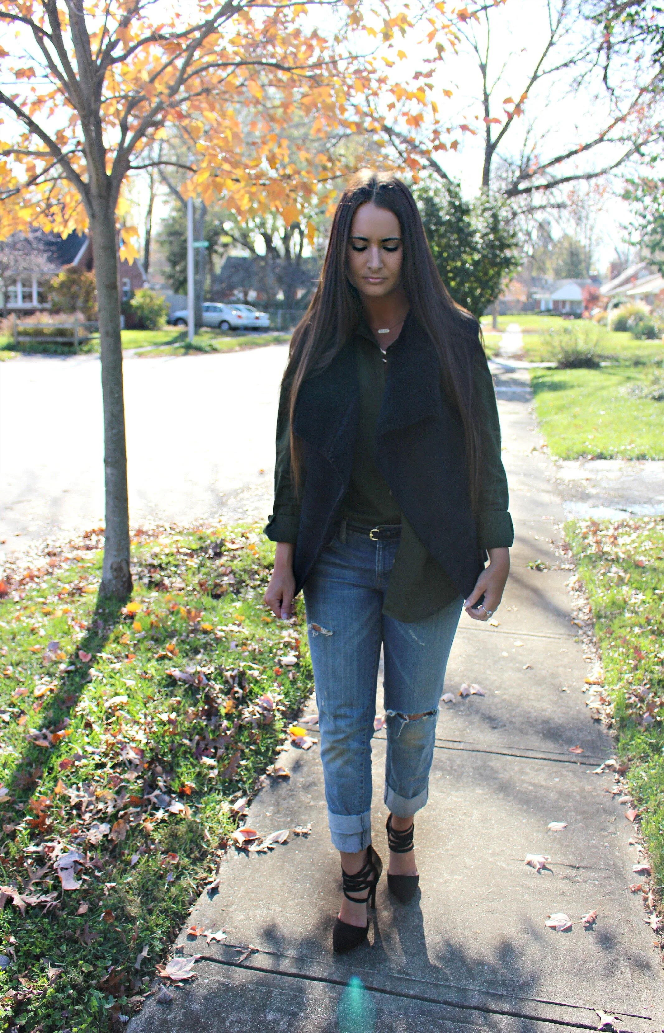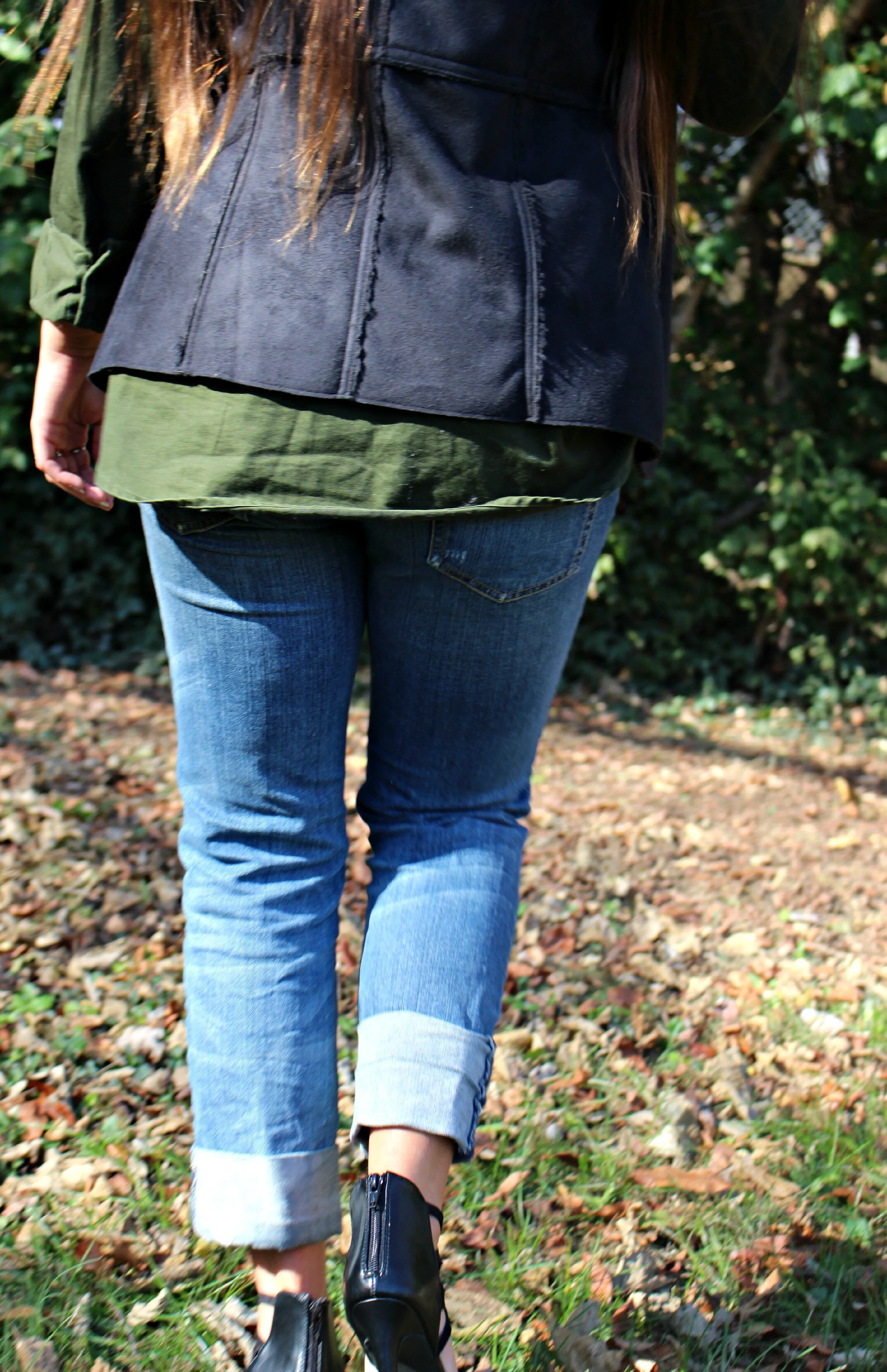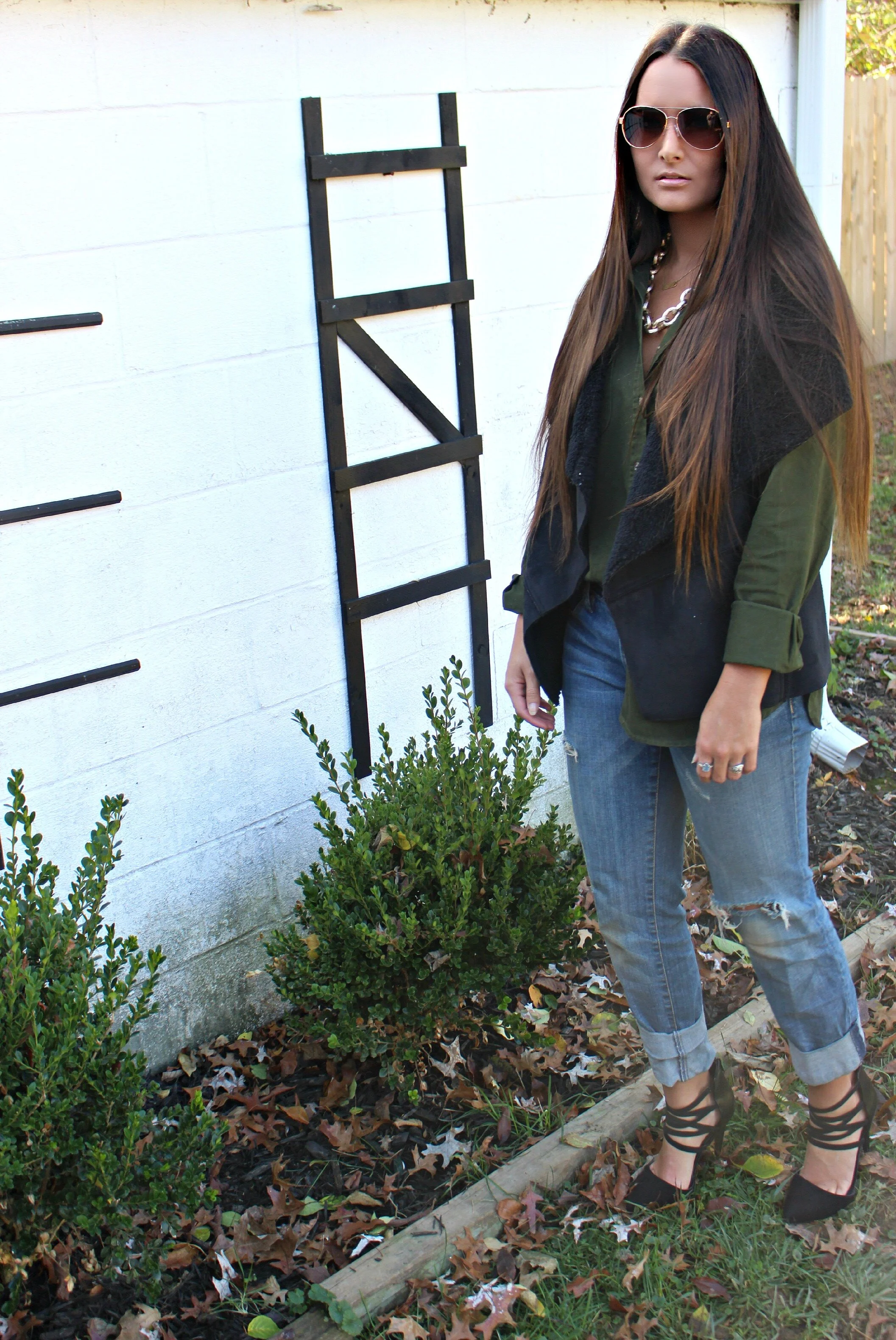 Vests are just the best layering piece for fall and my collection seems to just keeps growing! It includes vintage and new fur vests, quilted vests, patterns, solids, and this super cozy shearling vest from Target that I can't get enough of lately. It's light-weight and comfortable enough to wear over just about anything, has an amazing drapey cut, and feels like a cozy, fuzzy blanket. Shearling is a must-have detail for fall/winter and is popping up on boots, purses, jackets, and scarves. I paired the vest with distressed boyfriend jeans, strappy black heels, and an olive utility shirt. This button-up shirt has the most flattering fit and is also so comfortable. Yes, I realized after I started writing this that almost everything I have on is from Target (oops!). That seems to happen way too often but I just can't stay away from that wonderful store! The good news is that means you can grab this entire outfit on a budget!