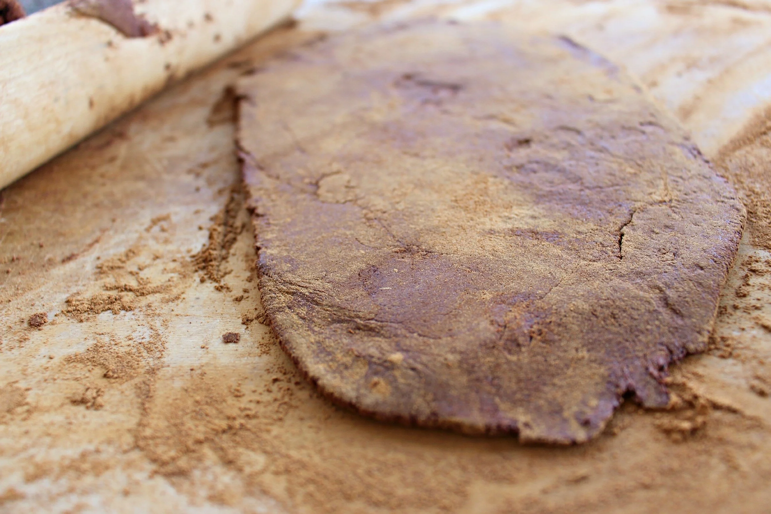 Dust a large surface with extra cinnamon (like you would with flour).  Grab a small portion of your dough (about 1/4 of the ball) and using a rolling pin, roll it out on top of the cinnamon.  Add more cinnamon as needed if your dough is sticking at all.