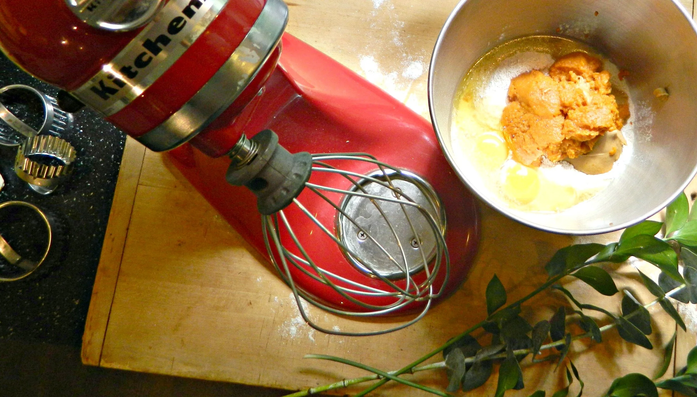 Preheat your oven to 350. Gather your ingredients to get started: 2 1/2 cups whole wheat flour, 1 cup pumpkin, 1/4 cup peanut butter, and 2 eggs.