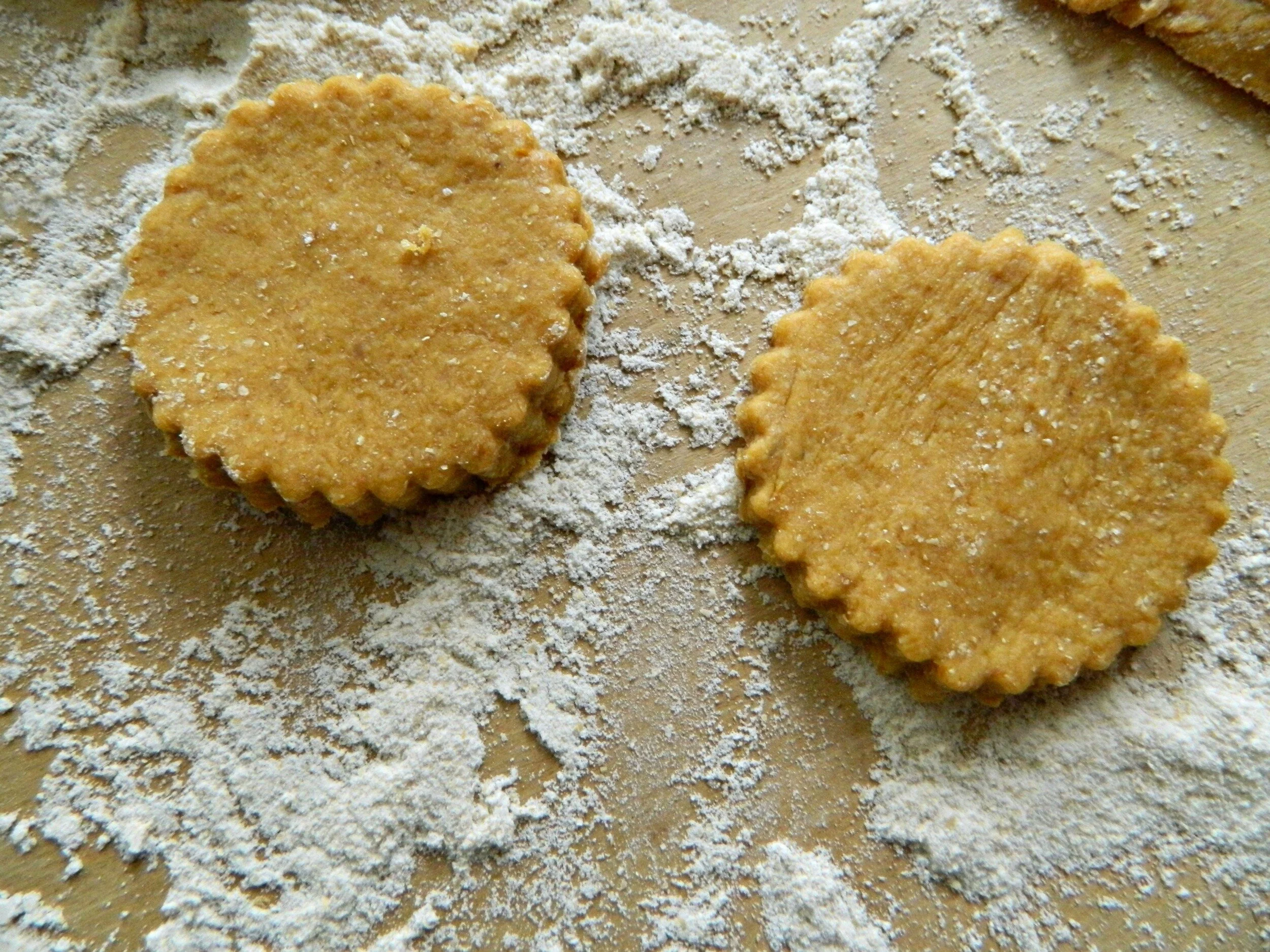 On a well-floured surface, roll out the dough. I usually make my dough anywhere from 1/4 of an inch to 1/2 an inch thickness- it really is up to you. I use round biscuit cutters to cut out my treats, but you can use any shape/size of cookie cutter. You can also just skip the rolling and cutting, and separate the dough into little balls or strips then bake.
