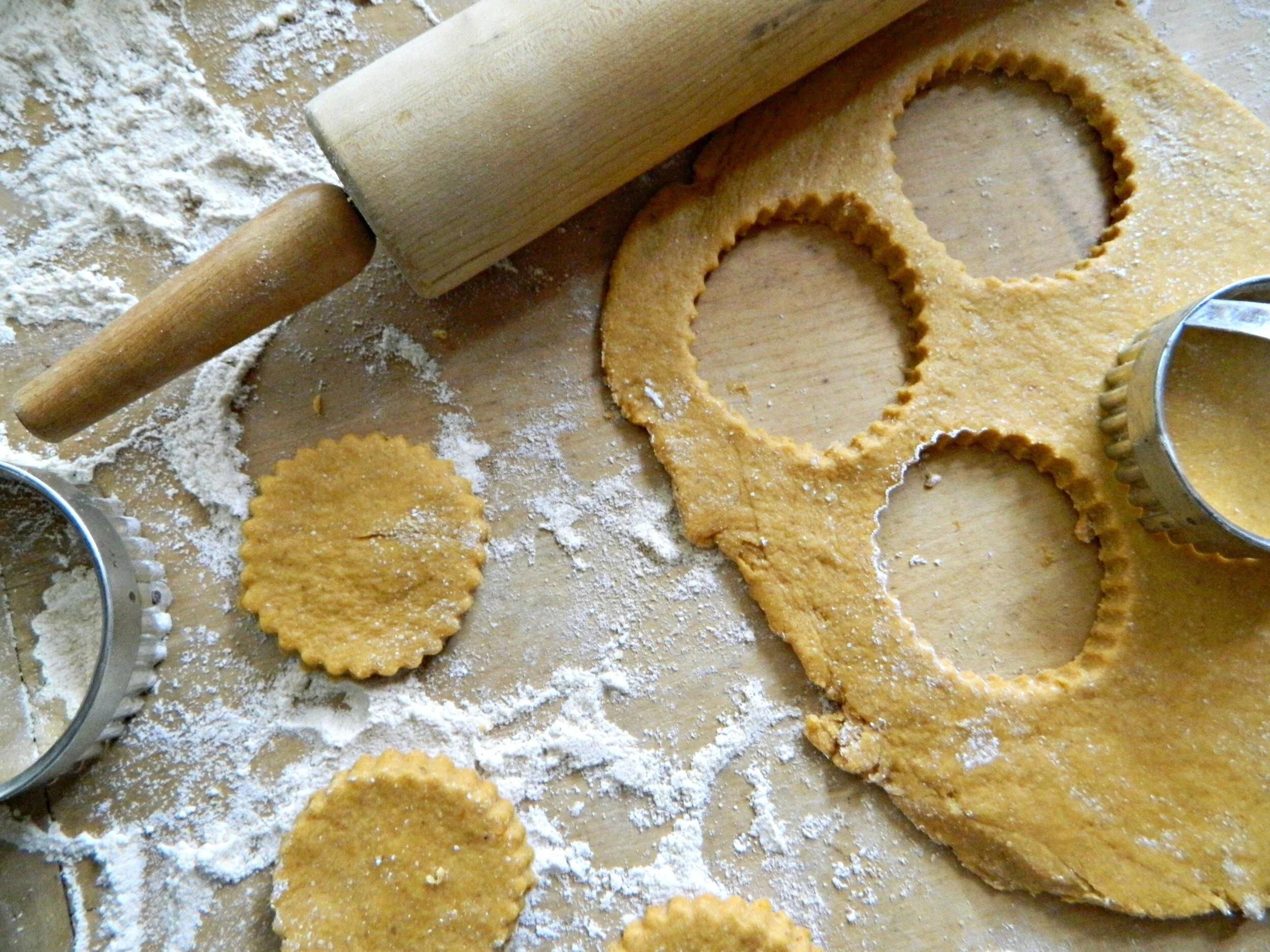 I usually cut out a few different sizes, some big and some small. When you've cut out all you can, roll the remaining scraps into a ball, roll it out with the rolling pin again, and cut some more. Keep repeating until you've used all you dough- it makes quite a few treats! I usually have at least 2 cookie sheets full!