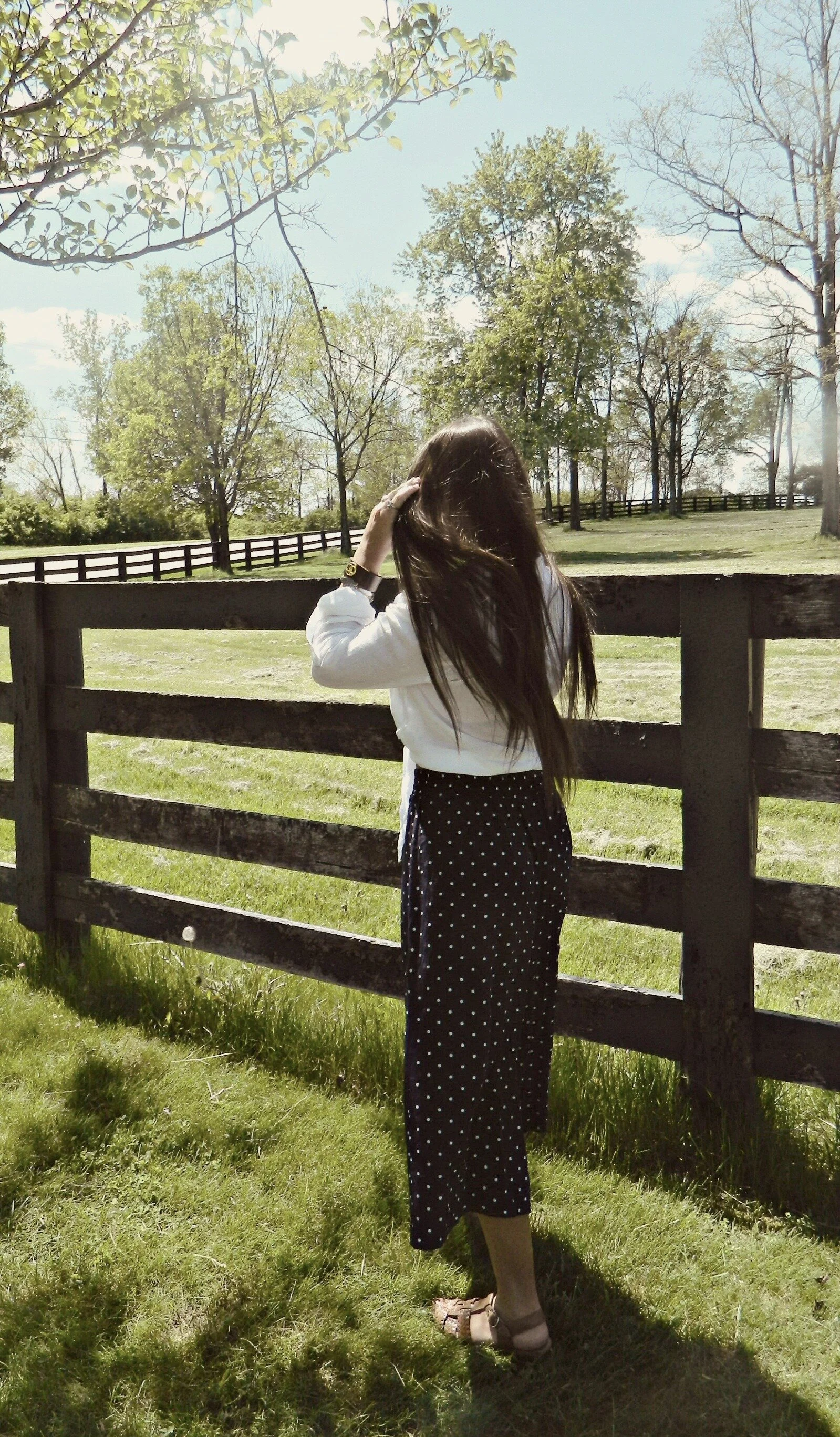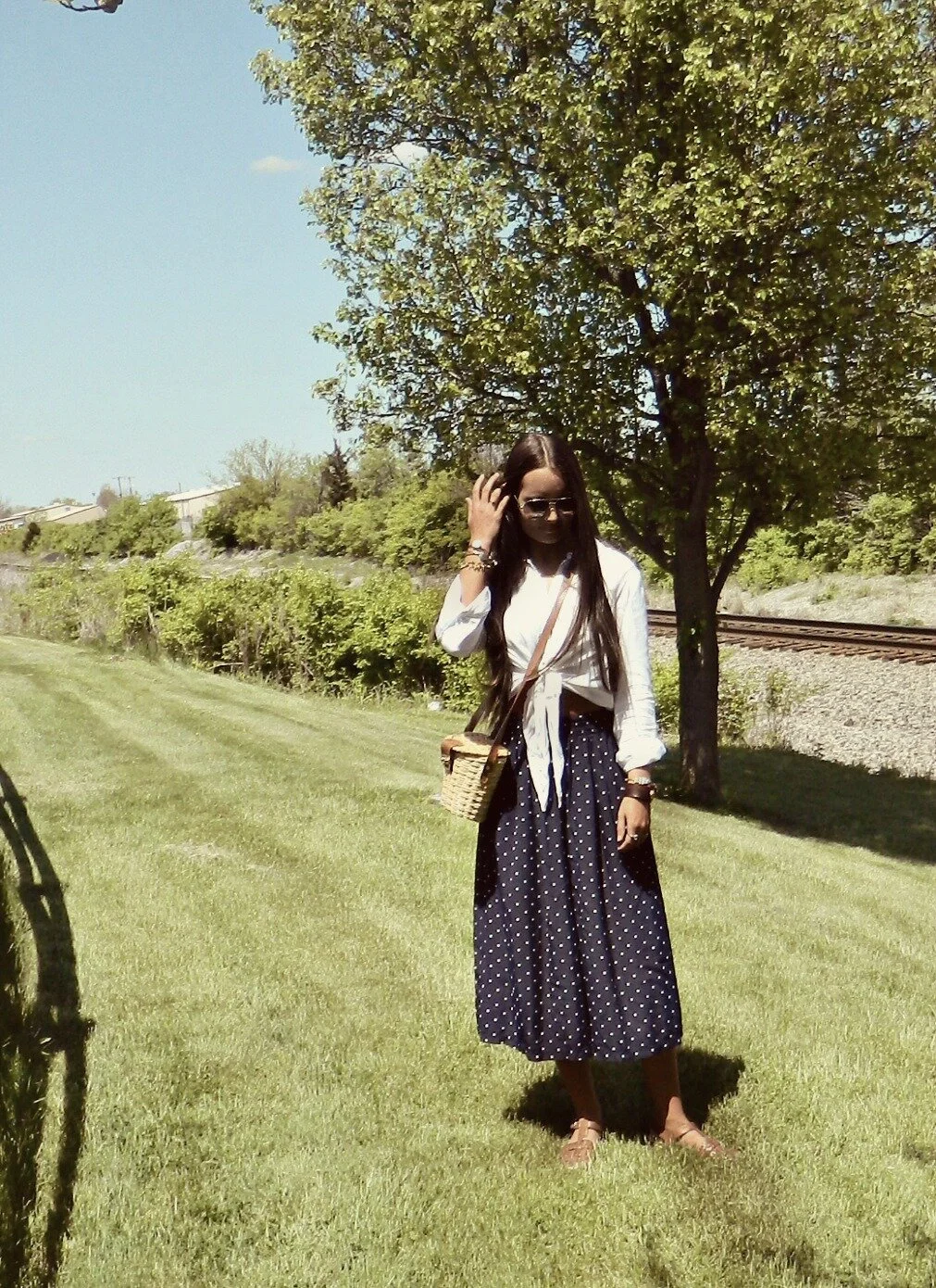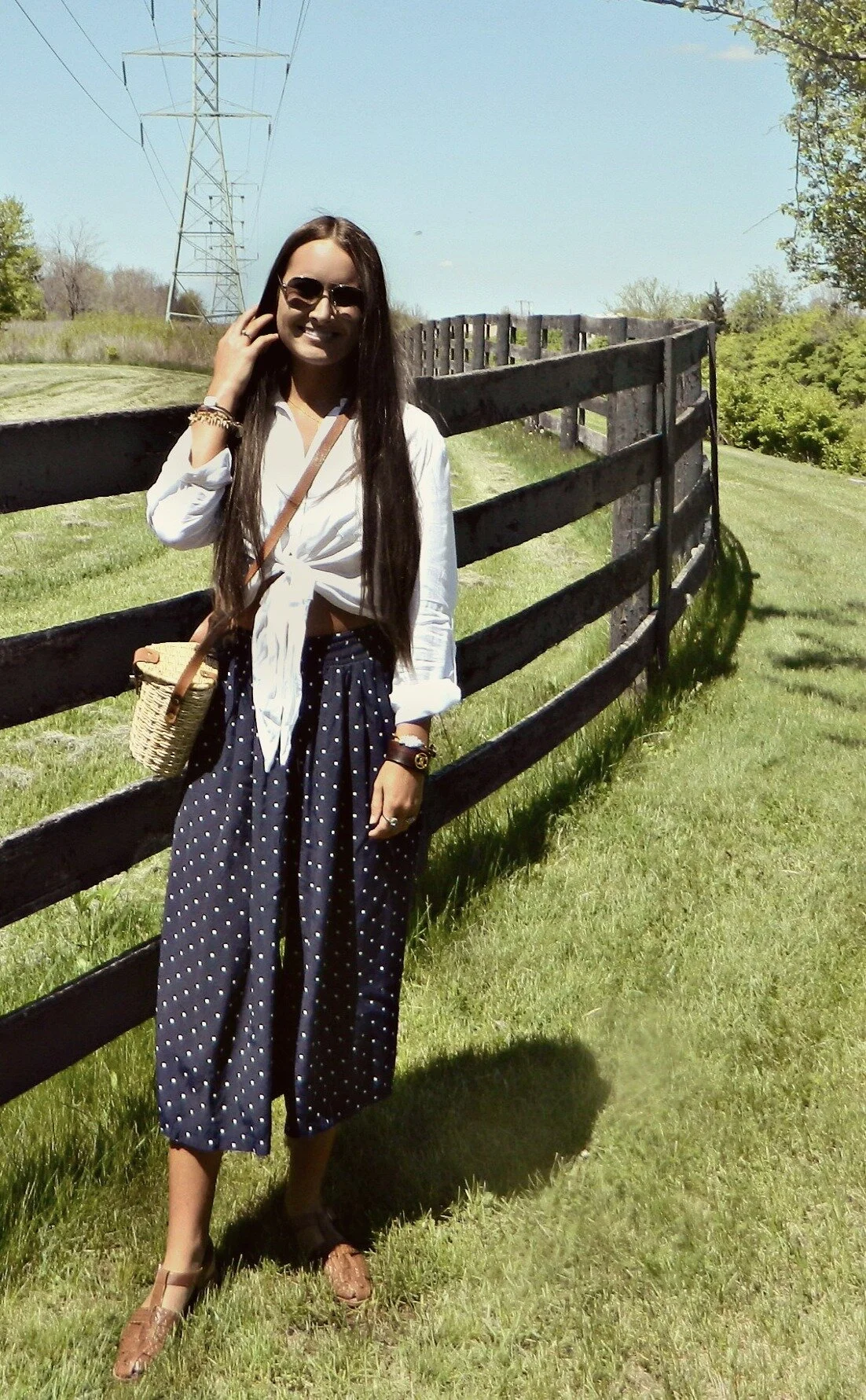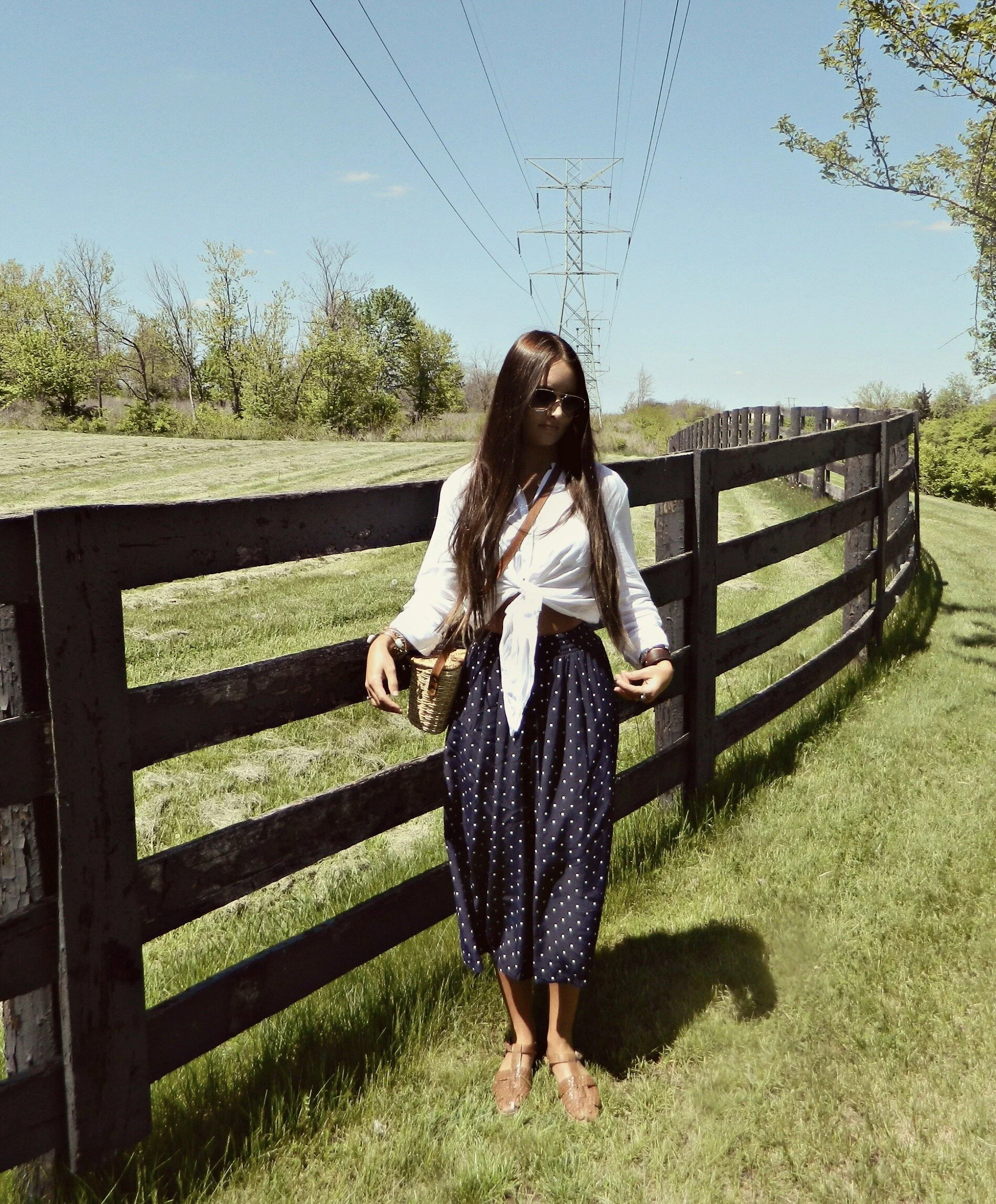 You may be shocked to hear that culottes are indeed "cool" again. I'm all for any kind of flowy pant, so I'm ready to jump in and try the trend. I've been able to find a few pairs while thrifting, and these polka dot ones are probably my favorites. They look adorable with just a simple t-shirt or crop top, but also with a dressier blouse or jacket. The silhouette is also super flattering (and comfortable!). This pair with an elastic waist allows you to wear them high-waisted or lower depending on what's most complimentary to your shape! Keep in mind the proportions and go for a more fitted or cropped top to offset the flowiness of the culottes. I think the key to wearing these is to go for a more laid-back look overall. For a day out to lunch and the farmer's market, I paired them with a simple white blouse, woven sandals, and wicker purse.