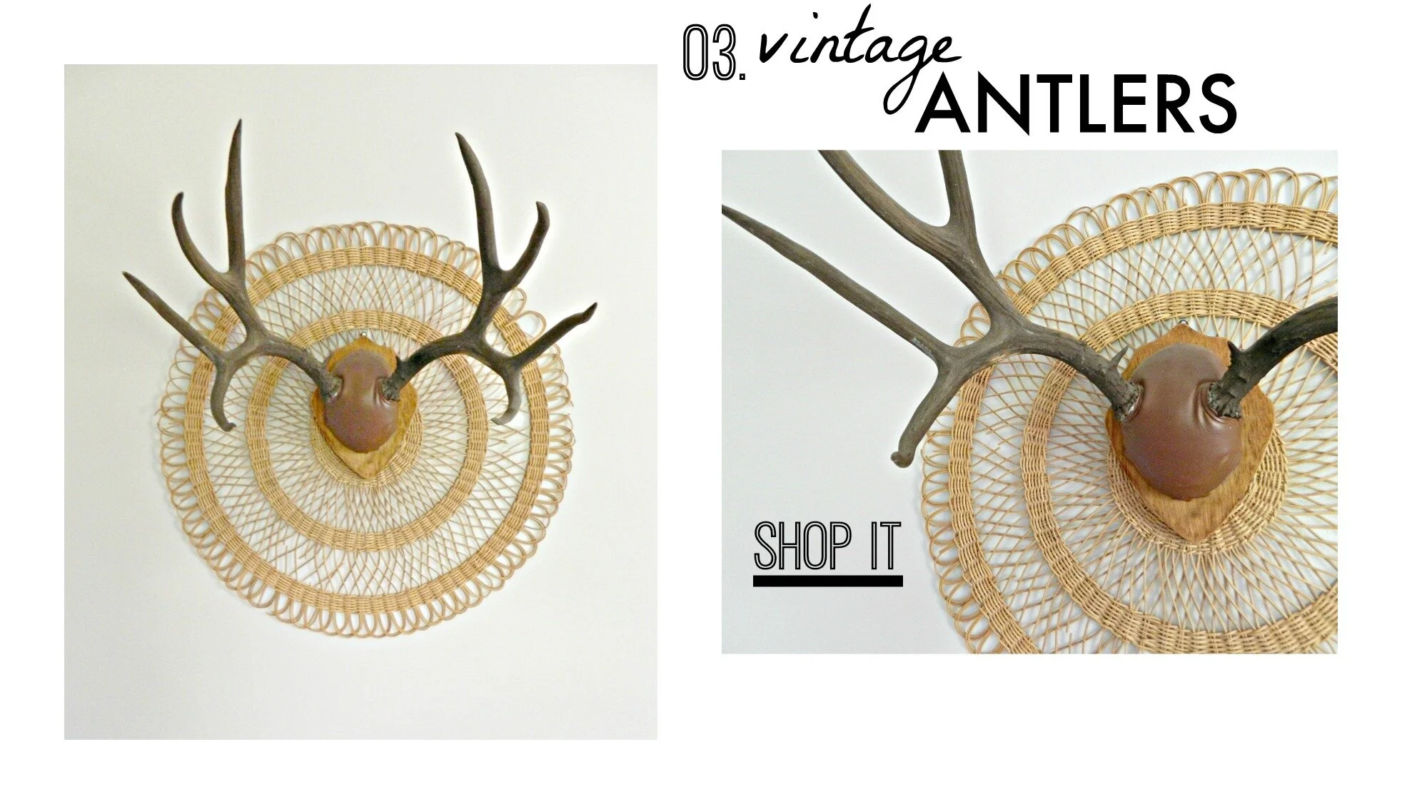 These stunning vintage antlers are another estate sale find. I was able to snag two mounted antlers from this same estate sale (one of which I just had to keep!). I love the leather and wood mount on this one and especially the gorgeous dark gray/brown tone of the antlers. It is so rare to find vintage mounted antlers in such good shape. These are from the 50's and even have the date written in pencil on the back of the wood! You can shop them now here.