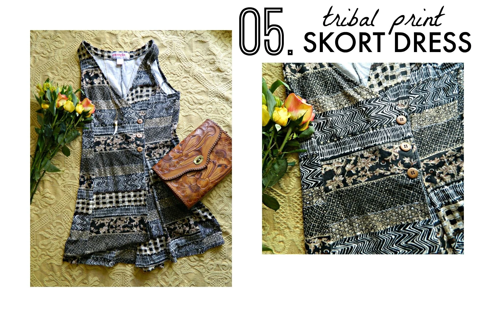 I love the bohemian vibe of this summery 90's tribal print dress I found while out thrifiting. It has a unique wrap silhouette and is also a skort on the bottom! It is super flattering on and also so comfortable. I can see it paired with wedges and a clutch for dinner, or strappy sandals and a tote for daytime.