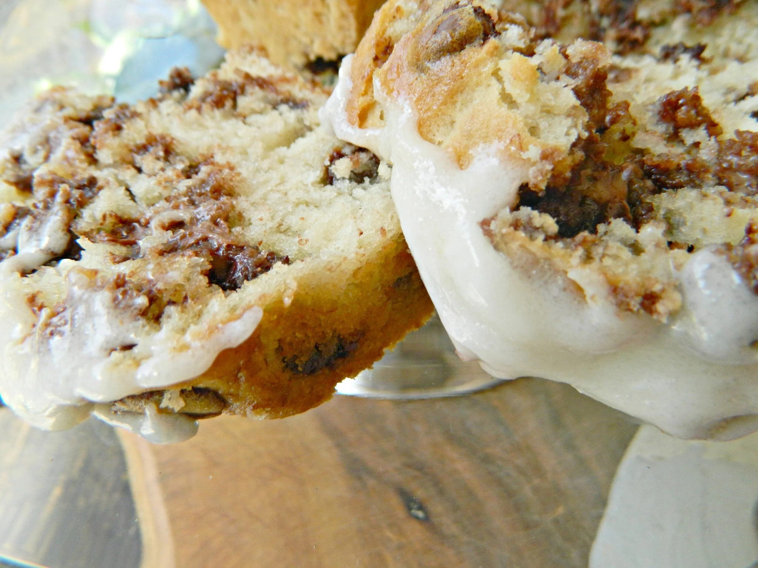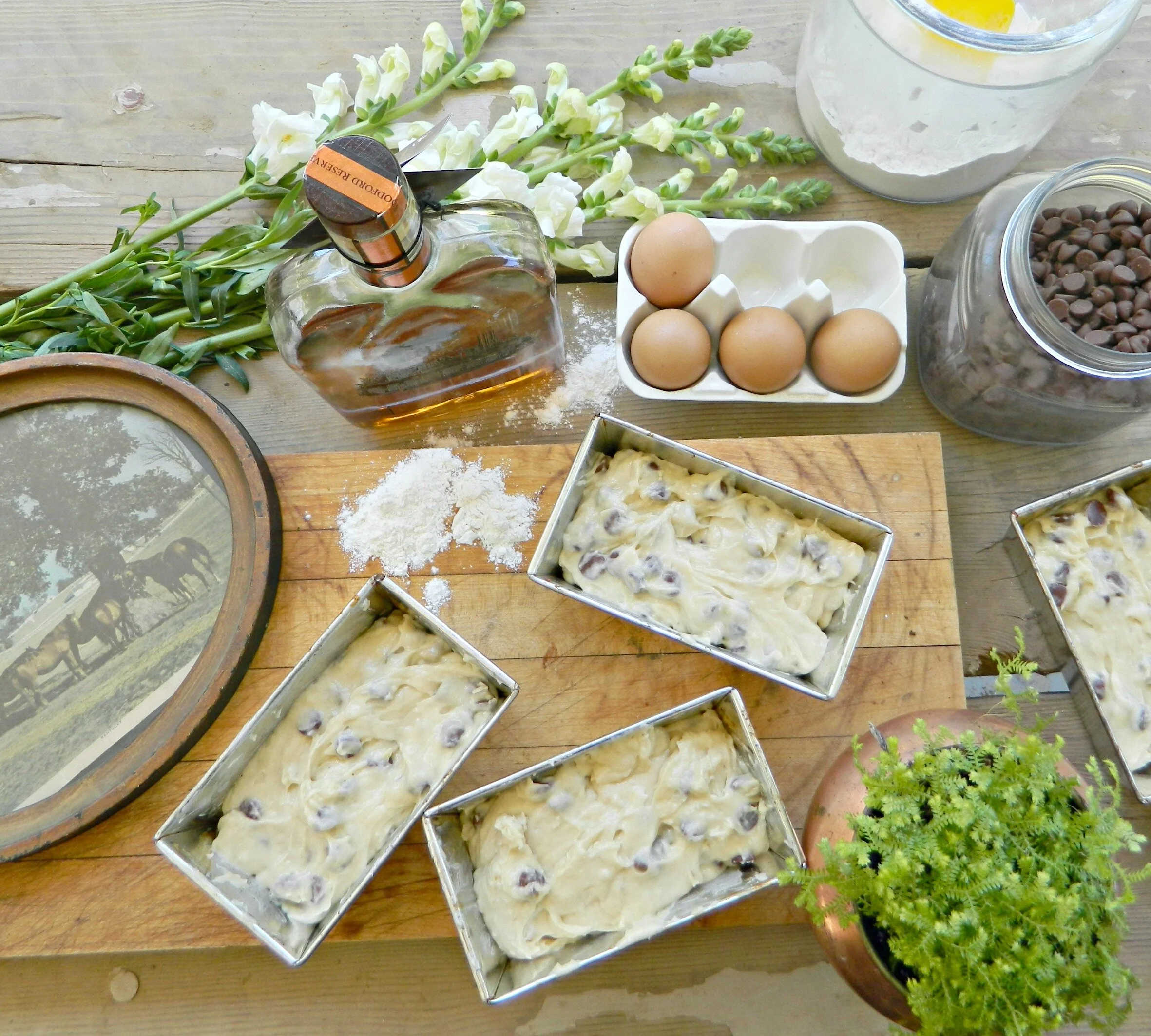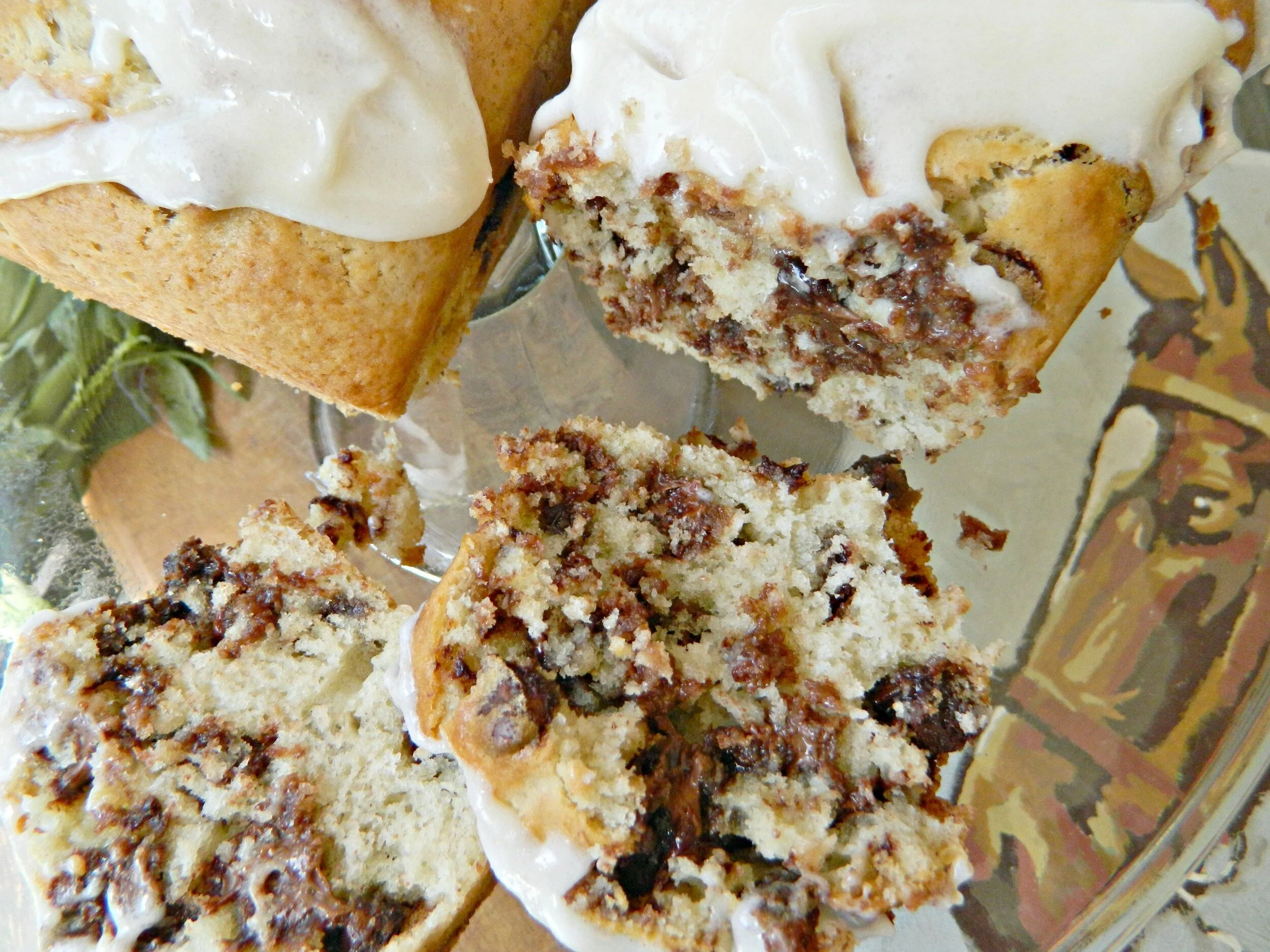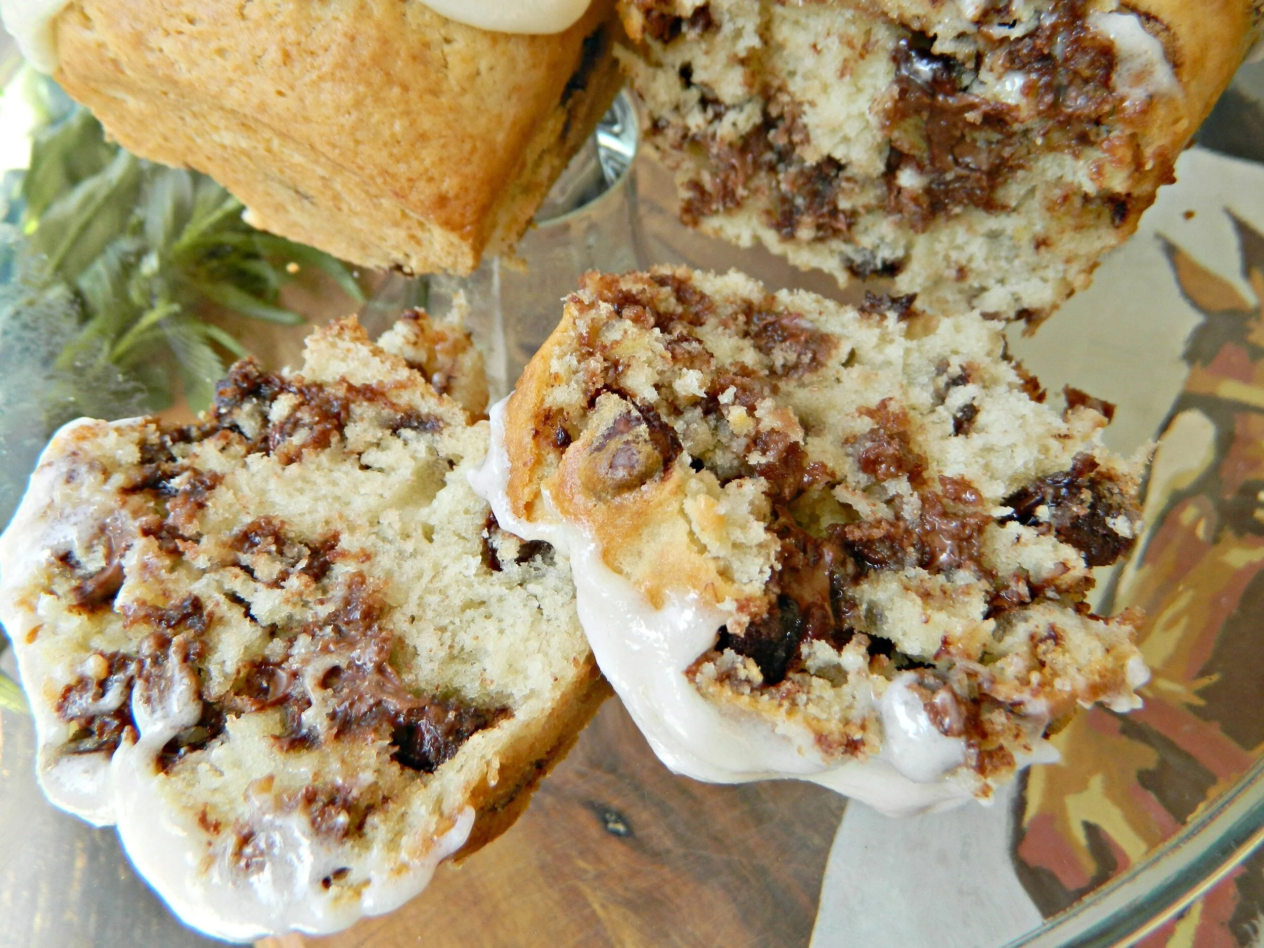 After your breads are finished baking let them cool 10 minutes before your drizzling or spreading your glaze on the top. I prefer using the mini loaf pans because the breads get crispy on the edges but are still so moist and melty inside, especially with the warm chocolate chips! Enjoy a warm slice with a tall glass of cold milk!