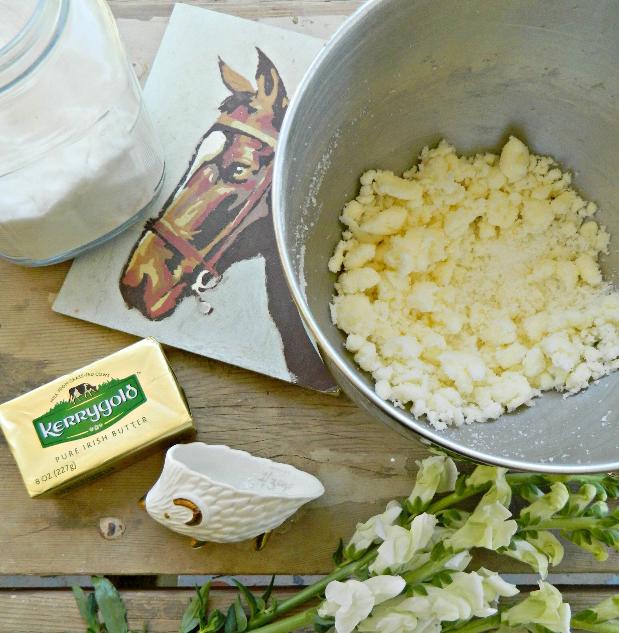 Begin by preheating your oven to 350 degrees. First mix your dry ingredients together in a large bowl: flour, baking powder, and salt; set aside. In a stand mixer (or you can use a hand mixer and separate bowl), cream together your butter and sugar.