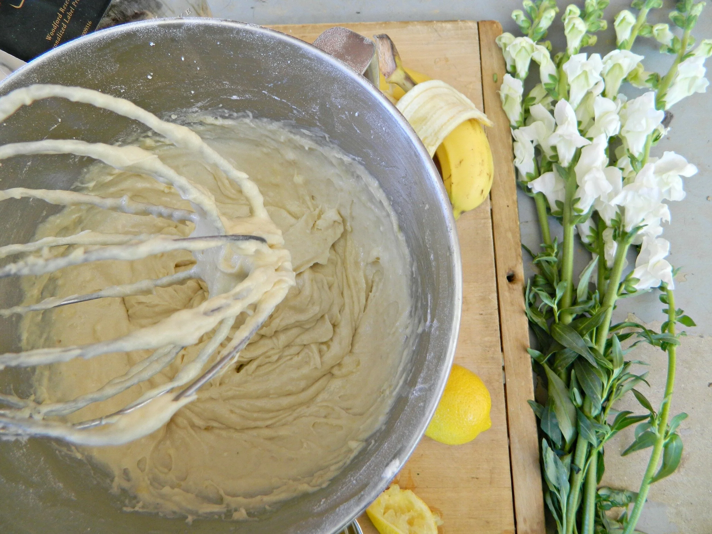 Now add your wet ingredients to your butter/sugar mixture. Add in your eggs (one at a time) and mix to combine. Next add your bourbon, bananas, and lemon juice and continue mixing until you have a smooth, creamy batter.