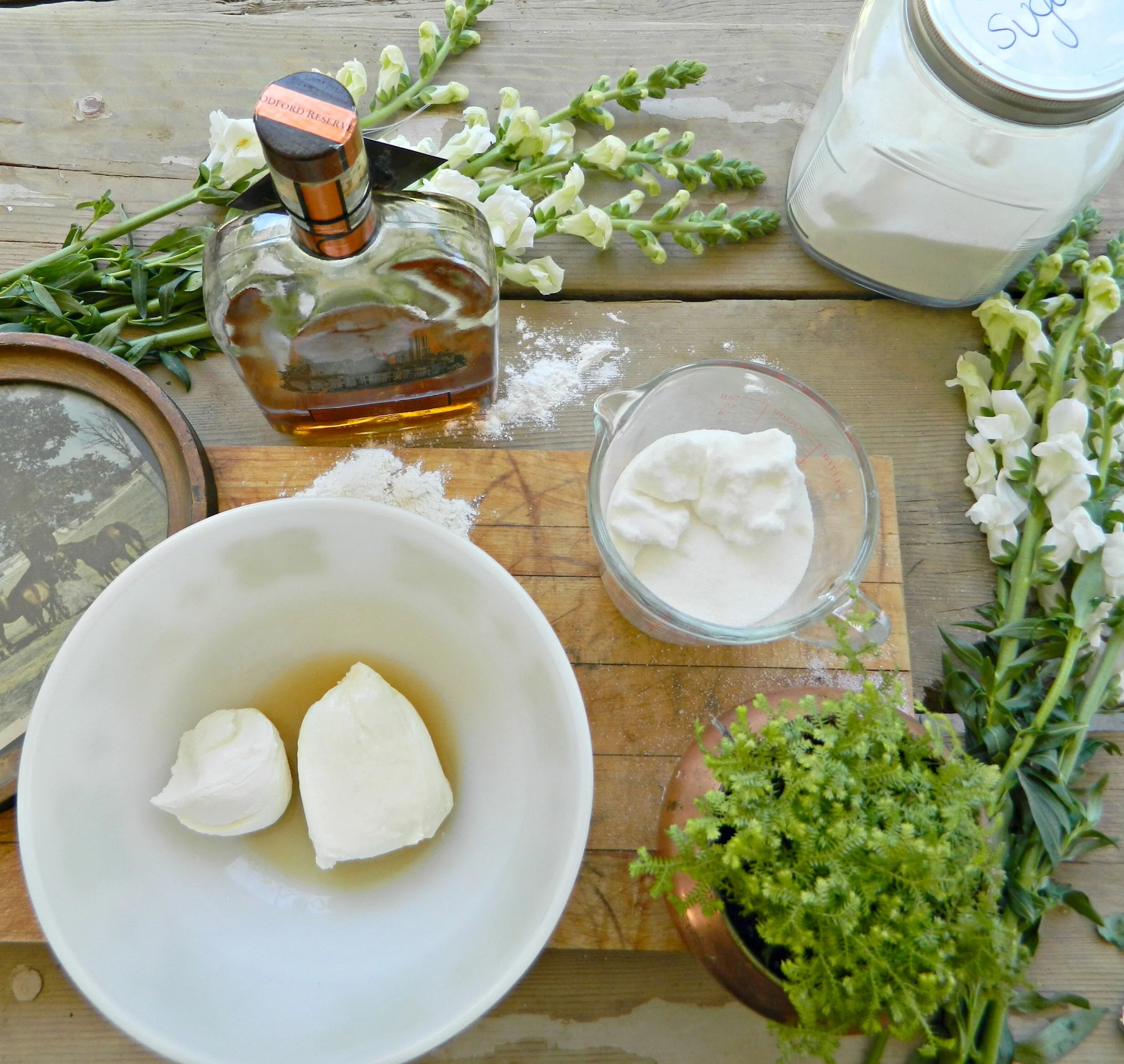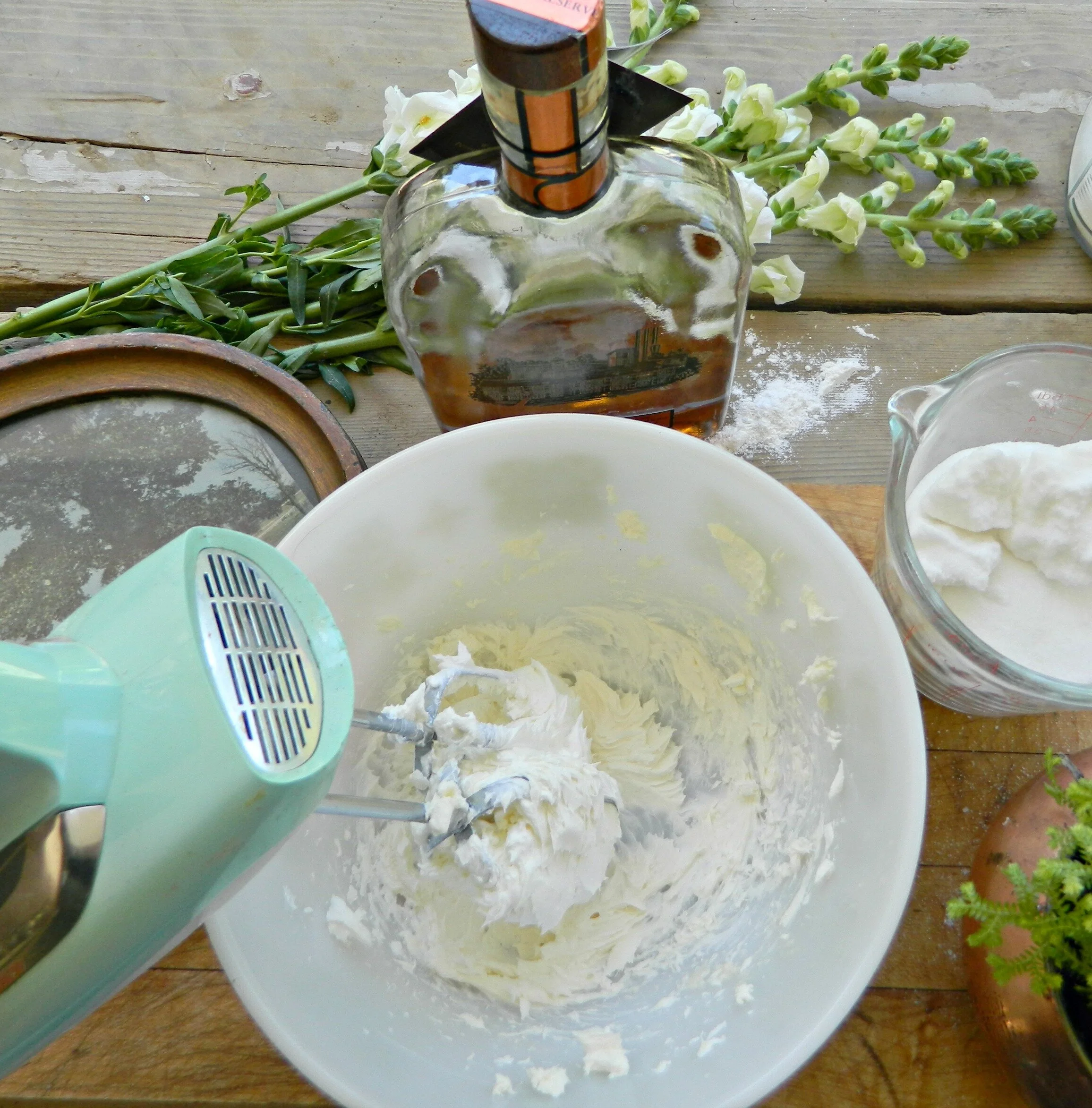 You only need three ingredients for the glaze: sugar, cream cheese, and MORE bourbon! Just put all your ingredients together in a bowl and use a hand mixer to cream everything together until light and fluffy.