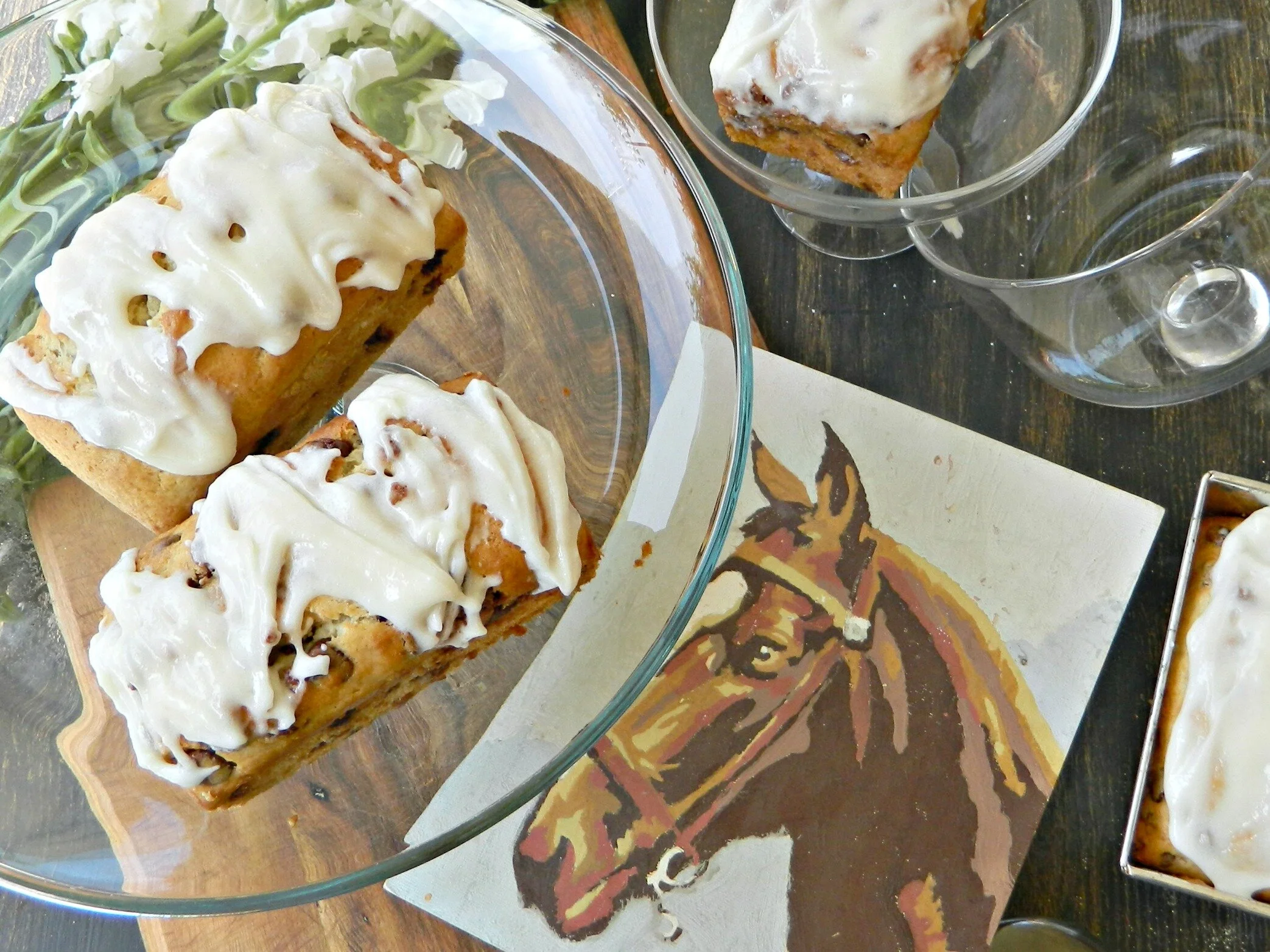 Bake in the oven at 350 for 45-60 minutes. If you use small loaf pans like I did, it will take less time (about 35-40 minutes). The tops should be golden brown and an inserted toothpick should come out clean of any batter. Now you can make the cream cheese glaze.