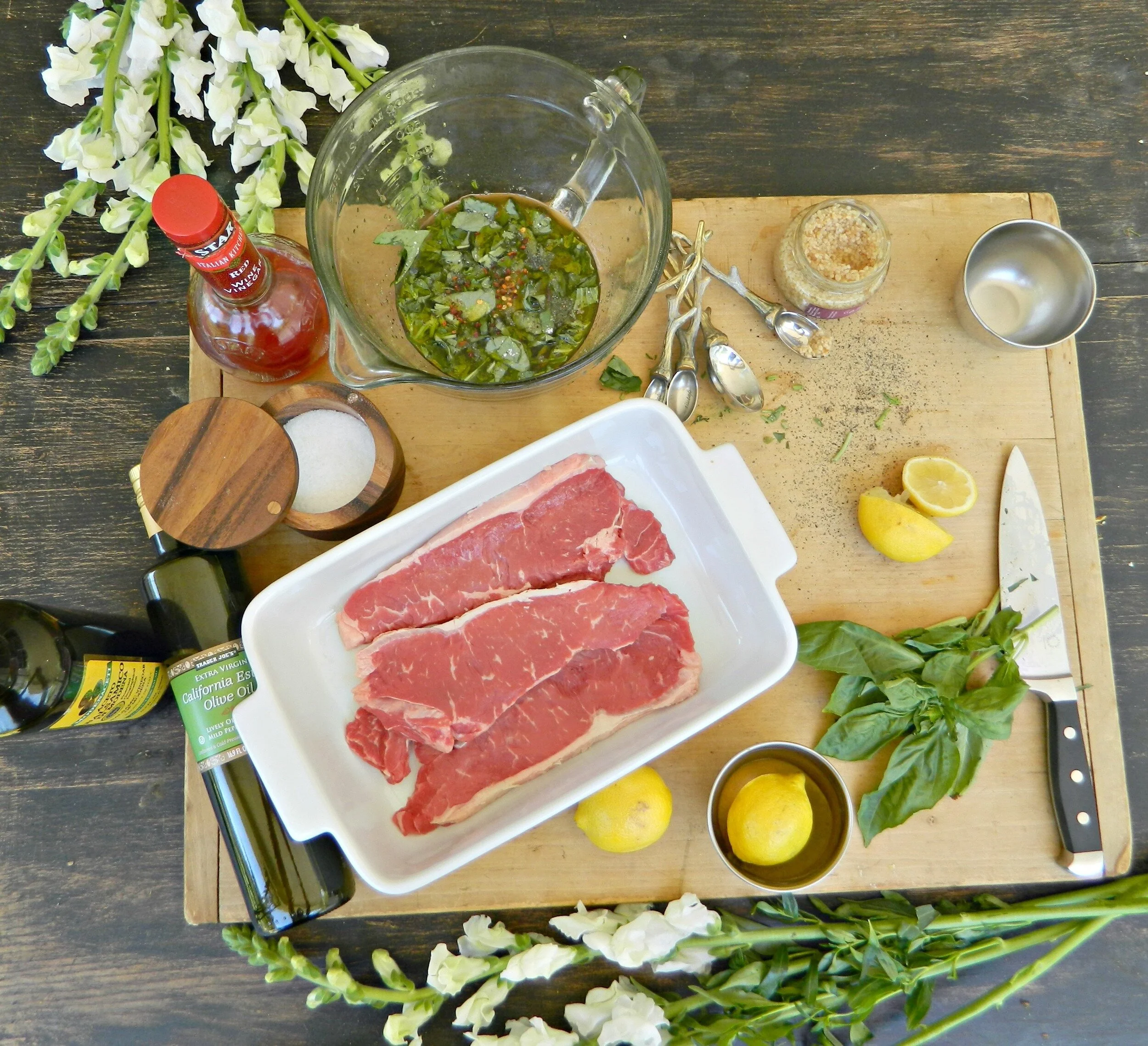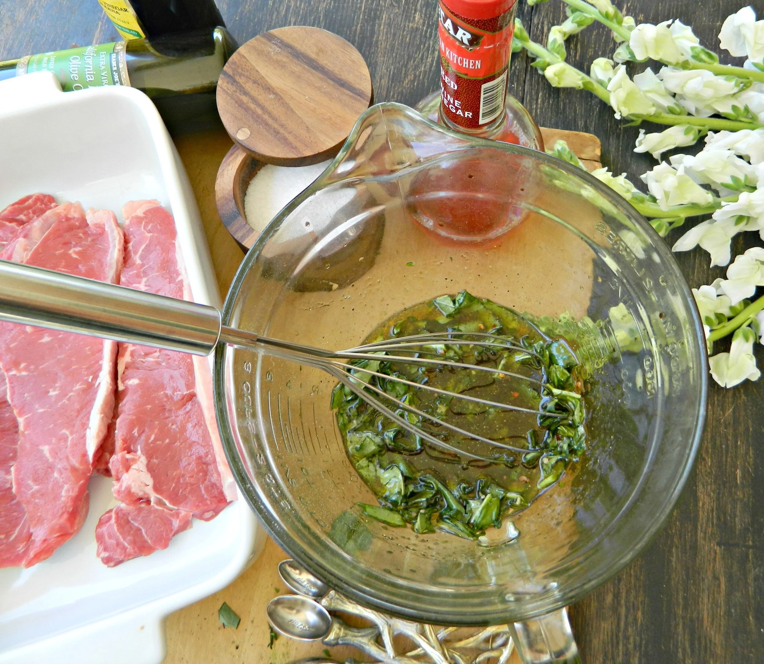 Whisk all the marinade ingredients together in a bowl. Place the steak in a baking dish and pour the marinade over the top. Cover and place in the refrigerator for anywhere from 4-24 hours to marinate. I marinated mine for about 6 hours and it was very tender and flavorful.