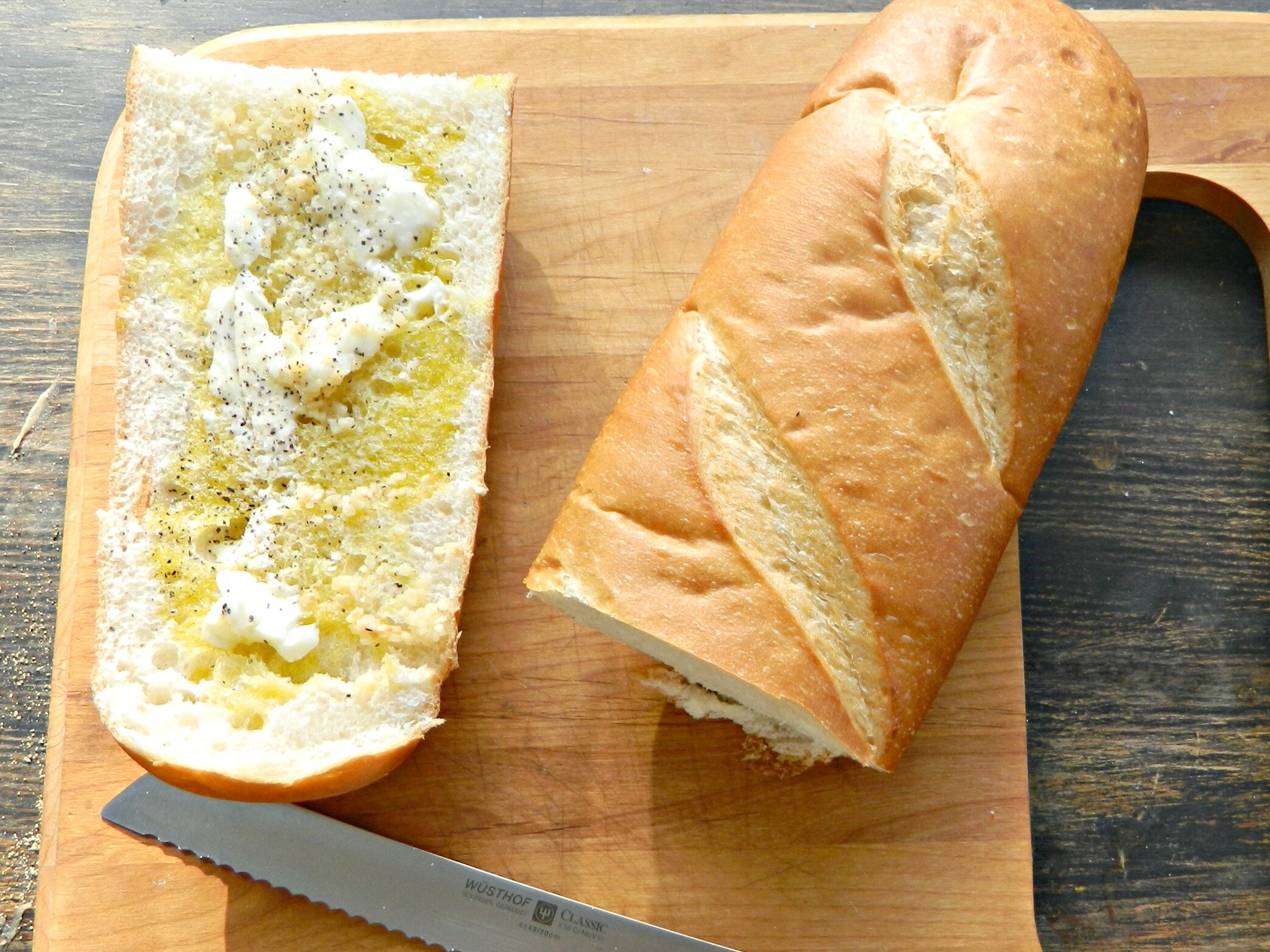 Now you can start your garlic bread before you begin assembling the rest of the salad. Put your oven on broil. Take some crusty French bread and cut it into thick slices. Spread each slice with some butter and drizzle with olive oil. I also sprinkled it with salt and pepper, and rubbed in 1/2 teaspoon of minced garlic per slice. Place on a baking sheet and put in the oven for a few minutes until toasted.