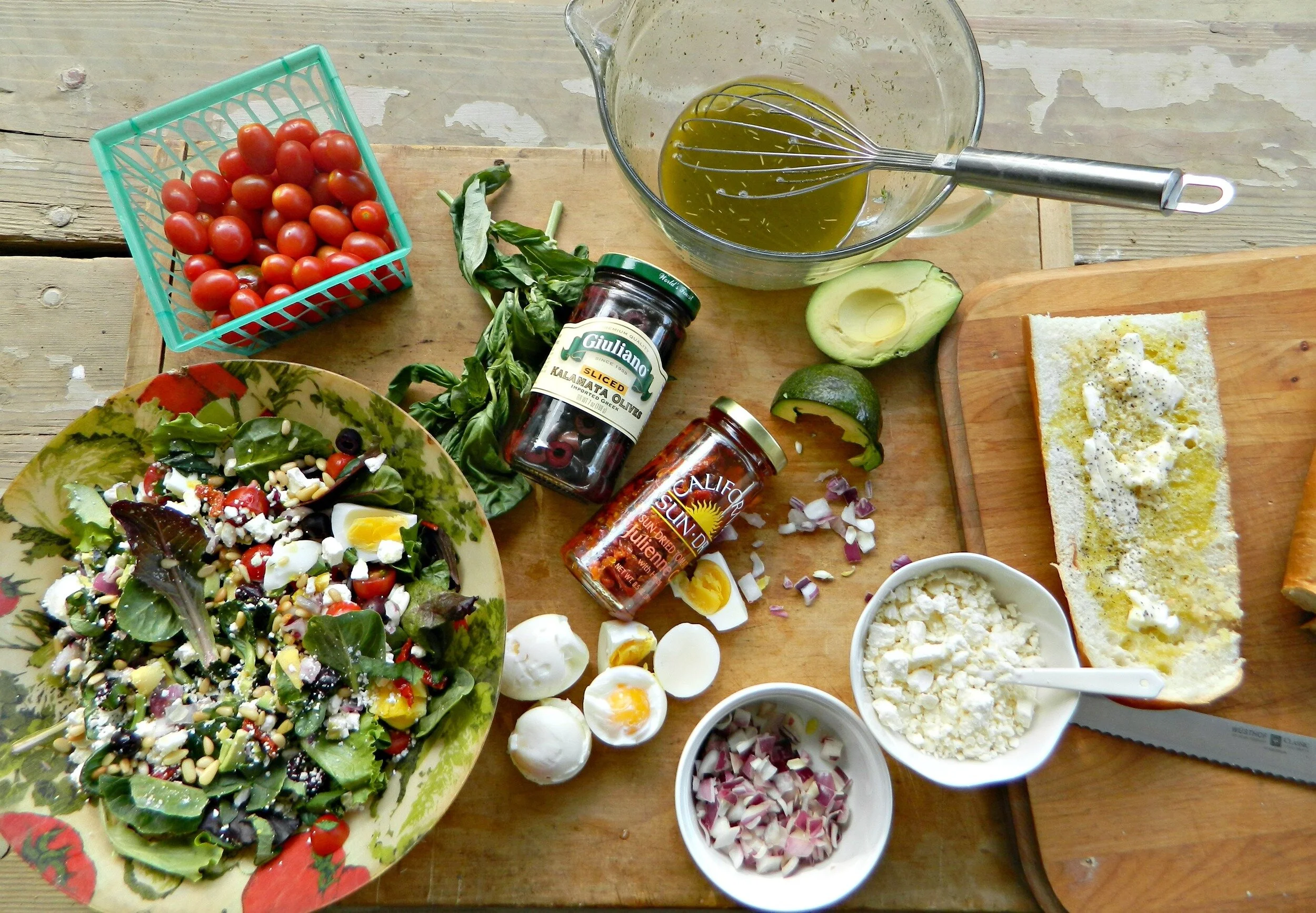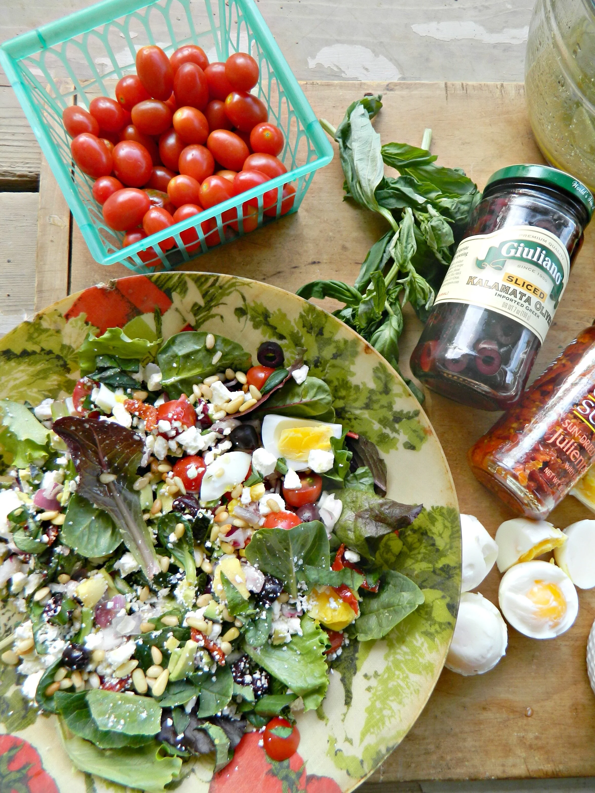 Now you can toss all your salad ingredients together in a large bowl. Here are the ingredients we used, but you can feel free to add or eliminate any of them: