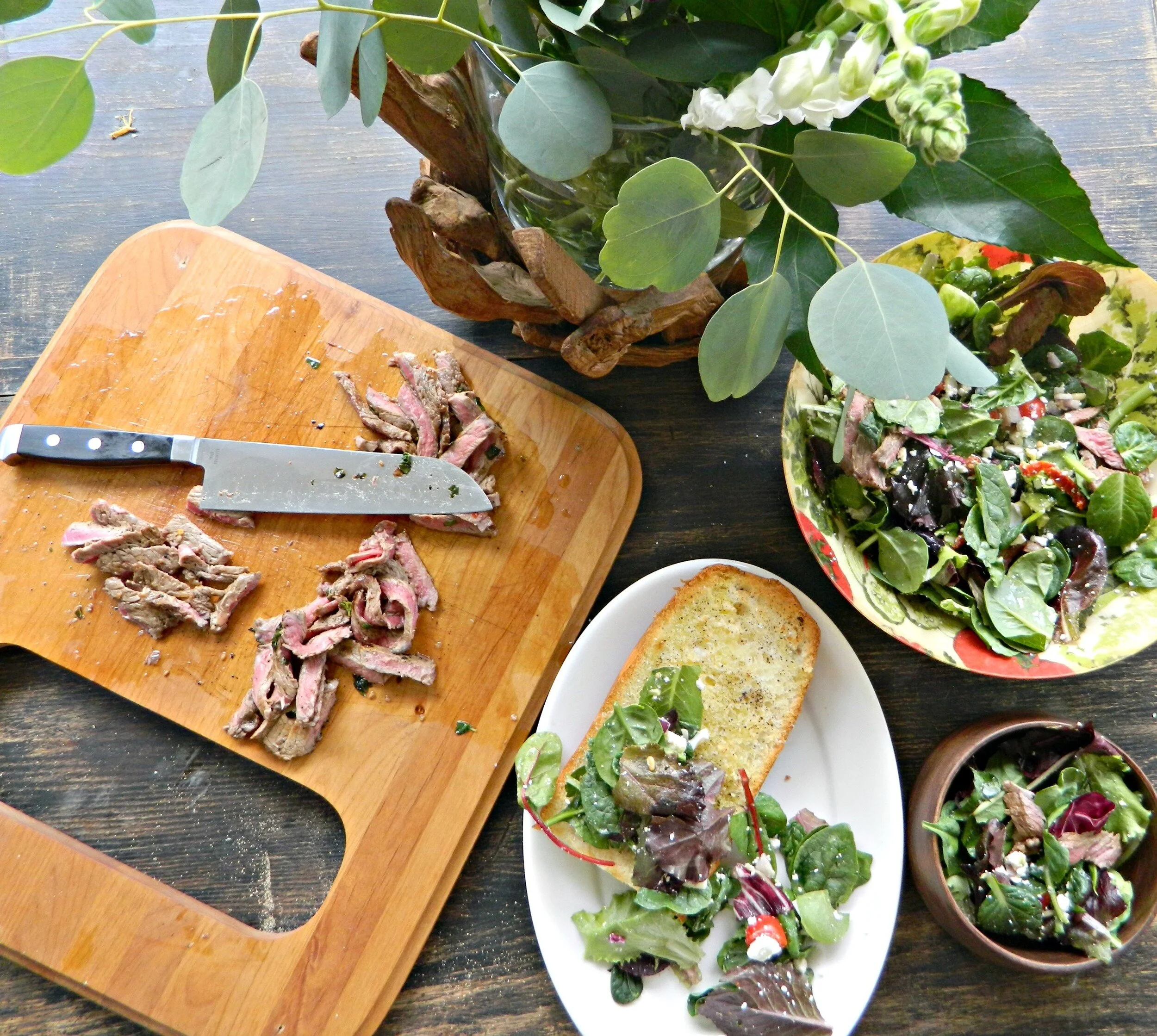 Add your steak and toss everything with your desired amount of dressing. You can serve your salad on top of the garlic toast or put it on the side- it adds the perfect amount of crunch to the salad! This salad would also be delicious with chicken instead of steak and you could easily use the same marinade. I hope you enjoy this phenomenal salad as much as we do- don't be afraid to make it your own by trying some new ingredients or seasonings!