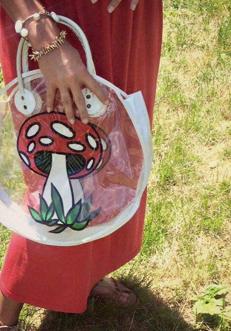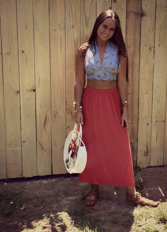 Vintage halter top: Street Scene Vintage; Red cotton maxi skirt: thrifted; Lace-up sandals: TJMaxx (from last year); Vintage mushroom purse: Thrifted; Jewels: Stella + Dot, Bourbon and Boweties