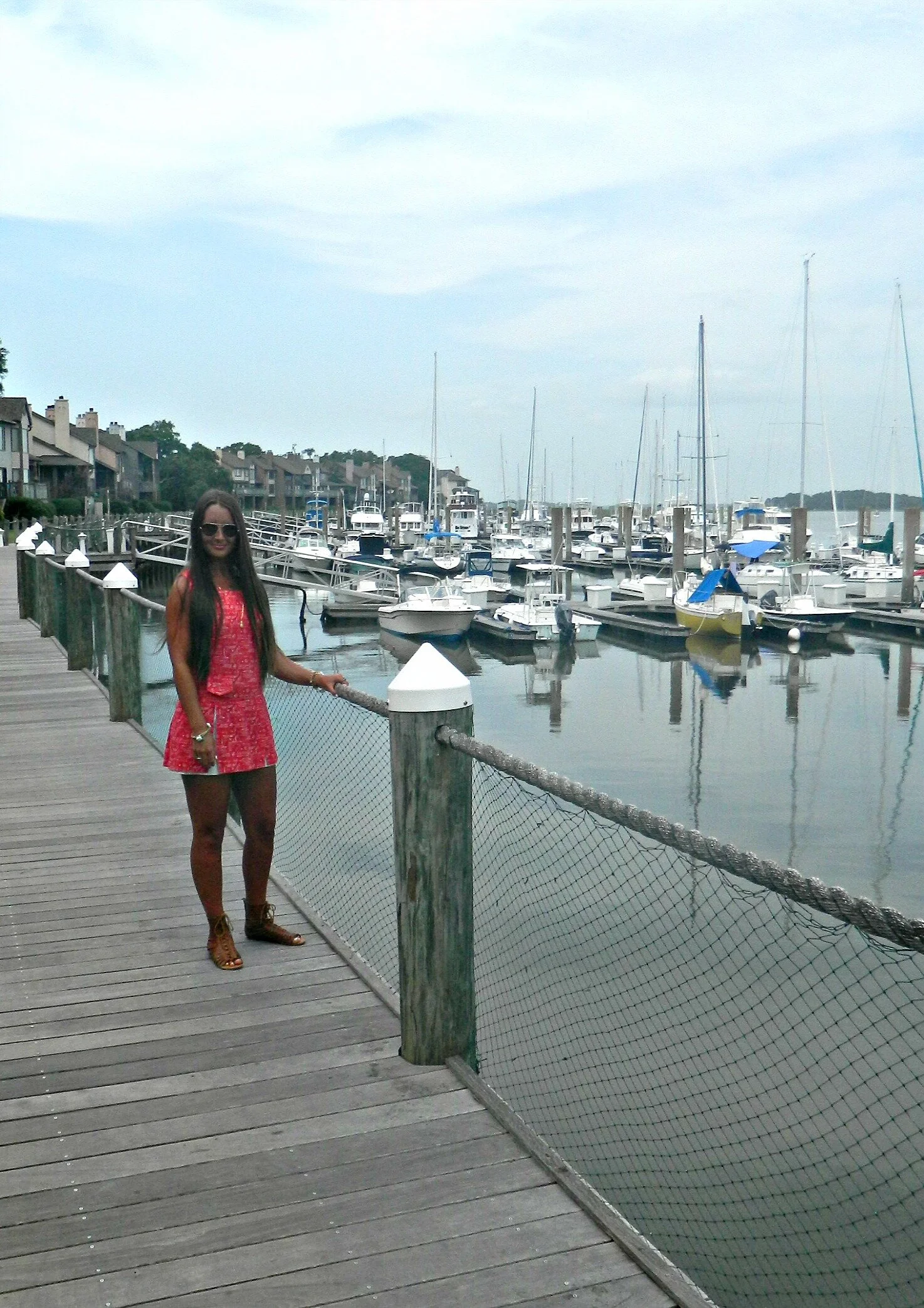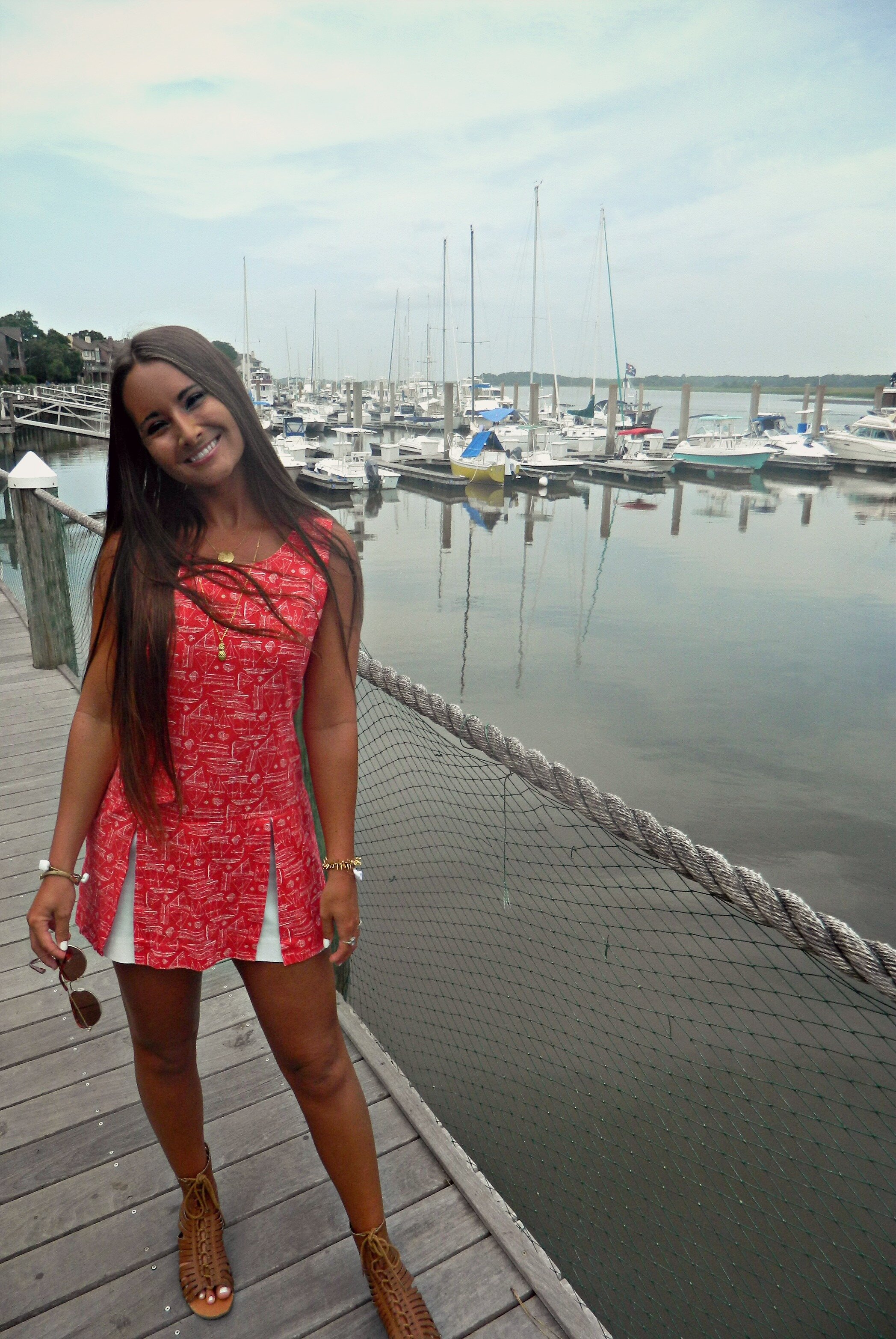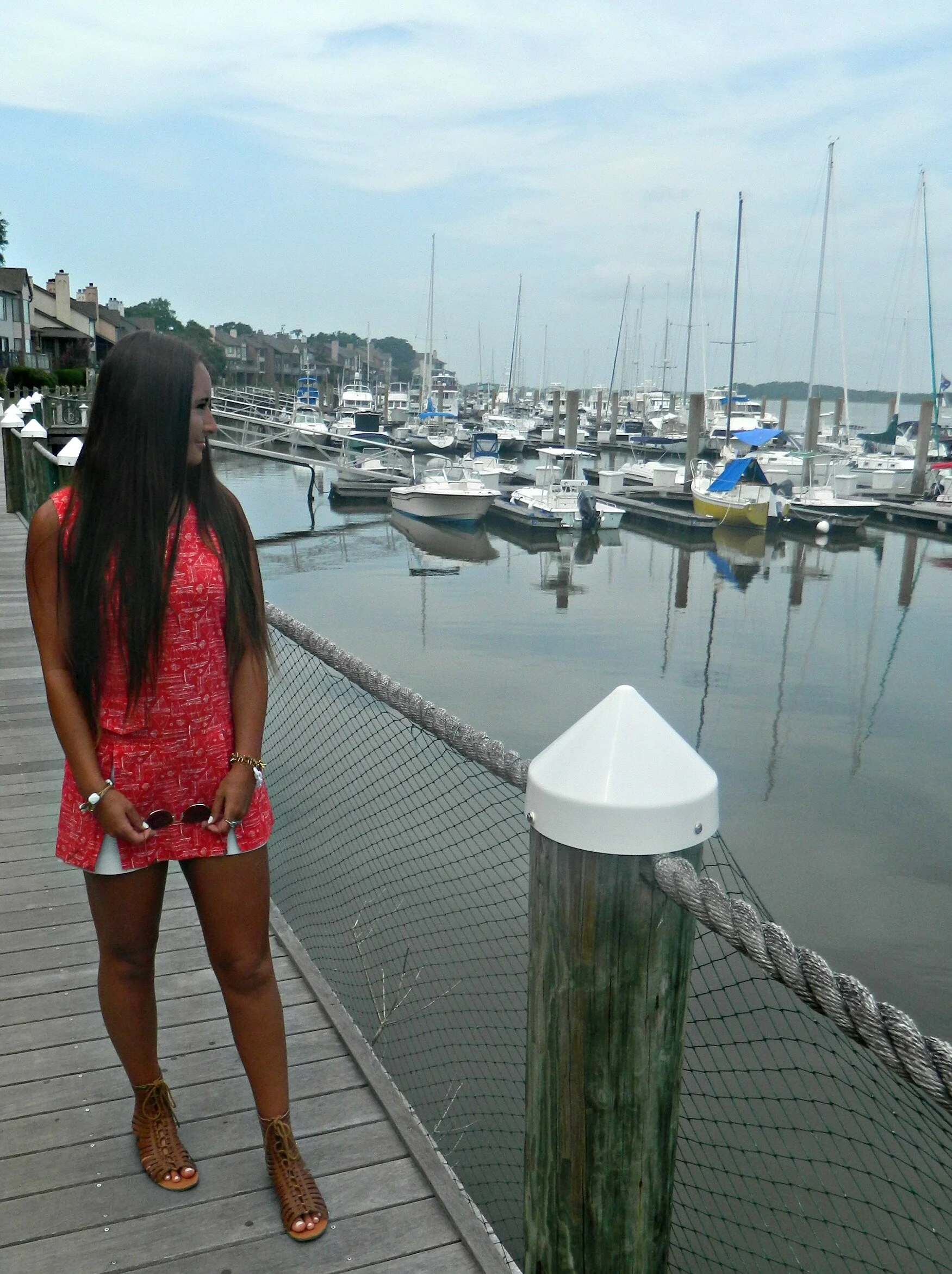 Nothing screams summertime like a cute nautical print! Nautical truly never goes out of style and has been a popular trend in just about every decade. When a spotted this adorable sailboat jumper years ago while working at Street Scene Vintage, I knew it was made for me! Thank goodness it fit perfectly and still is one of my favorite vintage pieces years later. It has a little pocket on the front and shorts underneath that are hidden by the split skirt (Hurry- there is even an identical one in blue now for sale on Etsy!). Rompers are one of my favorite styles to wear in the summer because they always have that vintage flair and are the perfect casual piece for everyday wear. I topped off the look with my favorite lace-up sandals and some layered necklaces: a sweet dainty, pineapple charm necklace from local Stella Bella boutique and my monogram charm necklace from Stella and Dot.