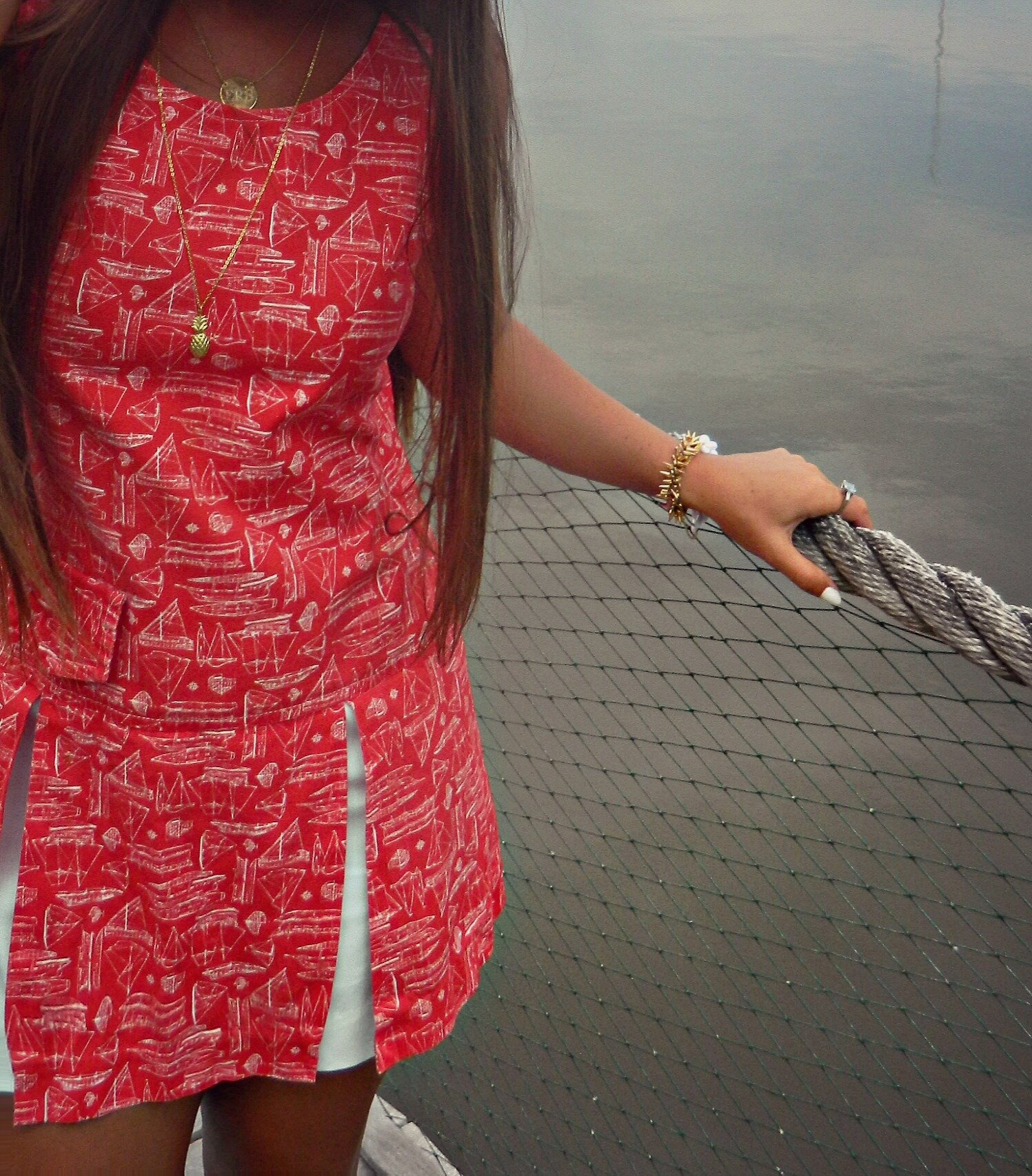 Sailboat jumper: Street Scene Vintage | Pineapple charm necklace: Stella Bella Boutique (from last summer) | Monogram disc charm necklace: Stella + Dot | Gladiator lace-up sandals: TJMaxx | Bracelets: Stella + Dot/ vintage/ Bourbon + Boweties