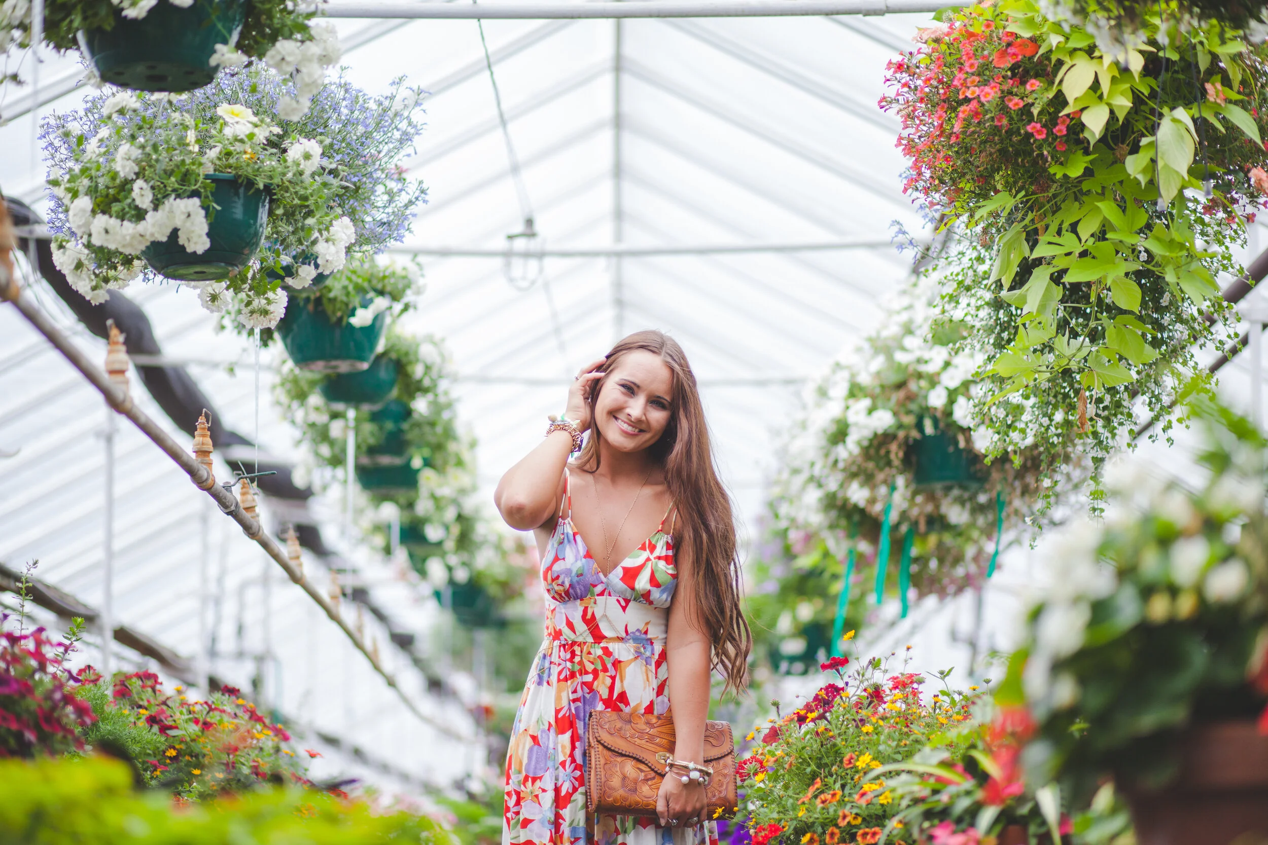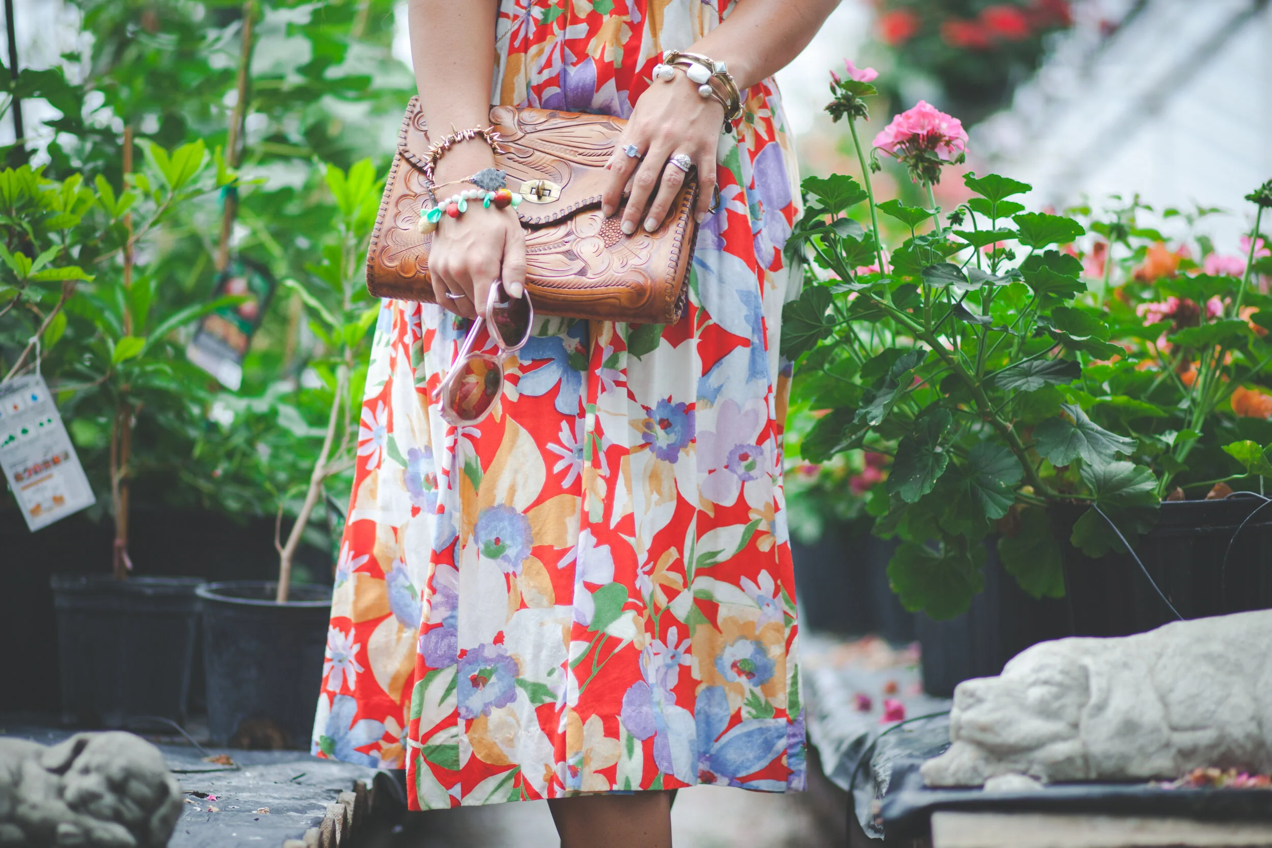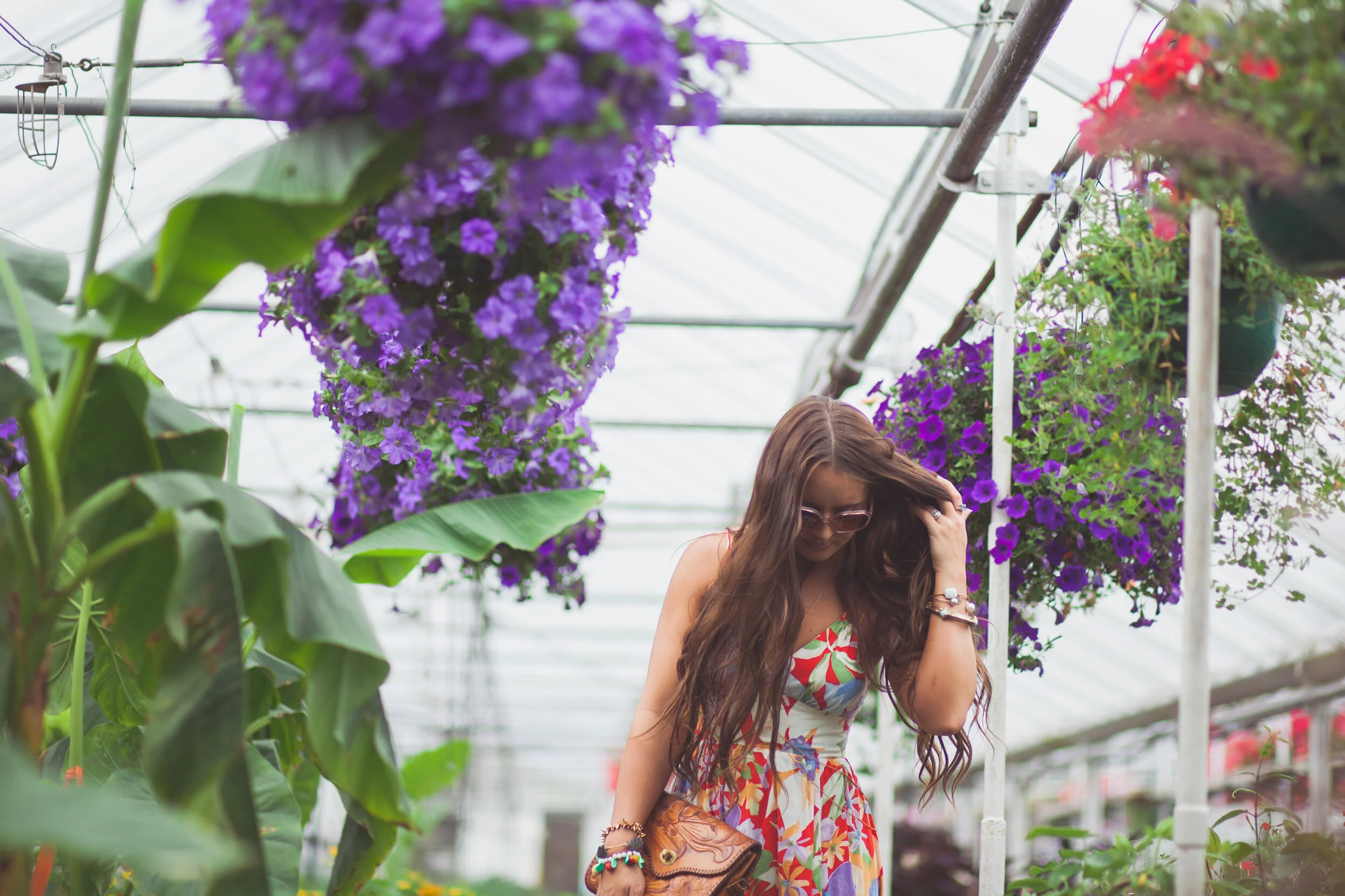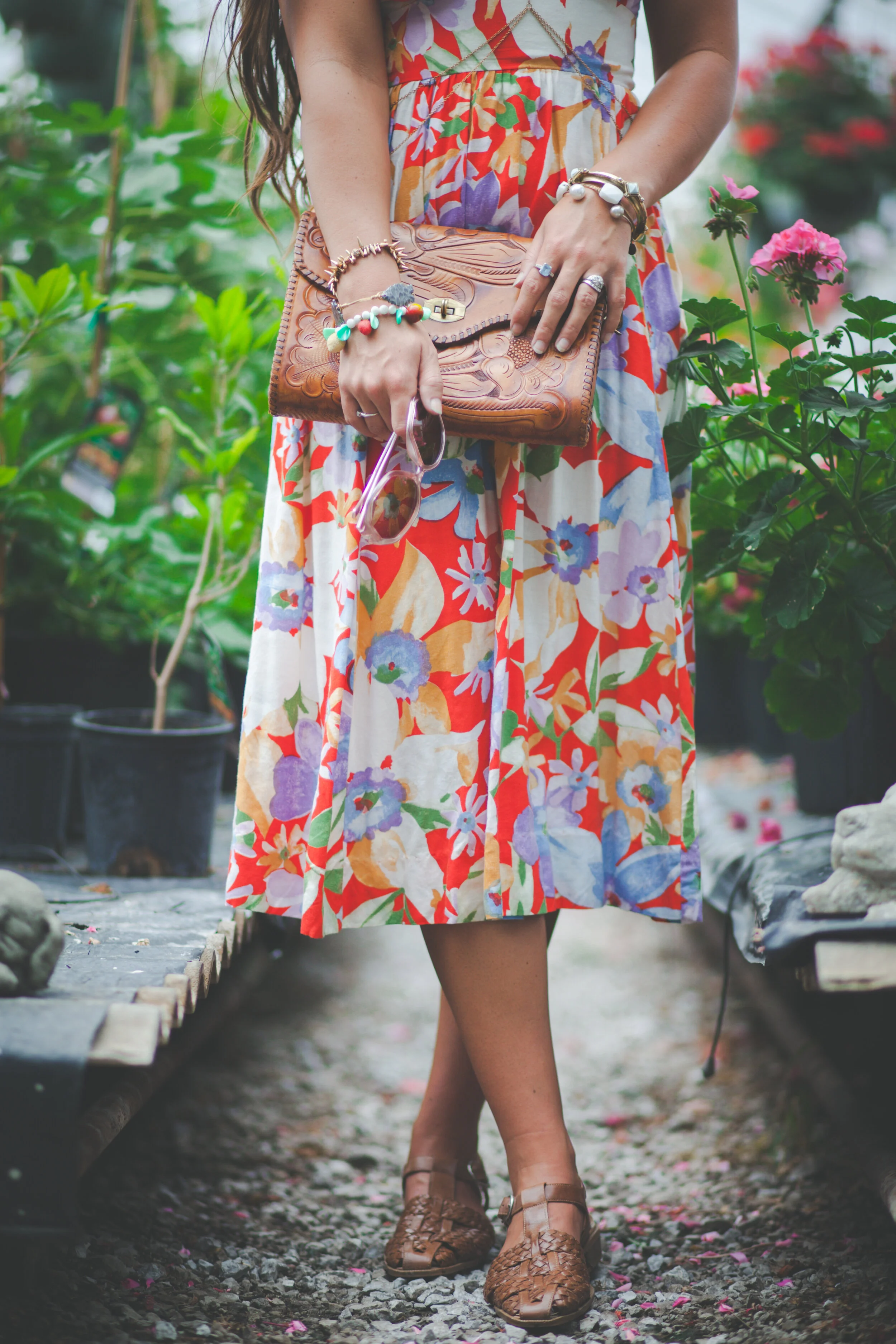 What's better than a floral on floral photoshoot? Getting to shoot inside one of my favorite hidden gems, Pemberton's Greenhouses, was just magical. Sarah Grashel Photography did such an amazing job as usual at capturing the entire space. My favorite vintage pieces or outfits always end up being those that people mistake for being brand new. It is so true that our trends are constantly being recycled from the past, and that's what makes wearing vintage so fun! All the main components of this outfit were found in thrift stores or garage sales. This amazing floral midi dress, that just happened to fit perfectly, was found at the thrift store for less than $5. I picked up this 60's tooled leather clutch years ago at an estate sale for a couple of dollars. This purse style has become really trendy again with the popularity of bohemian/festival styles lately. The woven leather flats I also found at the thrift store for a couple bucks, and I love the strappy, modern details. As always, I like to mix new elements in with the vintage. This body chain from Forever21 is the perfect way to add some edge to super sweet dresses, prints, or tops. It instantly makes any outfit look more modern and unique. I can't forget to mention my all-time favorite vintage milkglass fruit charm bracelet that just hapened to match the colors of the dress perfectly.