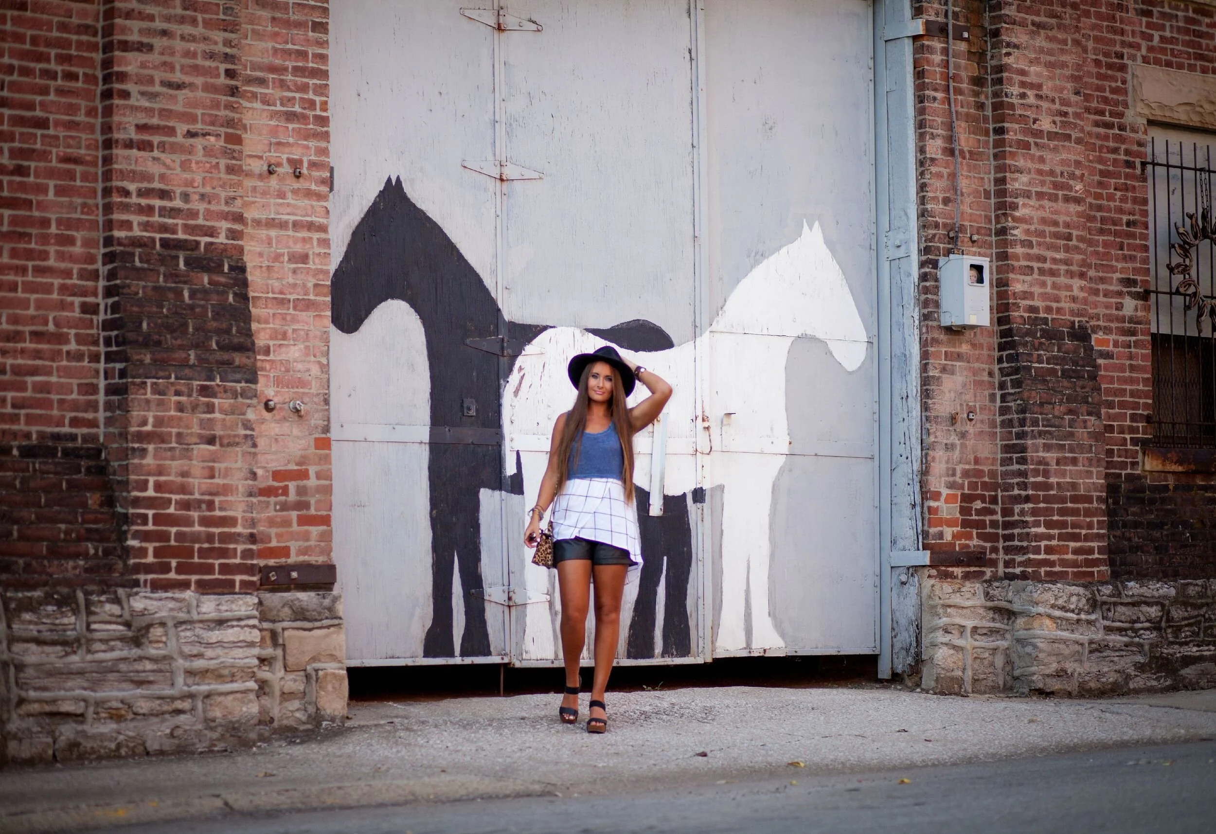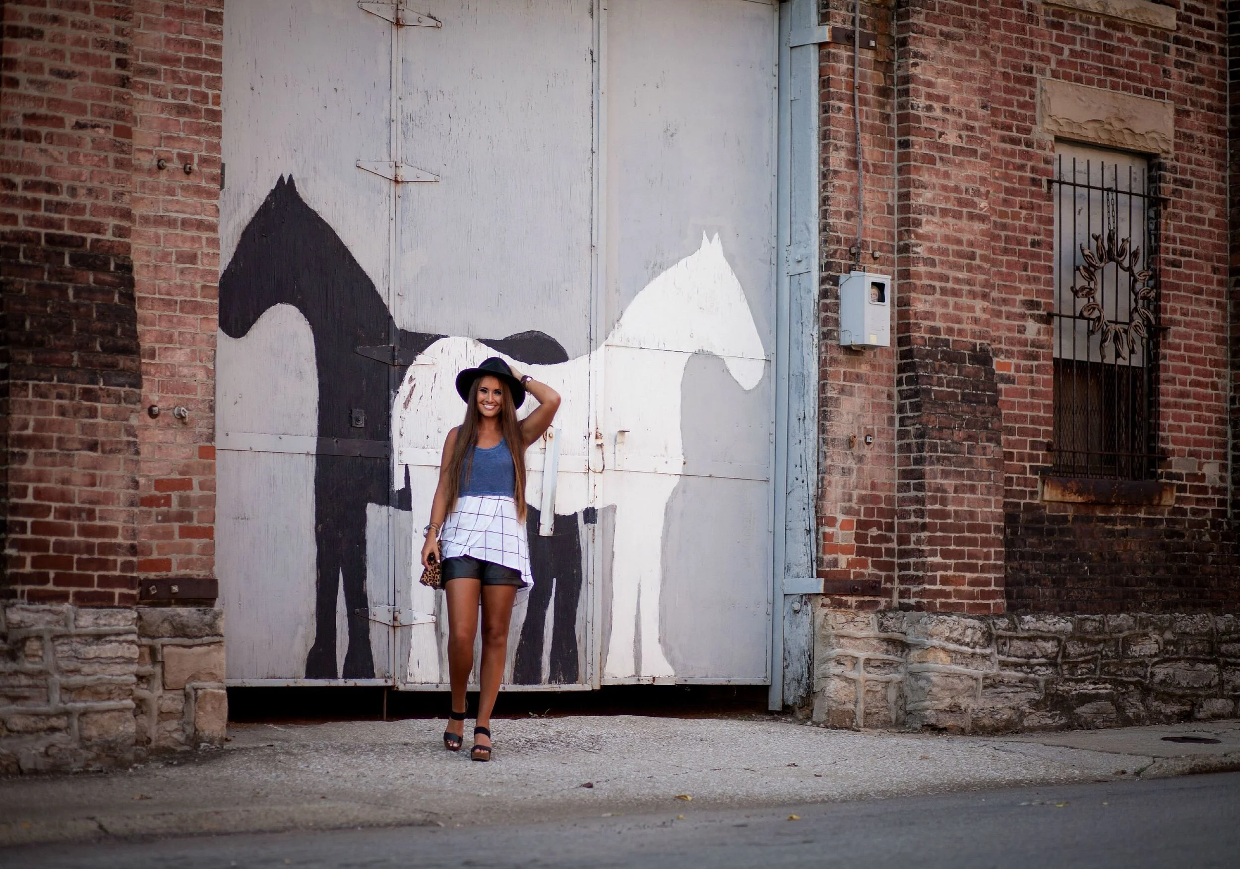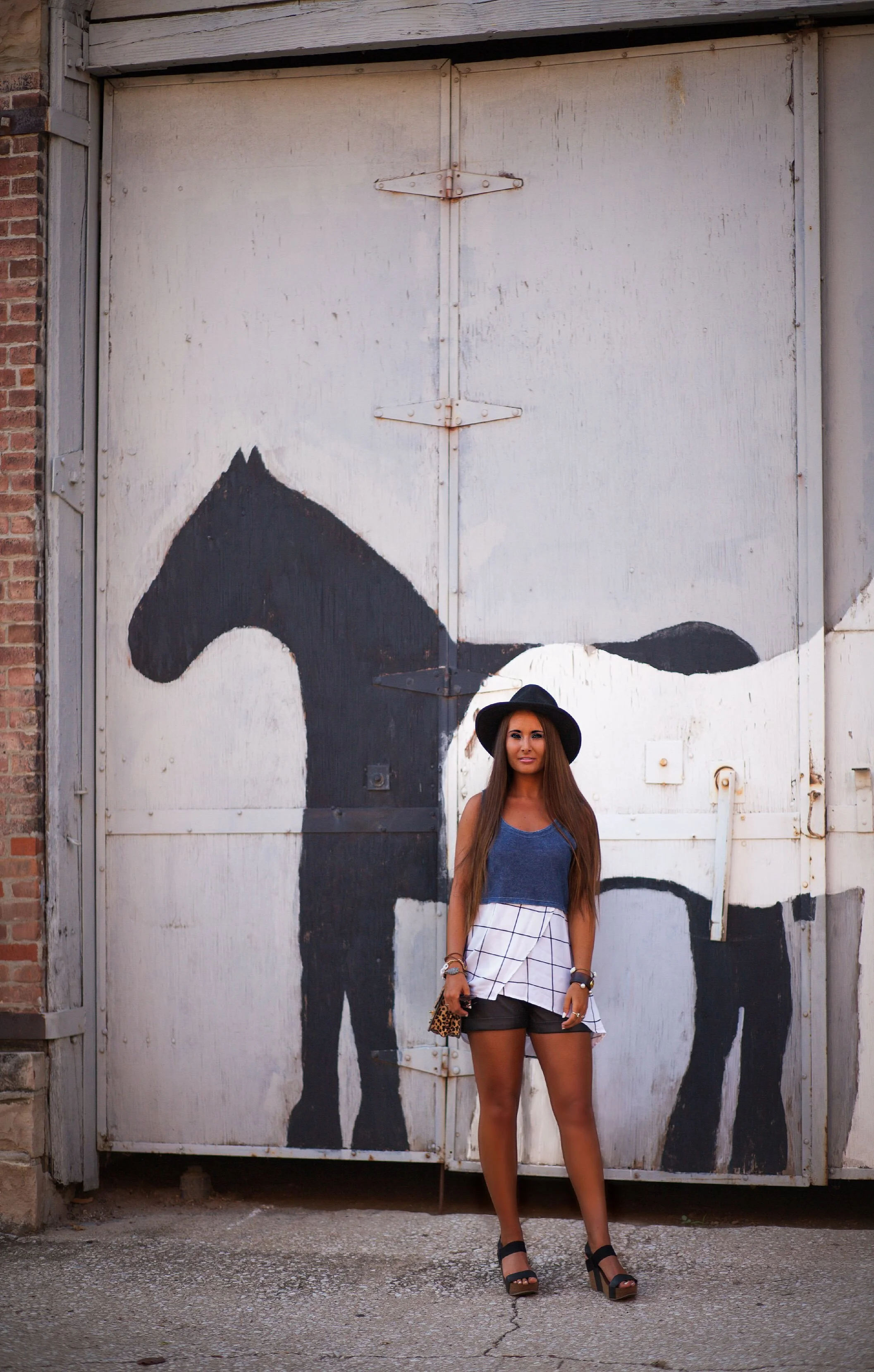 When it comes to fashion, I truly believe there are no rules. Wear what you love, take chances, and wear what you feel comfortable in and you will always look great. For example, most might say that leather is only for winter, but when you find the most perfectly fitting pair of leather shorts while thrifting, you just MUST wear them as much as possible. When I happened upon these 80's high-waisted faux-leather shorts while thrifting last year, I grabbed them thinking I could sell them and that they probably would not fit me. Magically they fit perfectly and have been a staple in my closet ever since. They look adorable over tights in the winter and really add a fun edge to any outfit. The key to wearing leather shorts without looking all "hoochie-mama" is to balance them out with flowy, loose-fitting pieces on top. Peasant tops, slouchy button-downs, or unstructured tanks (like the one I'm wearing) all work perfectly. This flowy, tiered tank from Anthropologie (which is now ON SALE!) has a knit scoop-neck top with drapey cotton-rayon blend bottom in contrasting black and white grid-work print. I love the laid-back look of this top that you can easily dress up or down, and it is so comfortable and flattering. I paired it with some simple strappy black wedges, lots of bangles, my favorite vintage hat, and another pop-of-print leopard satchel.