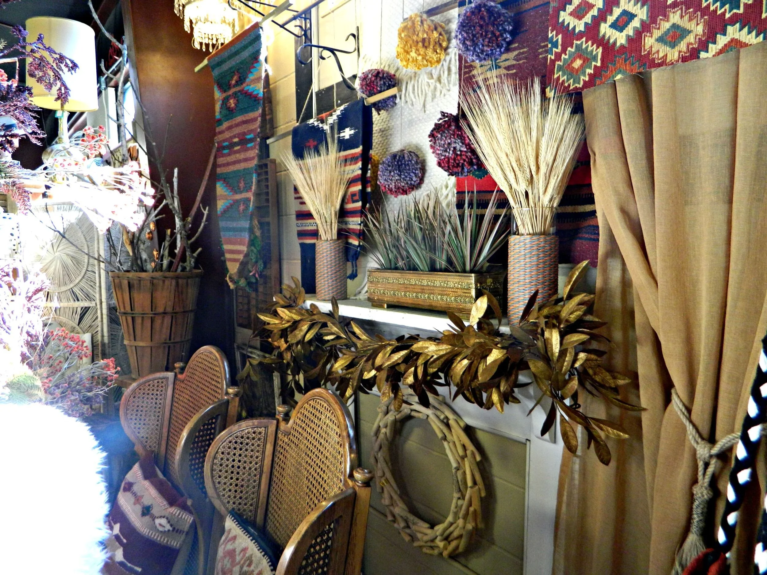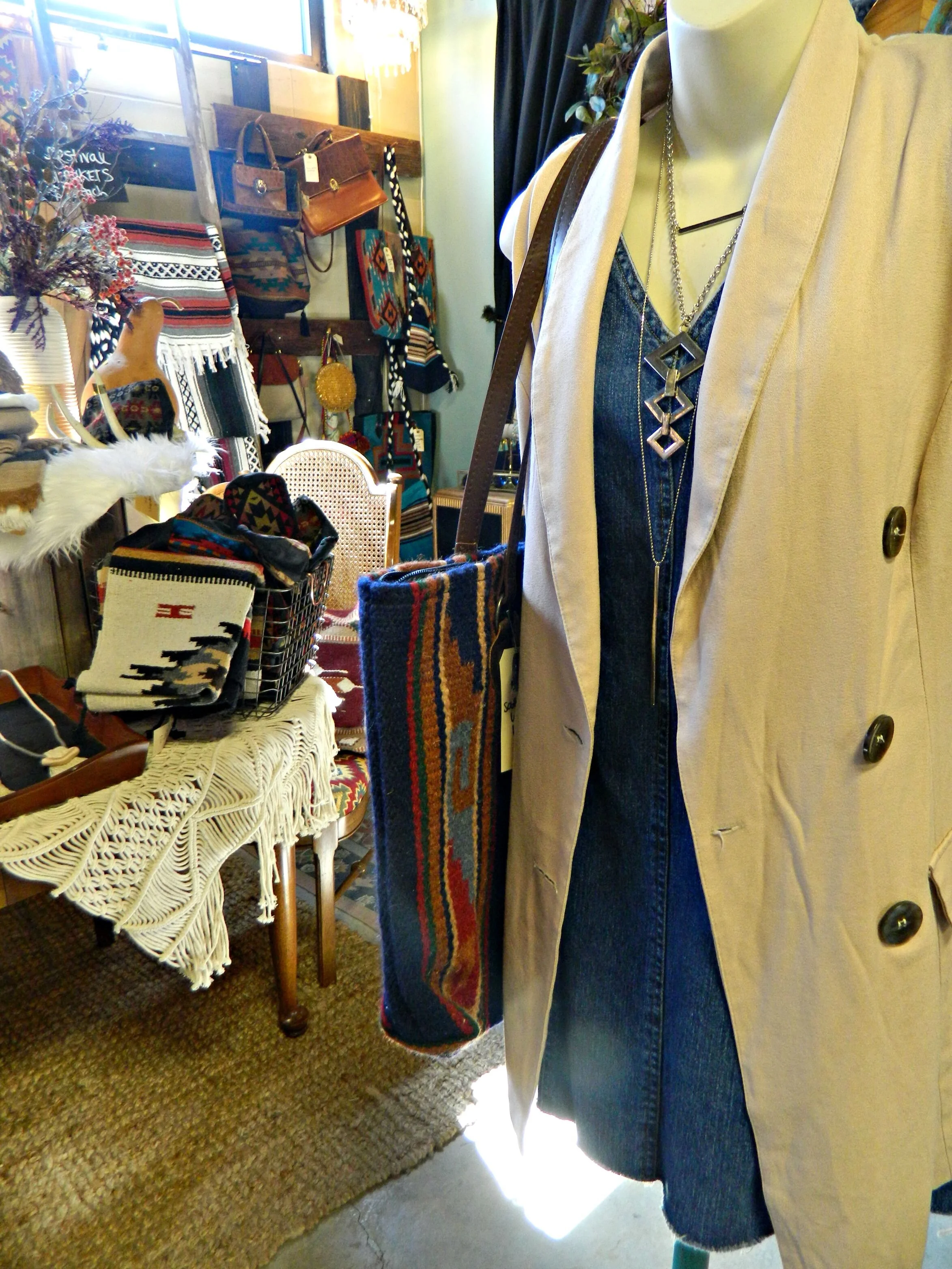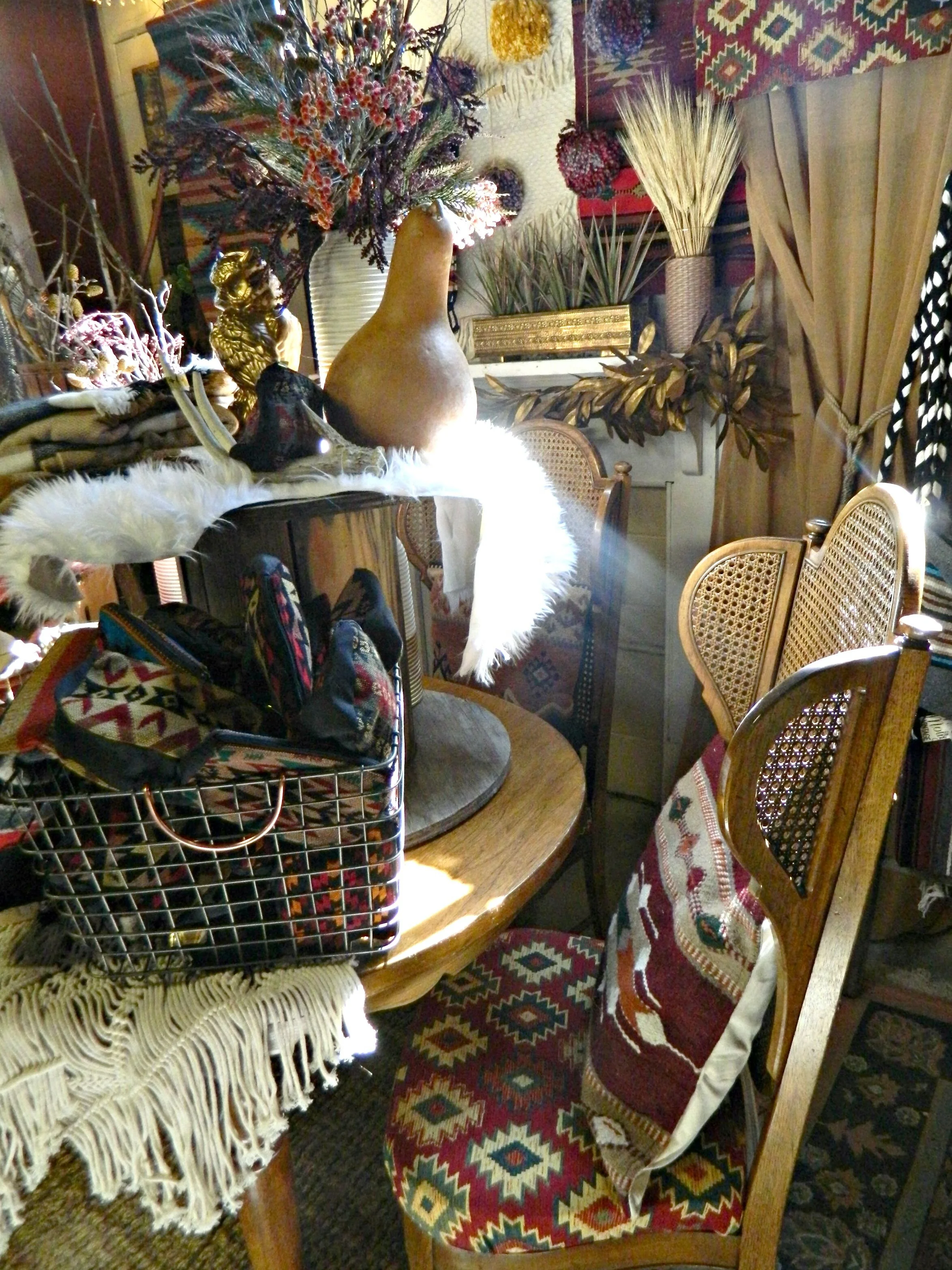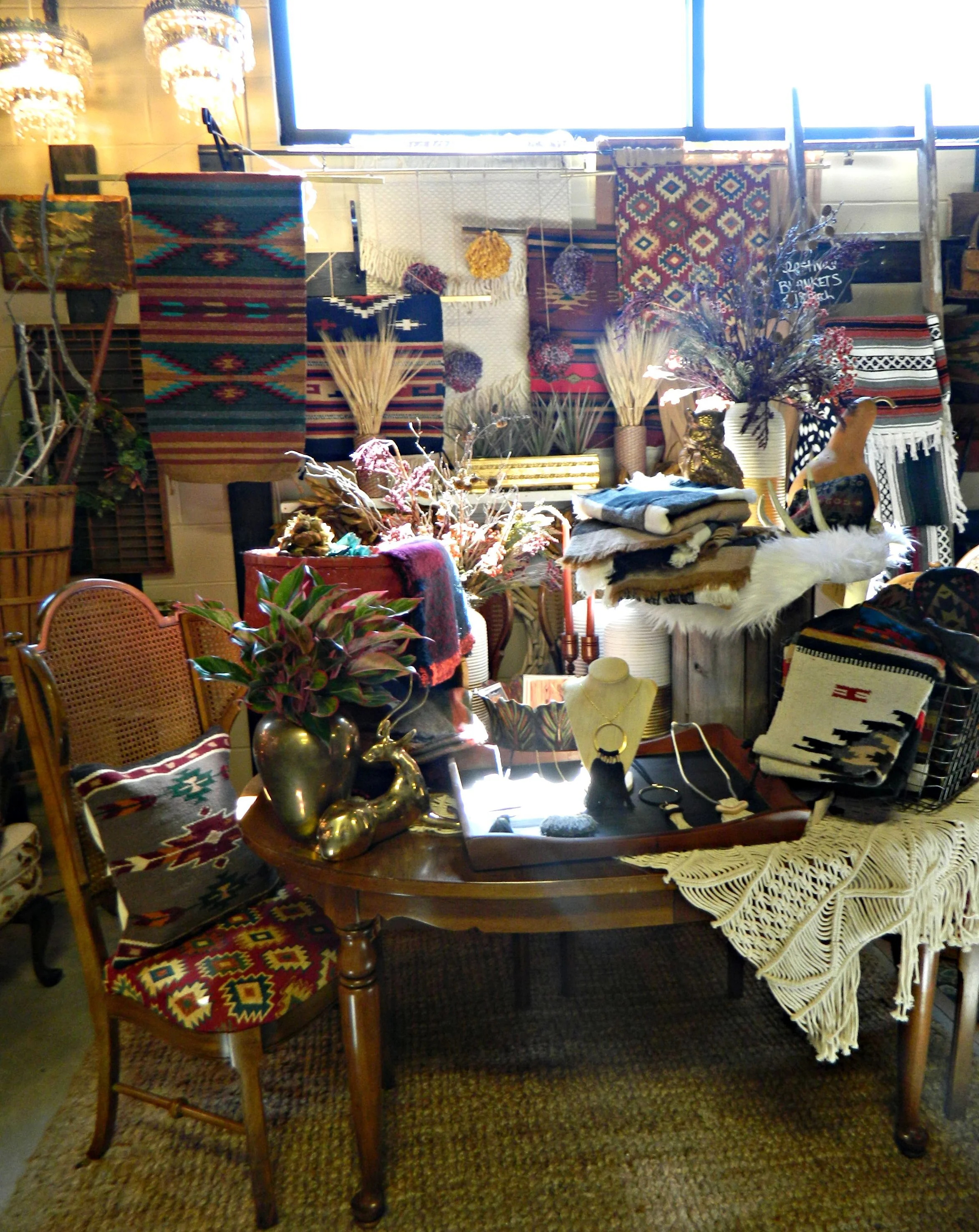 This year our fall display is completely inspired by rich jewel tones and an eclectic mix of cozy textures. Woven tapestries, chunky knits, luxe sheepskins, and boho tassels are just a few of the different textures you will find in the shop. We have so many exciting new arrivals: textile tassel necklaces handmade by Wild Columbine that are perfect for fall, chunky knit infinity scarves and gorgeous plaid blanket scarves, and cozy, and fringed wraps and capes perfect for layering. We created a backdrop by making hanging tapestries using our southwestern woven rugs, and to create even more texture we handmade some knit pom-poms to layer within the tapestries (here's how I make my pom-poms). The centerpiece of the look is this fabulous vintage dining set with gorgeous wing-back, caned-back chairs that we reupholstered in jewel-tone Southwestern print fabric ($310 for the set in-store only). Stop by and shop to get your home and wardrobe ready for fall!