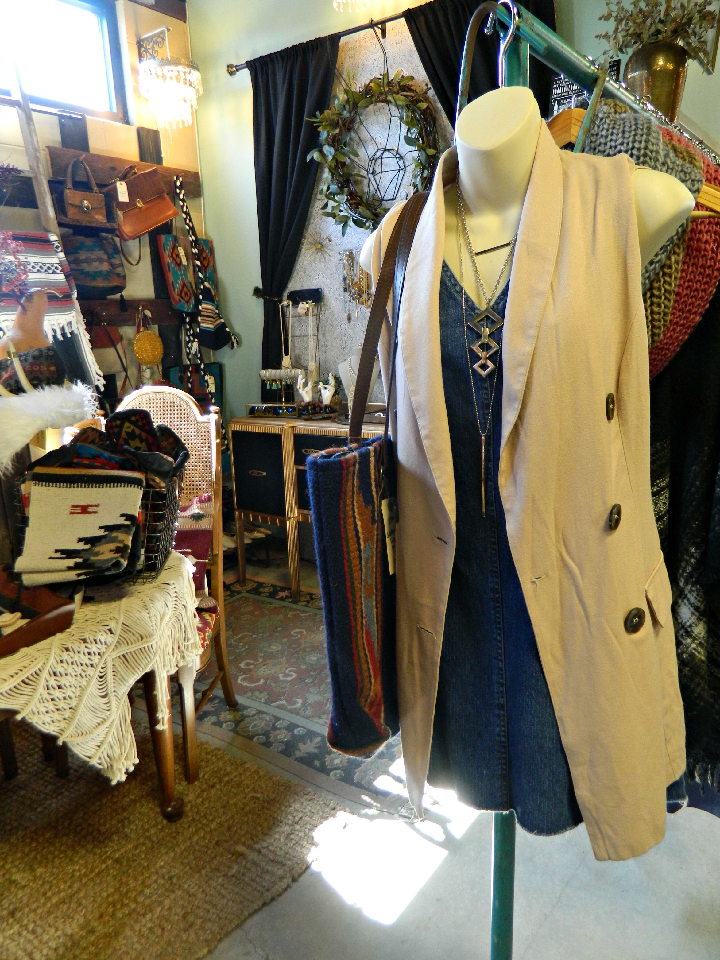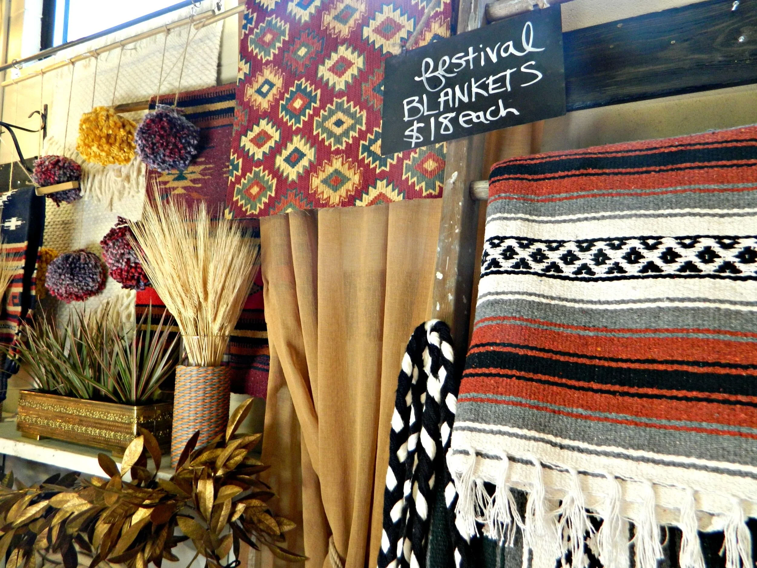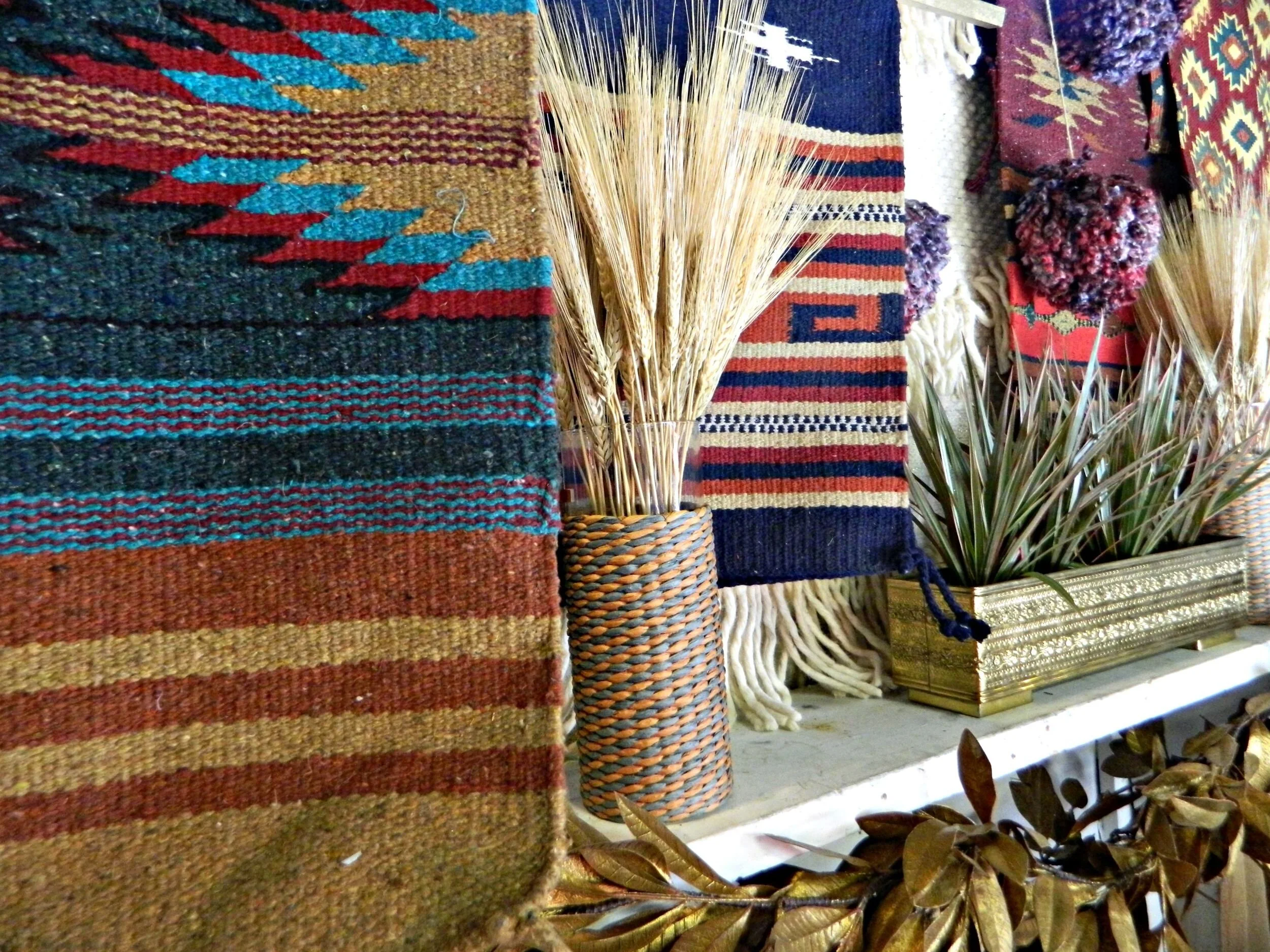 This year our fall display is completely inspired by rich jewel tones and an eclectic mix of cozy textures. Woven tapestries, chunky knits, luxe sheepskins, and boho tassels are just a few of the different textures you will find in the shop. We have so many exciting new arrivals: textile tassel necklaces handmade by Wild Columbine that are perfect for fall, chunky knit infinity scarves and gorgeous plaid blanket scarves, and cozy, and fringed wraps and capes perfect for layering. We created a backdrop by making hanging tapestries using our southwestern woven rugs, and to create even more texture we handmade some knit pom-poms to layer within the tapestries (here's how I make my pom-poms). The centerpiece of the look is this fabulous vintage dining set with gorgeous wing-back, caned-back chairs that we reupholstered in jewel-tone Southwestern print fabric ($310 for the set in-store only). Stop by and shop to get your home and wardrobe ready for fall!