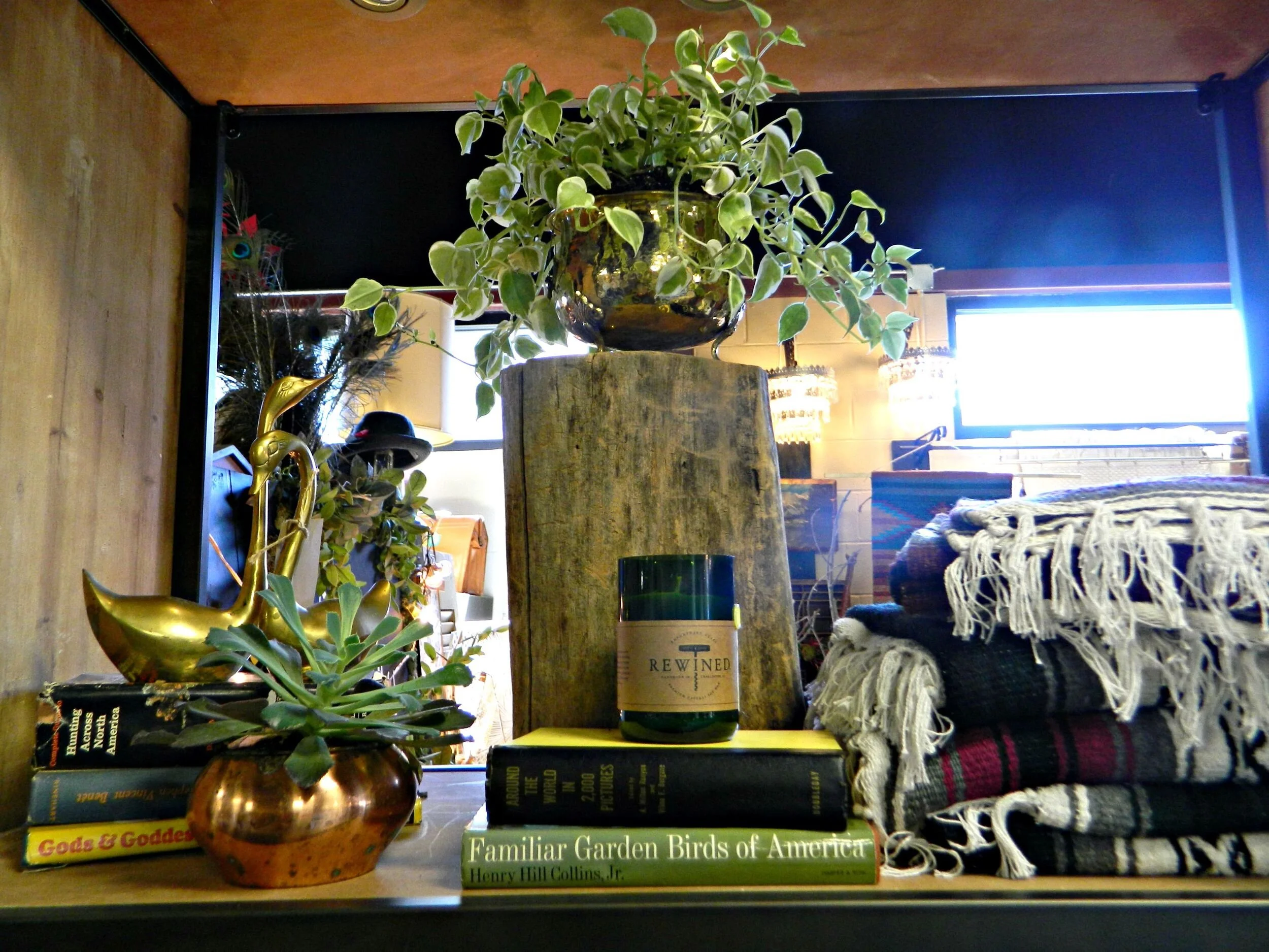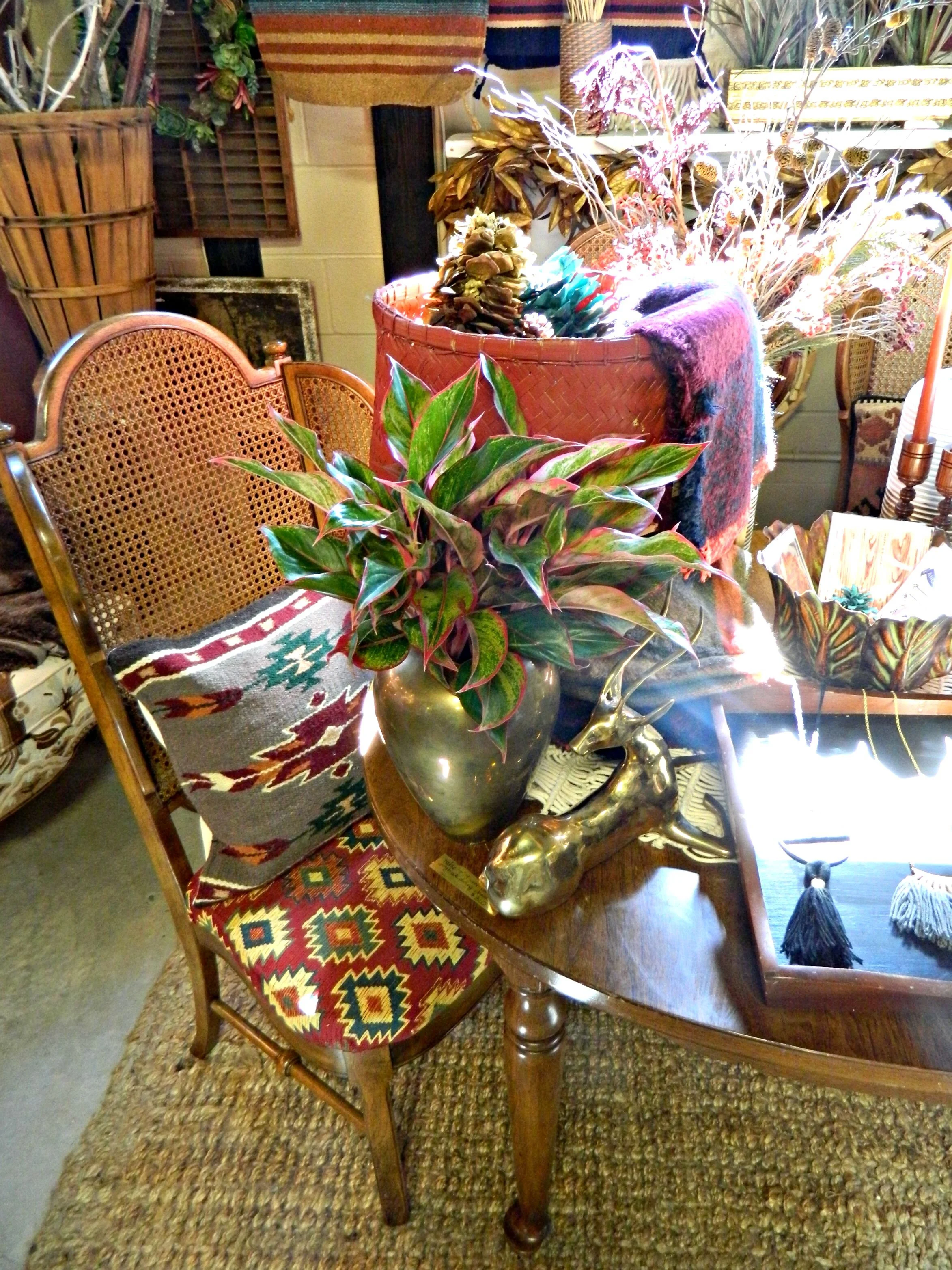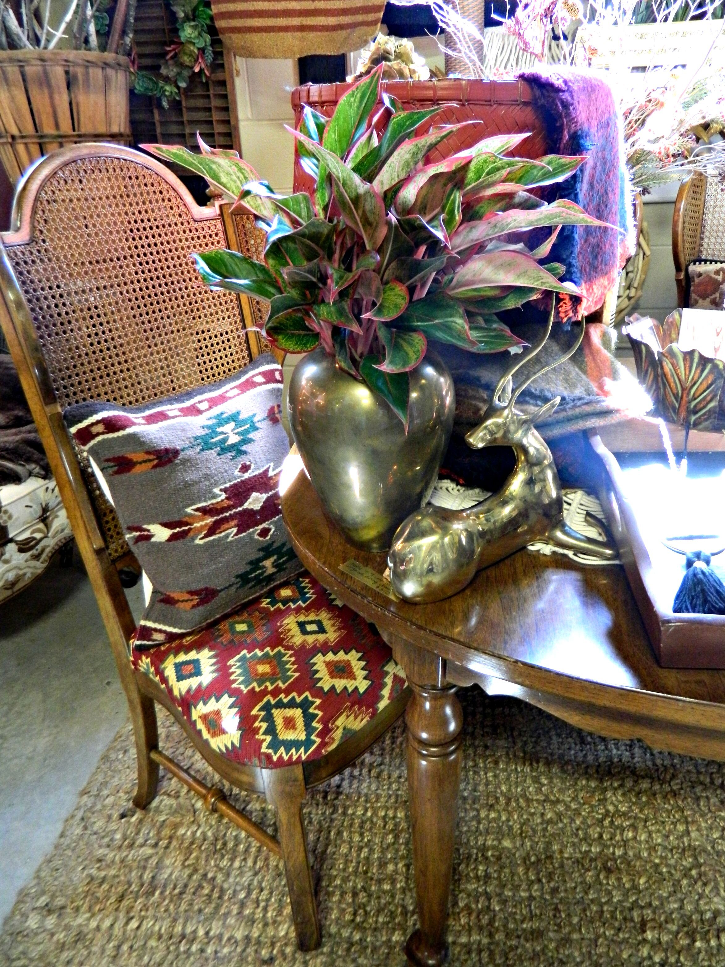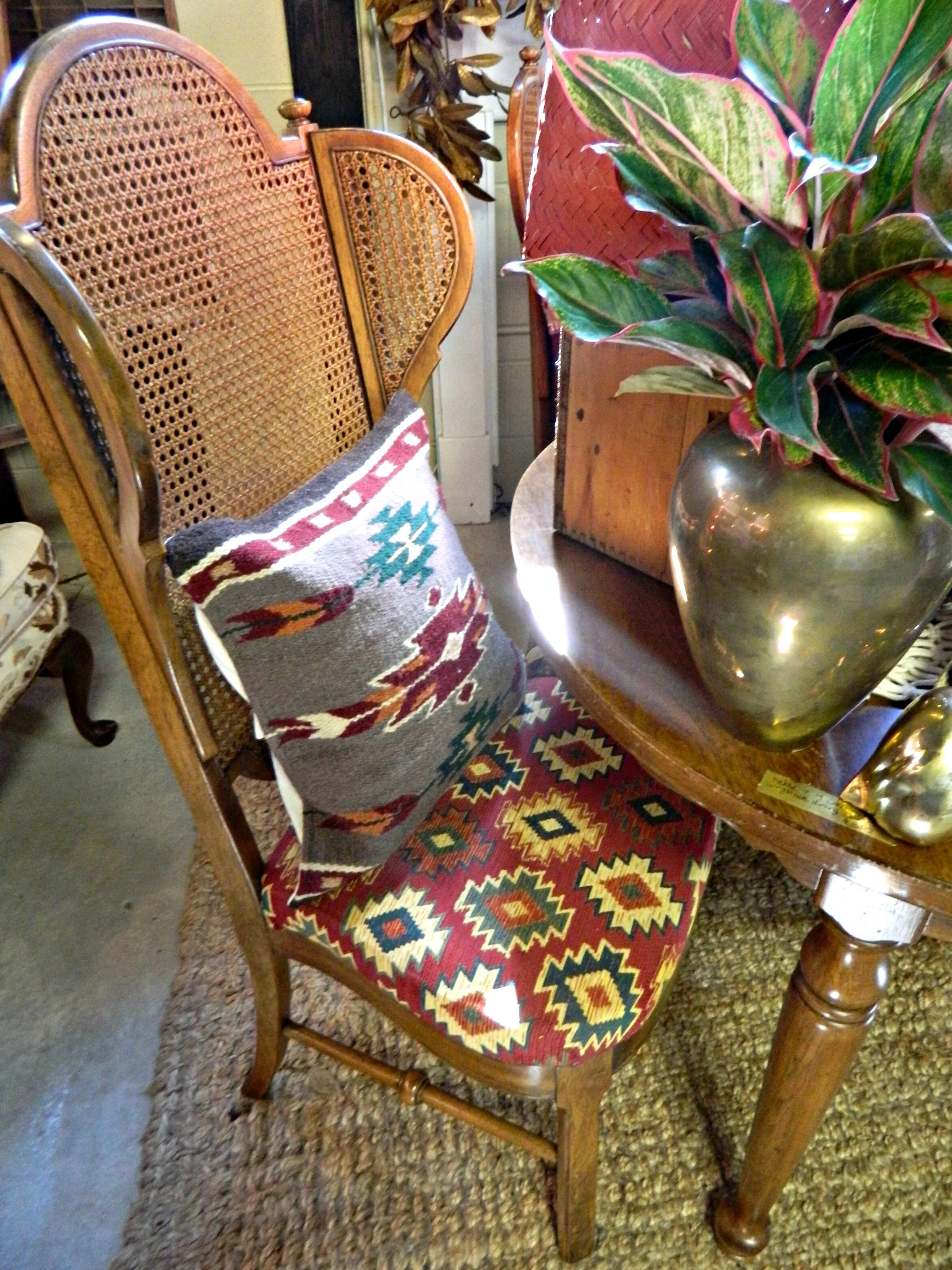 This year our fall display is completely inspired by rich jewel tones and an eclectic mix of cozy textures. Woven tapestries, chunky knits, luxe sheepskins, and boho tassels are just a few of the different textures you will find in the shop. We have so many exciting new arrivals: textile tassel necklaces handmade by Wild Columbine that are perfect for fall, chunky knit infinity scarves and gorgeous plaid blanket scarves, and cozy, and fringed wraps and capes perfect for layering. We created a backdrop by making hanging tapestries using our southwestern woven rugs, and to create even more texture we handmade some knit pom-poms to layer within the tapestries (here's how I make my pom-poms). The centerpiece of the look is this fabulous vintage dining set with gorgeous wing-back, caned-back chairs that we reupholstered in jewel-tone Southwestern print fabric ($310 for the set in-store only). Stop by and shop to get your home and wardrobe ready for fall!