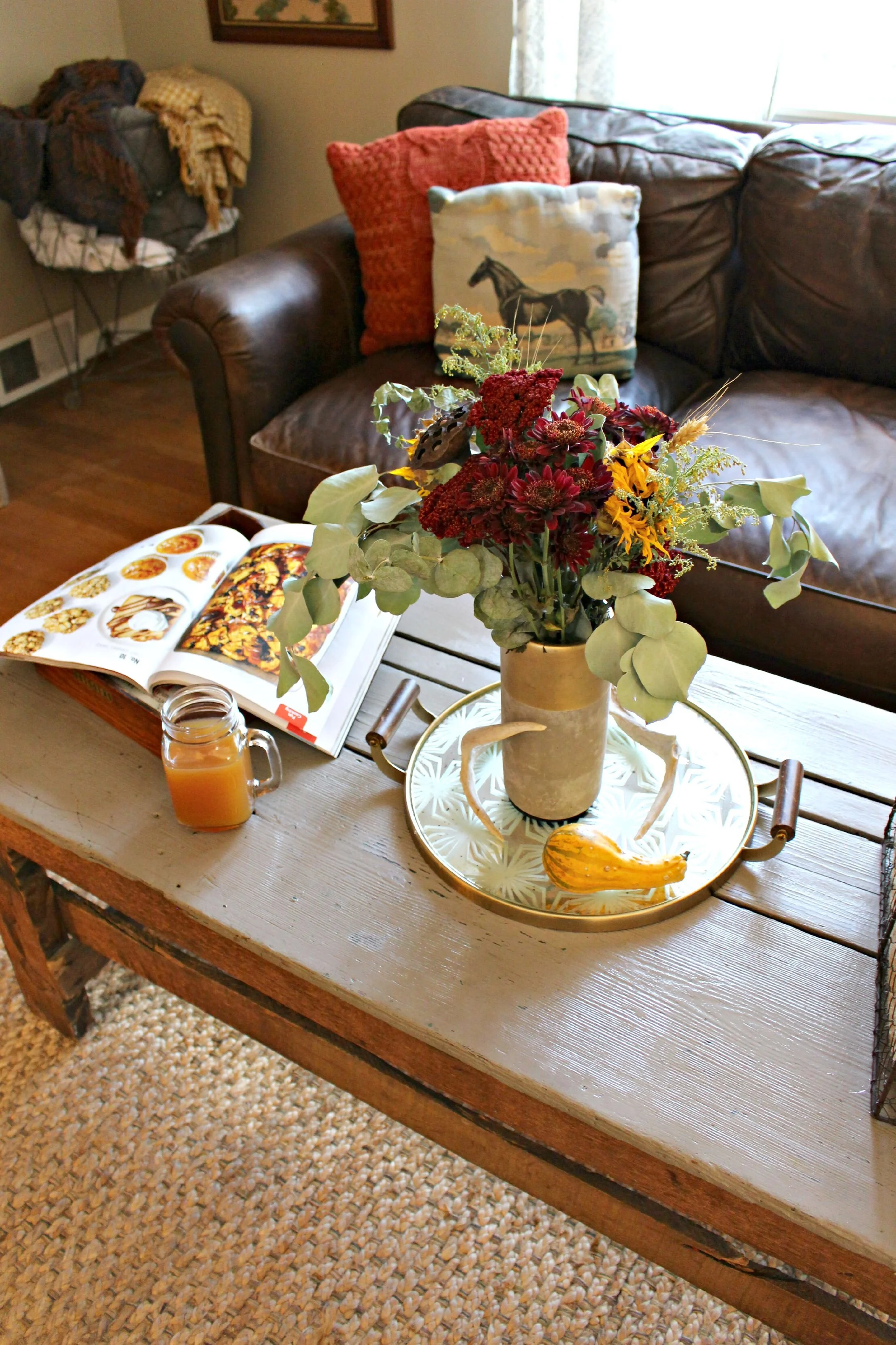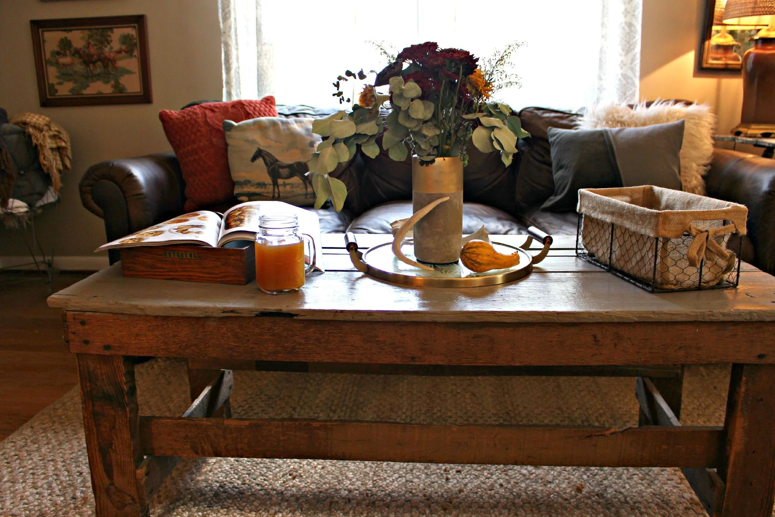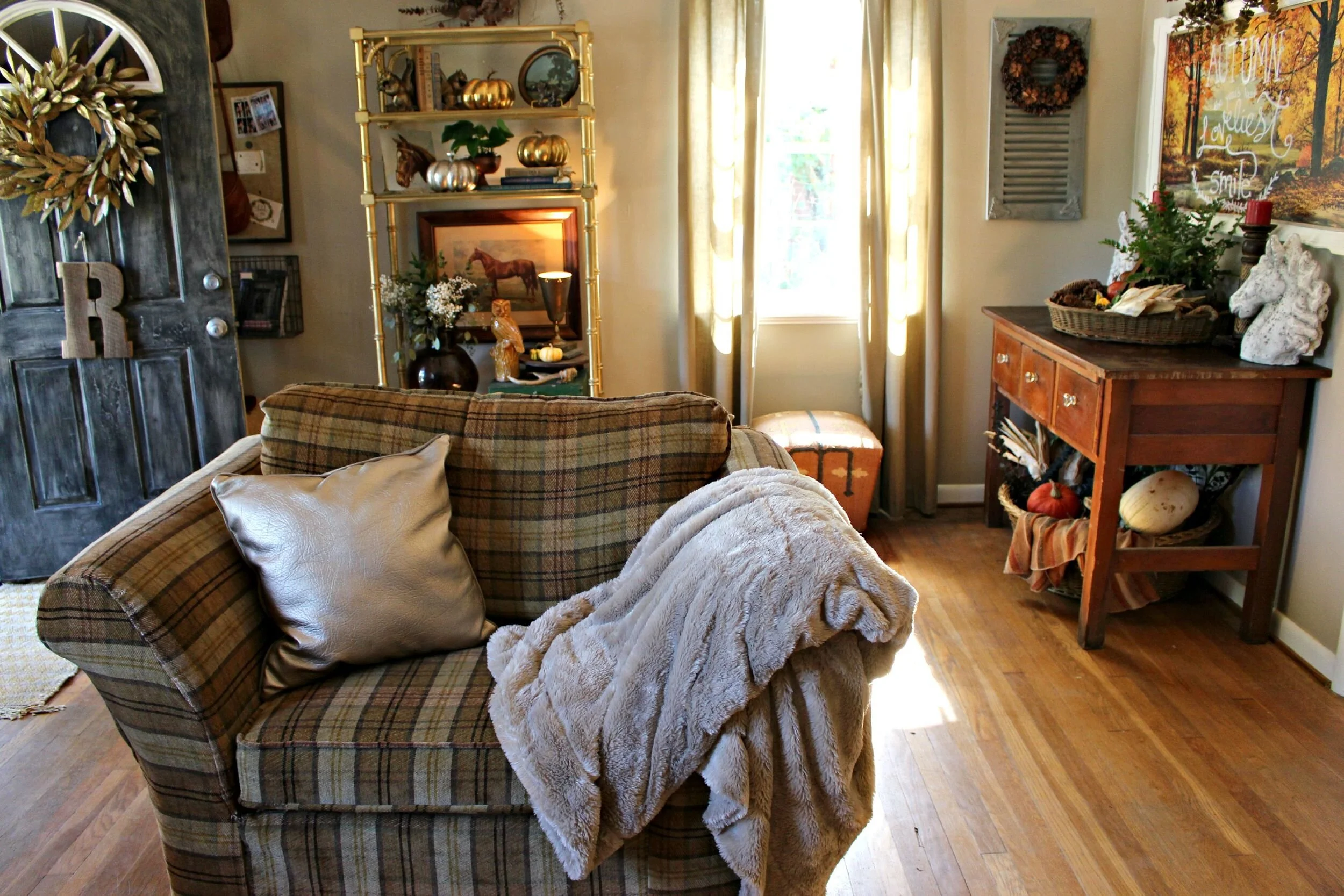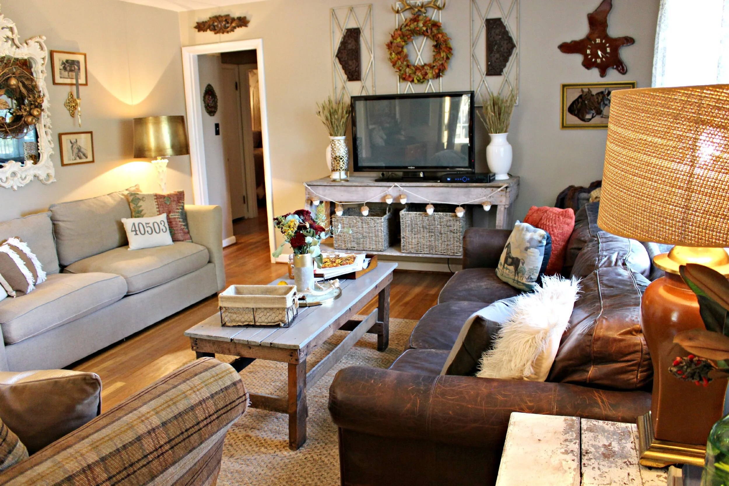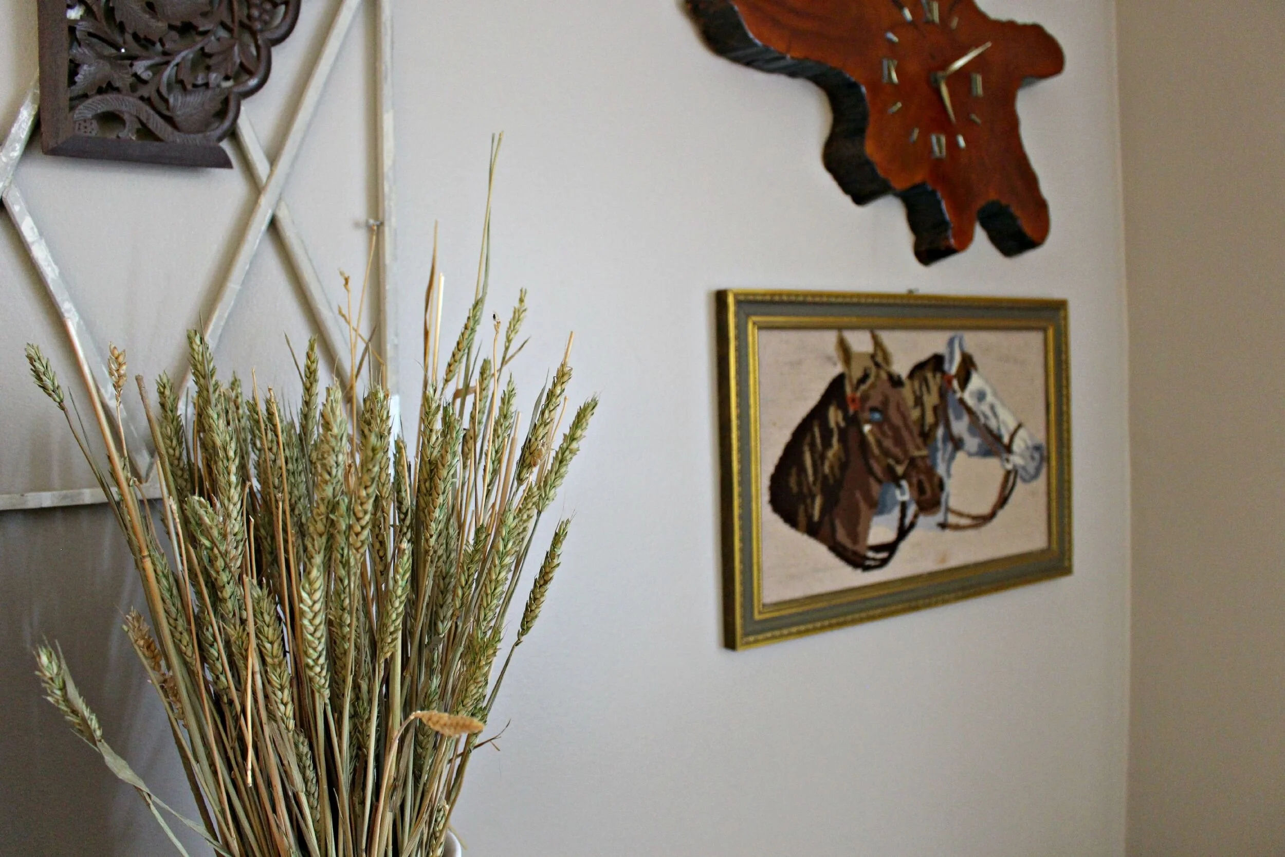 The Process: I start by pulling items that need to go from the room. Anything too summery or that won't match with the look. I will pack these things up in the empty tubs after I have removed all my fall decor from them. Next I start placing the items that I put in the same place every year. For example I always fill the white vases beside my television with wheat. I always hang a wreath above the television with the wooden leaf plaques on each side. Sometimes you might decide to change things up, but start by placing things that you know for sure where they are going. Next I start doing more involved areas like my shelves, which I sometimes have to switch around several times before I find what I like. Thankfully this room is pretty easy for fall because I already have a lot of fall colors and horse items that can work with the theme. I like to switch out pillows with each season and add more knits and textures for fall. I keep a stock pile of pillows (also in my attic). Basically any time I see a pillow that I like on sale or clearance, or while thrifitng, I buy it. Even if I can't use it right away, I might use it somewhere for my holiday decor, or I might use it when I redecorate something in the future! I complete the decorating process with finishing touches like the pumpkins, gourds, and flowers. I try to change every part of the room up just slightly so that it feels fresh and new.