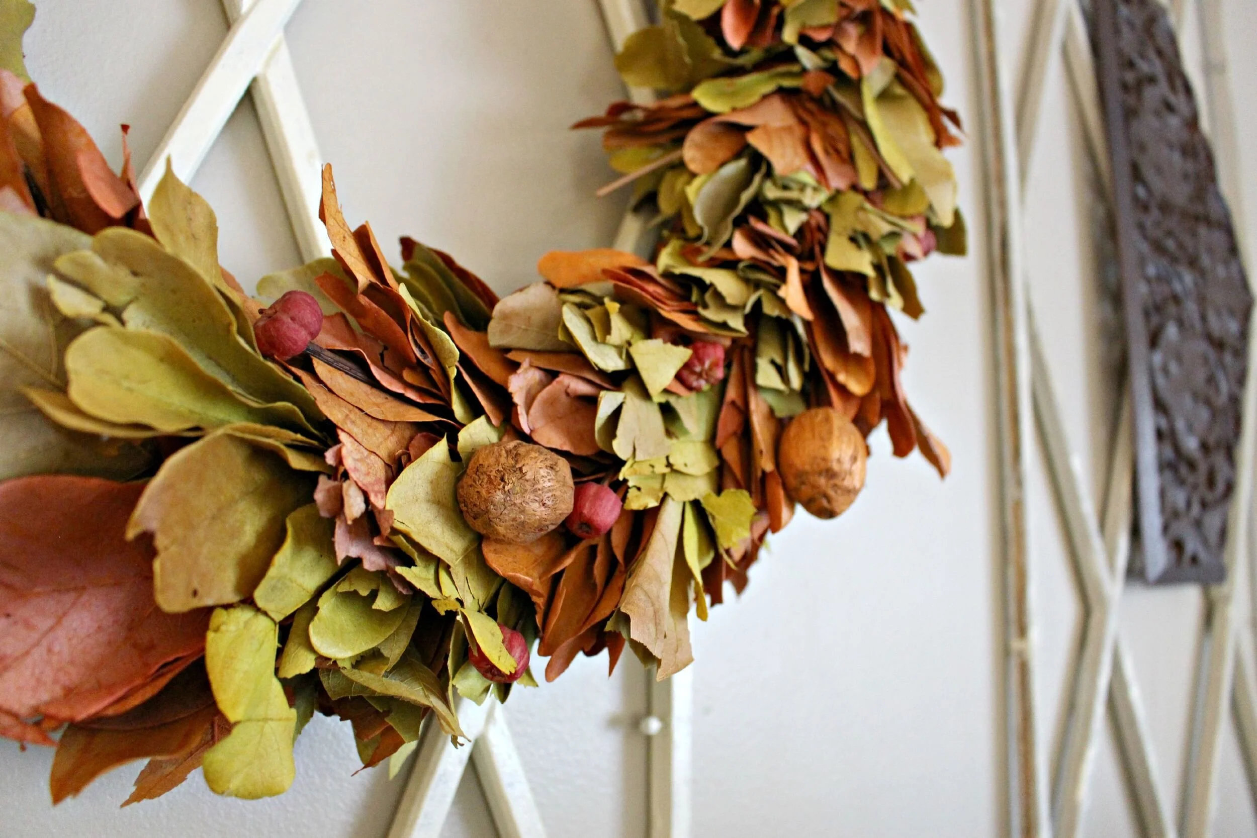 Antlers: Hobby Lobby (spray painted gold) | Wreath: Smith + Hawken from Target bought at Bargain Hunt | White paneled shutters: thrifted | Leaf plaques: thrifted
