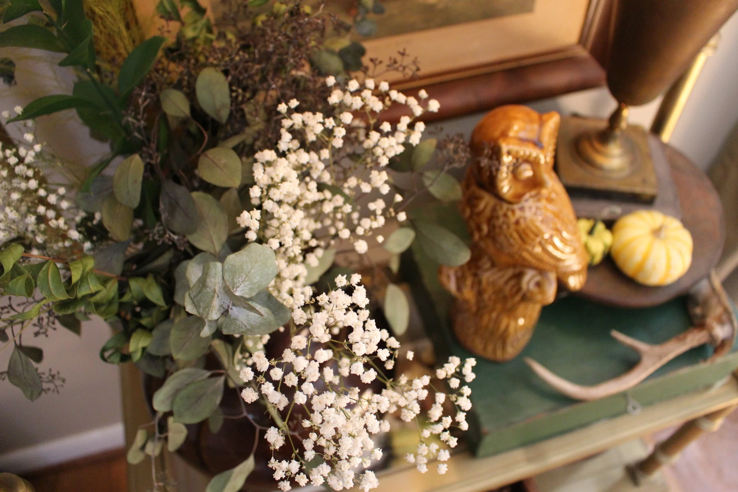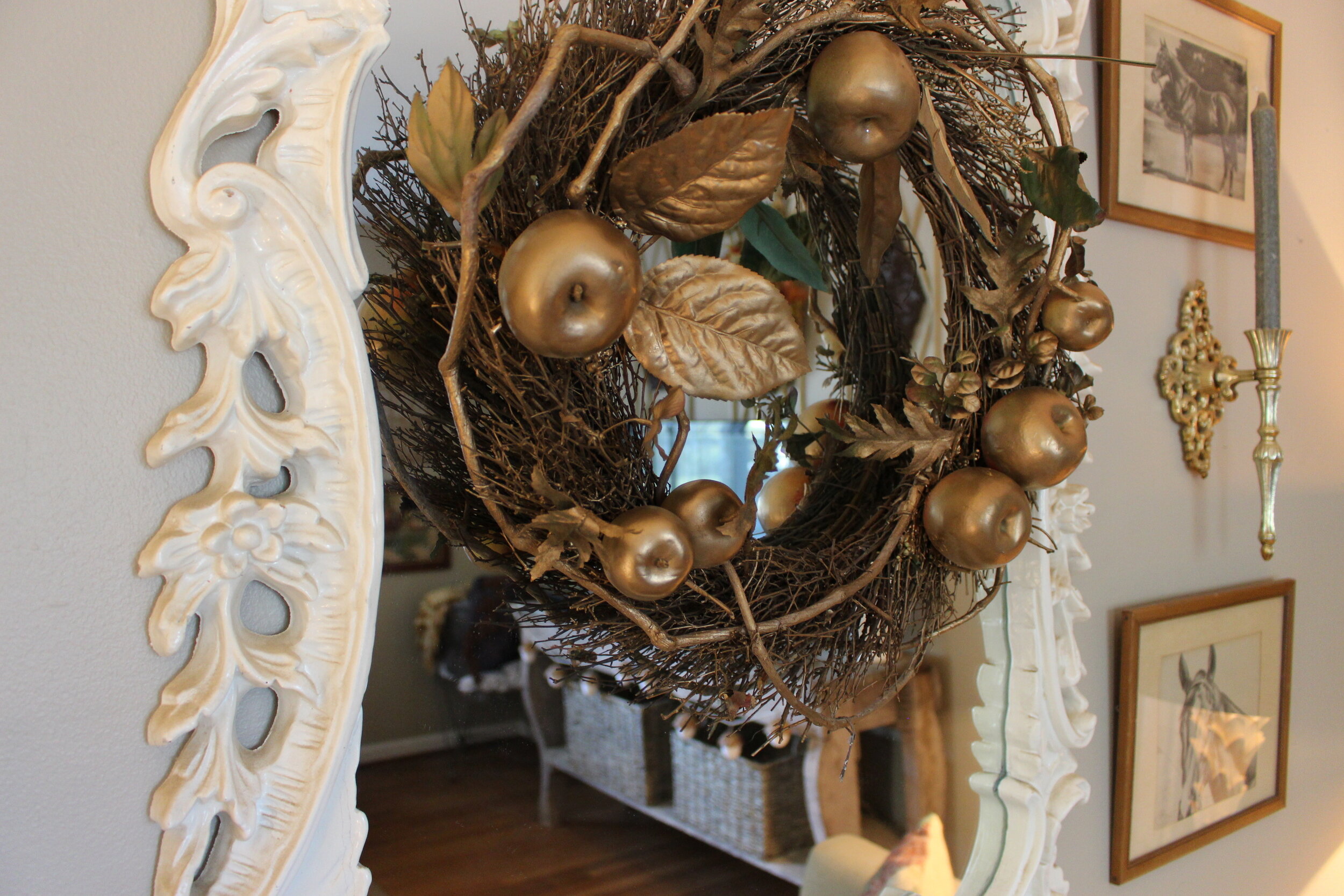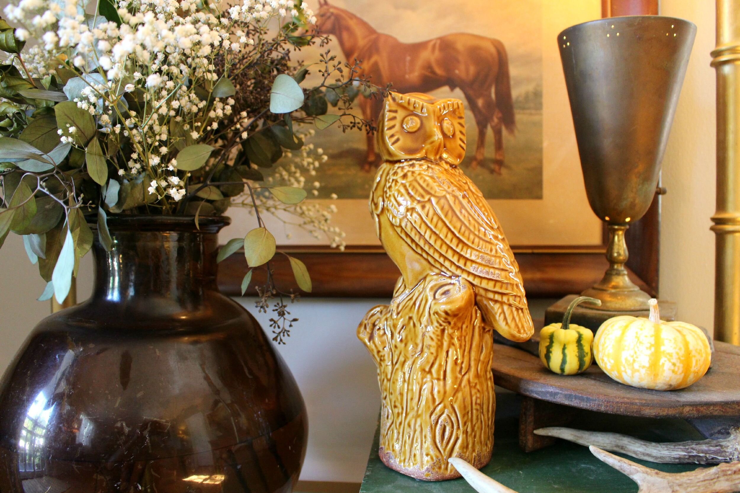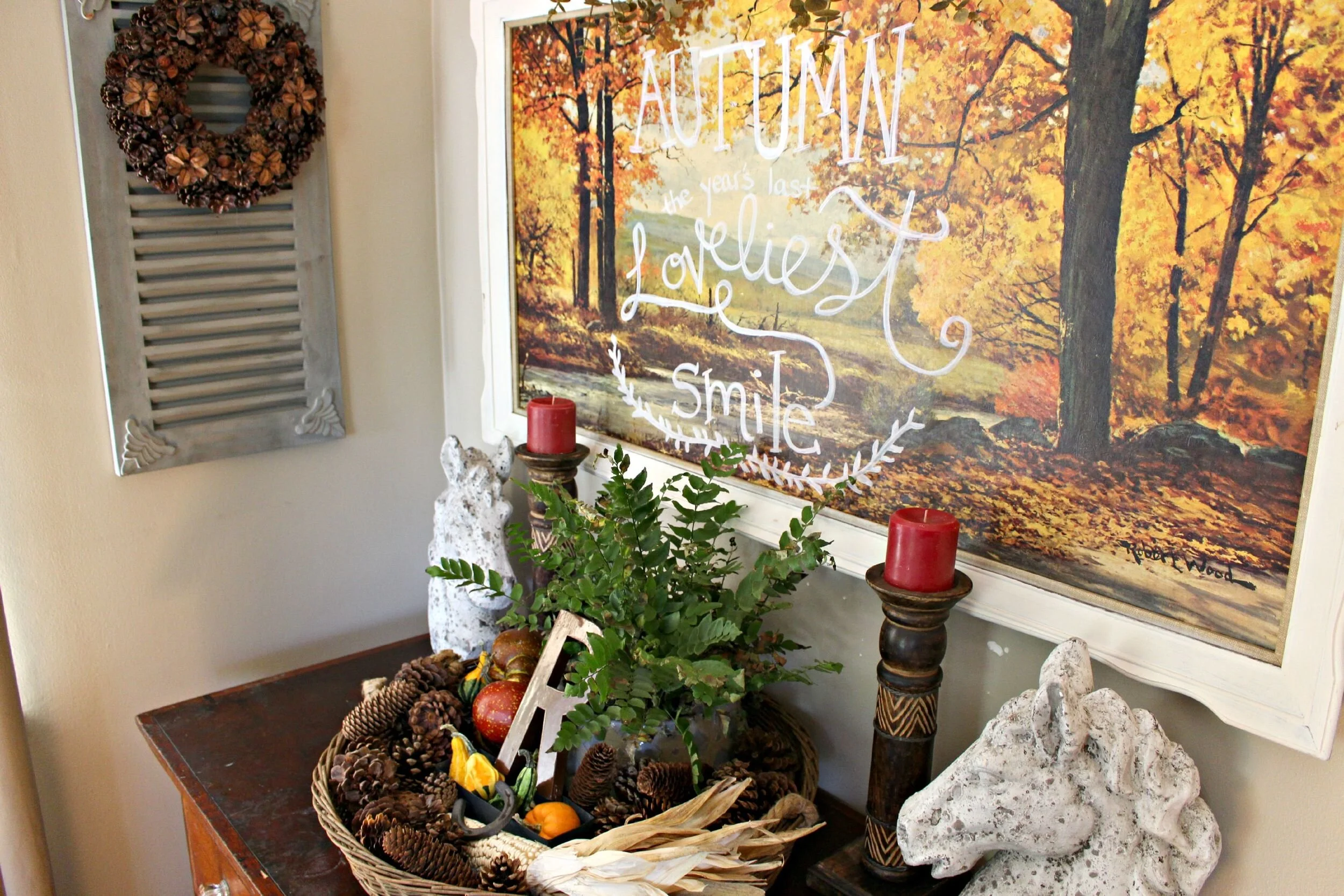 Collecting : I have some staple items I use year after year, and I always purchase a few new things too. Many of the vintage decorations (like my squirrel bookends, wood leaf plaques, horse pictures, etc.), I collect throughout the year and save for the holiday. Thrift shops, garage sales, and peddler malls are treasure troves for seasonal decor as long as you keep your mind open about it throughout the year. For example, I ALWAYS buy good wreaths whenever I see them. The gold fruit/leave wreath on my big white mirror was from a thrift store and I just spray painted it gold! I use it for both fall and Christmas in that same spot. Twig wreaths and pine cones wreaths are a couple of other kinds of wreaths that are easy to find while thrifting. I also always buy natural elements (like greenery, pinecones, twigs, etc.) If you continue collecting these, you will never have to pay full price for them at the craft store and you can use them to fill space all over your room (empty vases, jars, baskets, etc.) Any time I purchase a holiday decoration out of season, I bring it up to the attic and place it in the proper section (even if I'm just setting it on top of a tub or to the side). When you start unpacking your decor it's so nice to have new decorations that most of the time you forgot about!