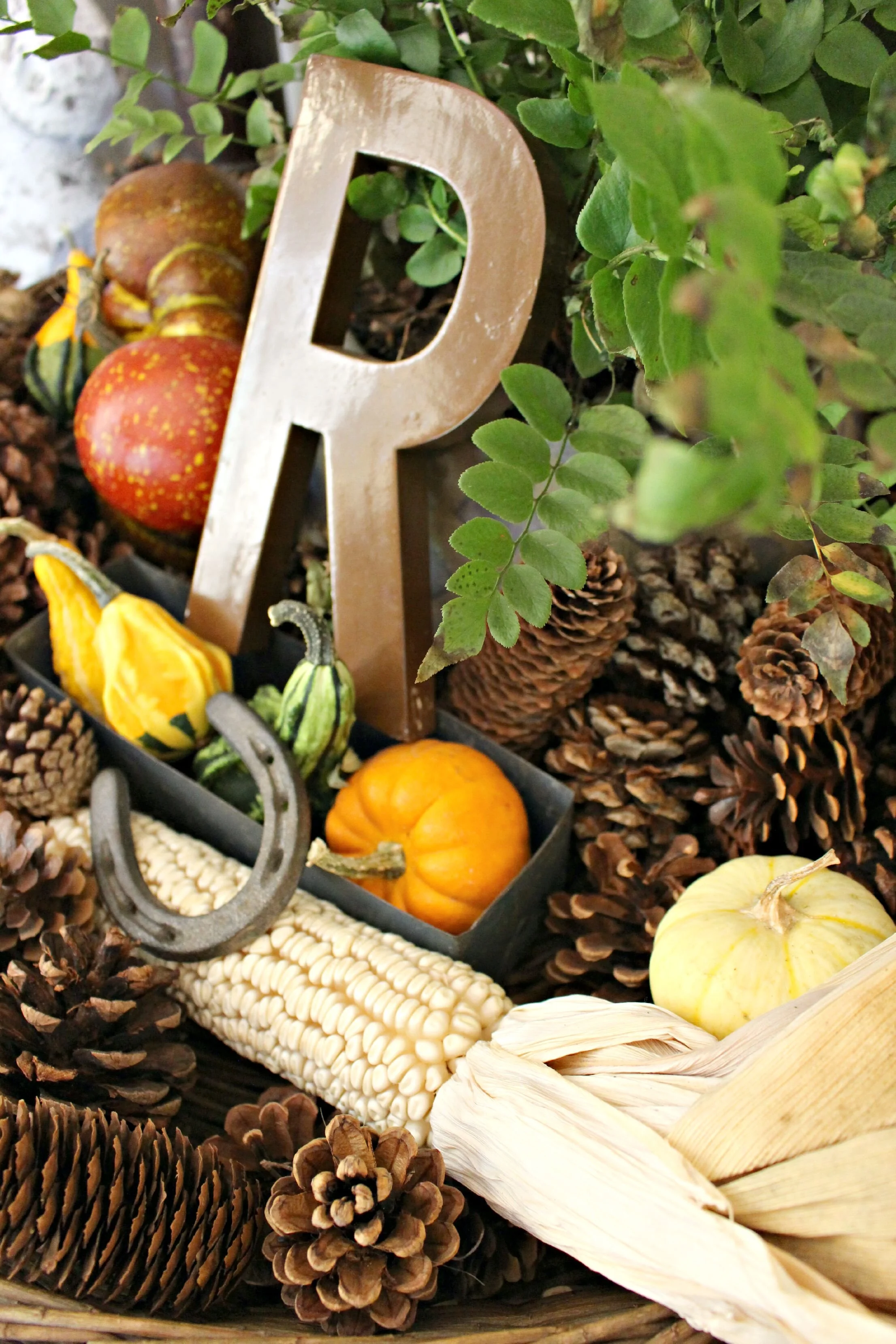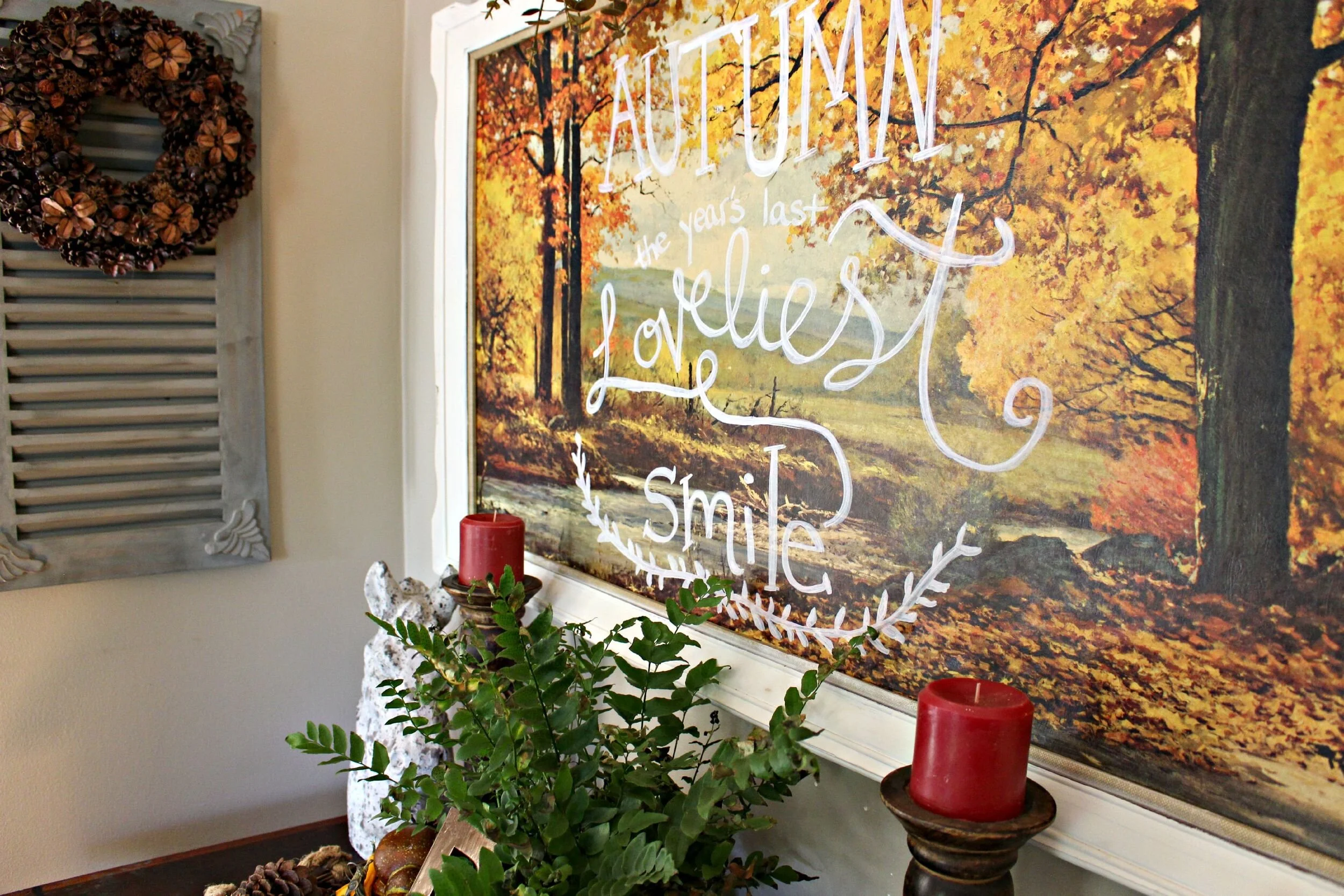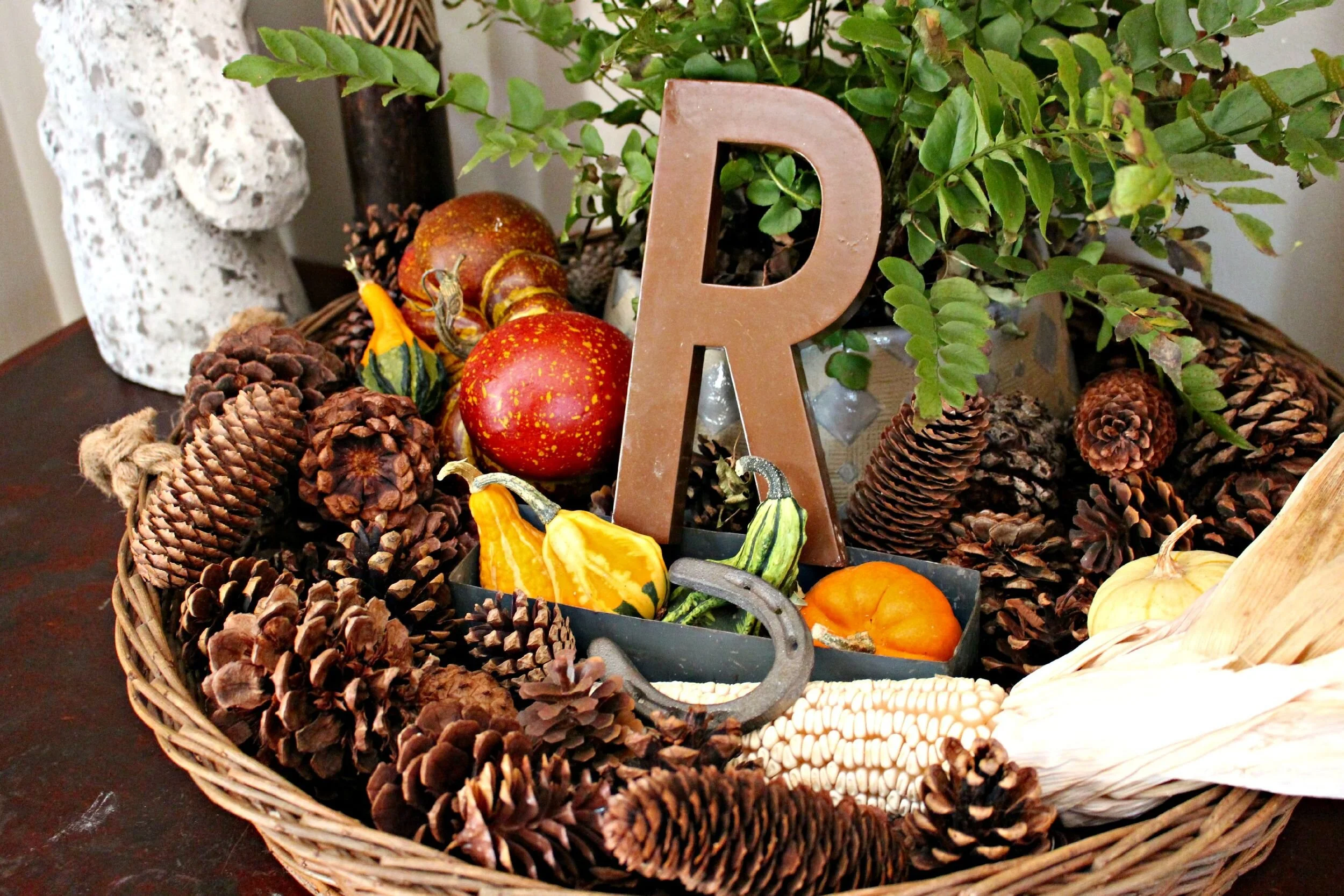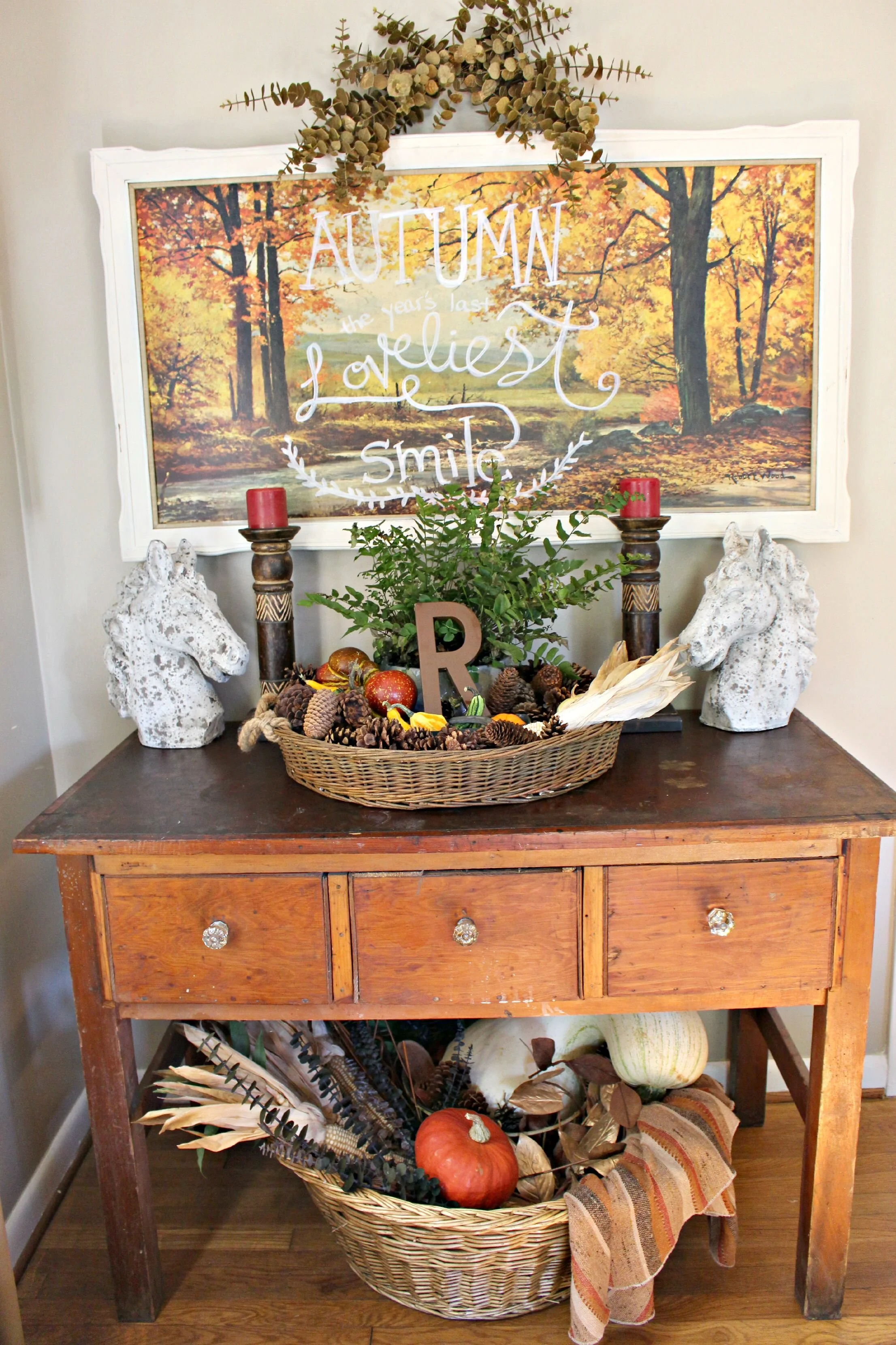 Collecting : I have some staple items I use year after year, and I always purchase a few new things too. Many of the vintage decorations (like my squirrel bookends, wood leaf plaques, horse pictures, etc.), I collect throughout the year and save for the holiday. Thrift shops, garage sales, and peddler malls are treasure troves for seasonal decor as long as you keep your mind open about it throughout the year. For example, I ALWAYS buy good wreaths whenever I see them. The gold fruit/leave wreath on my big white mirror was from a thrift store and I just spray painted it gold! I use it for both fall and Christmas in that same spot. Twig wreaths and pine cones wreaths are a couple of other kinds of wreaths that are easy to find while thrifting. I also always buy natural elements (like greenery, pinecones, twigs, etc.) If you continue collecting these, you will never have to pay full price for them at the craft store and you can use them to fill space all over your room (empty vases, jars, baskets, etc.) Any time I purchase a holiday decoration out of season, I bring it up to the attic and place it in the proper section (even if I'm just setting it on top of a tub or to the side). When you start unpacking your decor it's so nice to have new decorations that most of the time you forgot about!