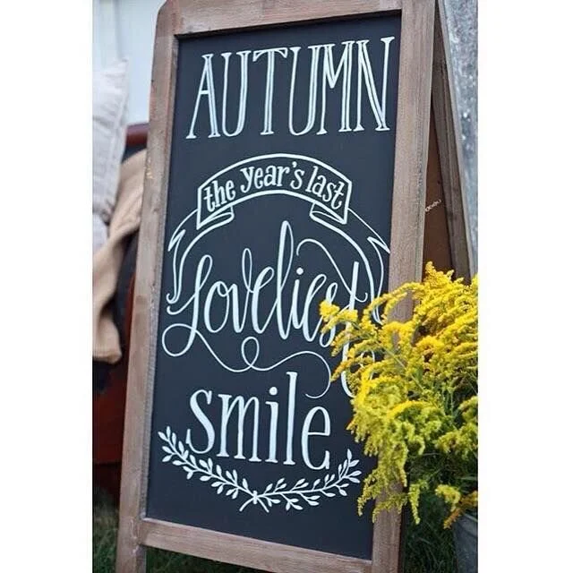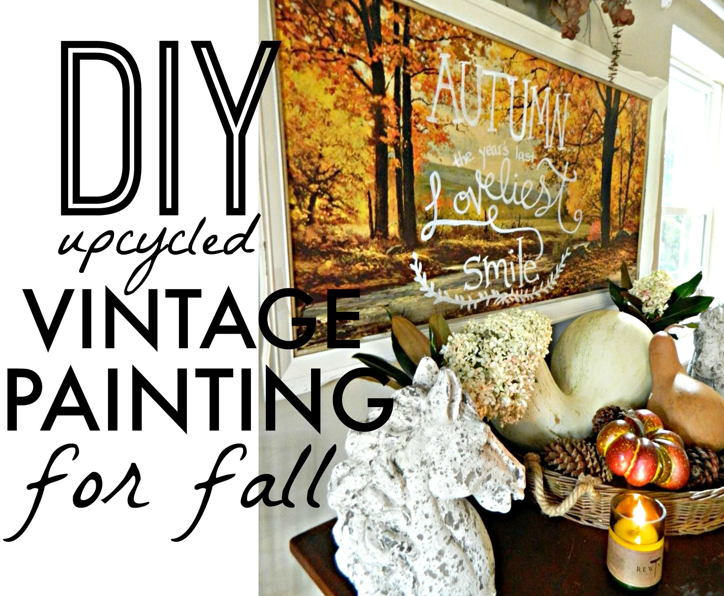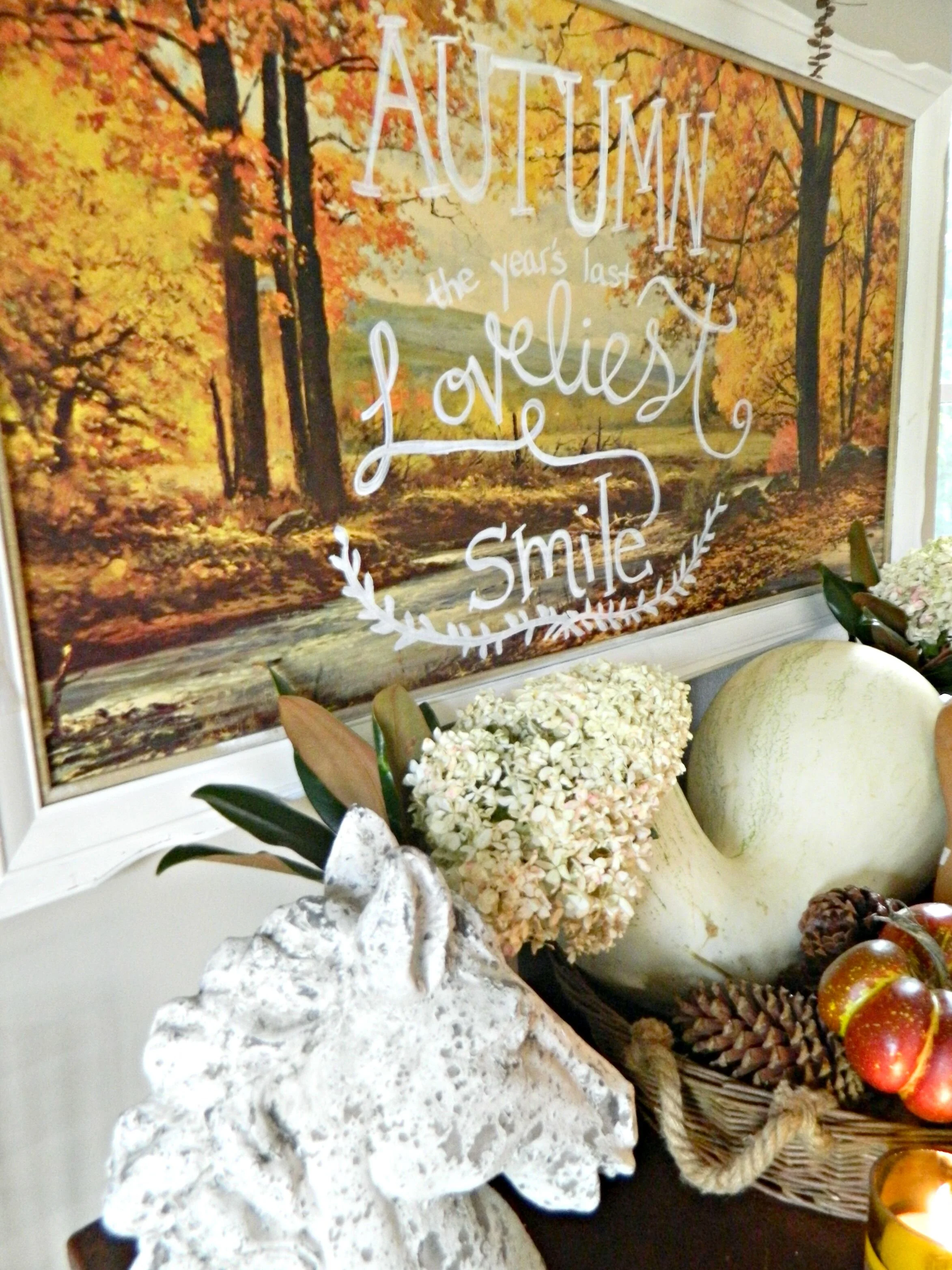 Here's a super easy way to add some fall decor to your home for just a few dollars! Many of us have seen these classic landscape paintings from the 60's-70's, whether it be in grandma's house or at a garage sale or thrift store. While some might think they are tacky, I personally love some of the fall/winter scenes for seasonal decorating. I was inspired by an older post from one of my fave bloggers DIY Showoff, where she updated one of these paintings for her Thanksgiving decor. After seeing a picture of her project on Pinterest, I came across this painting the next day at the thrift store and snatched it up with the idea to paint some words over it. The next step was to decide what words to paint on it. I searched for "fall chalkboard art" on Pinterest and found so many cute quotes but decided this one fit the size and look of the painting best.