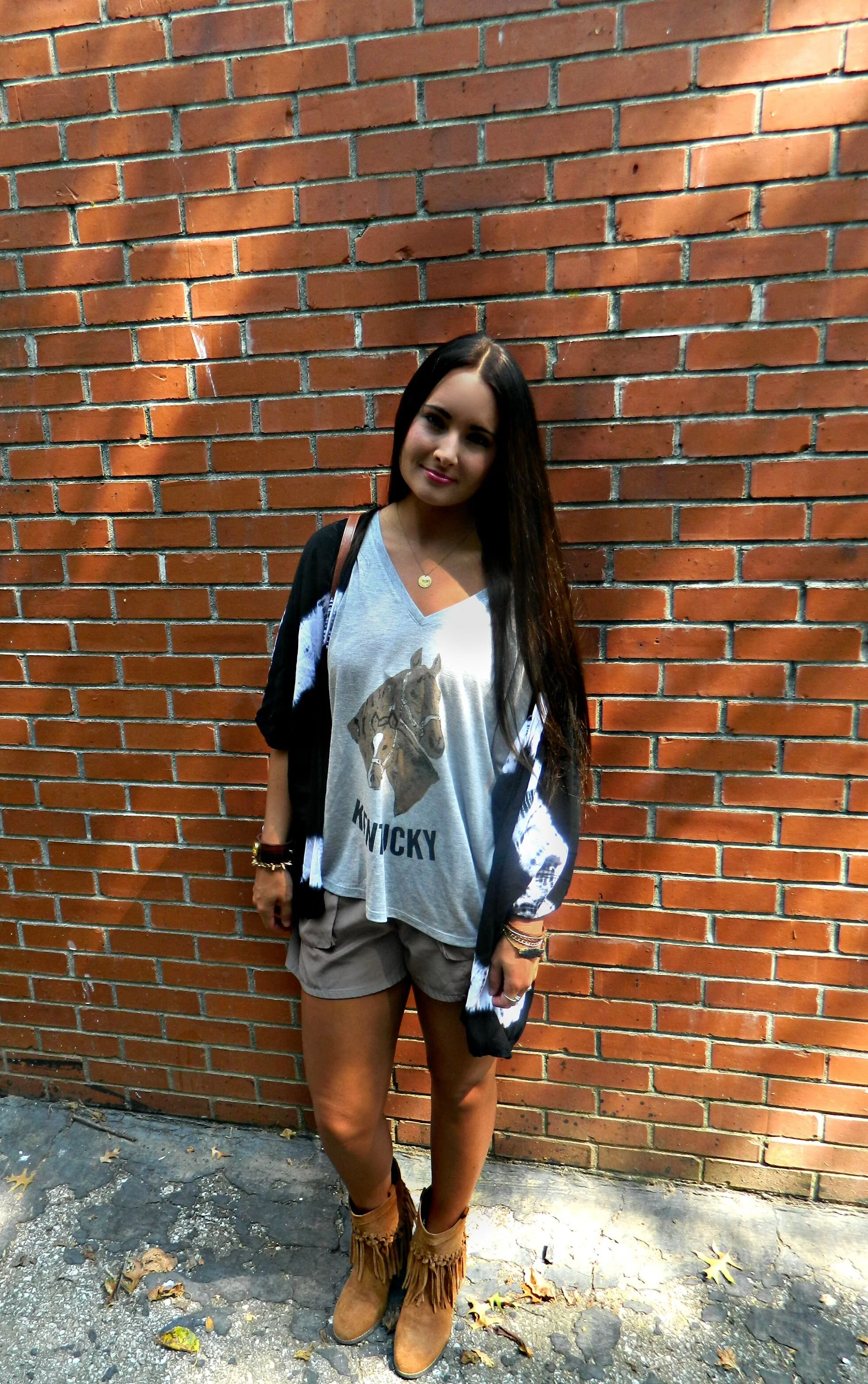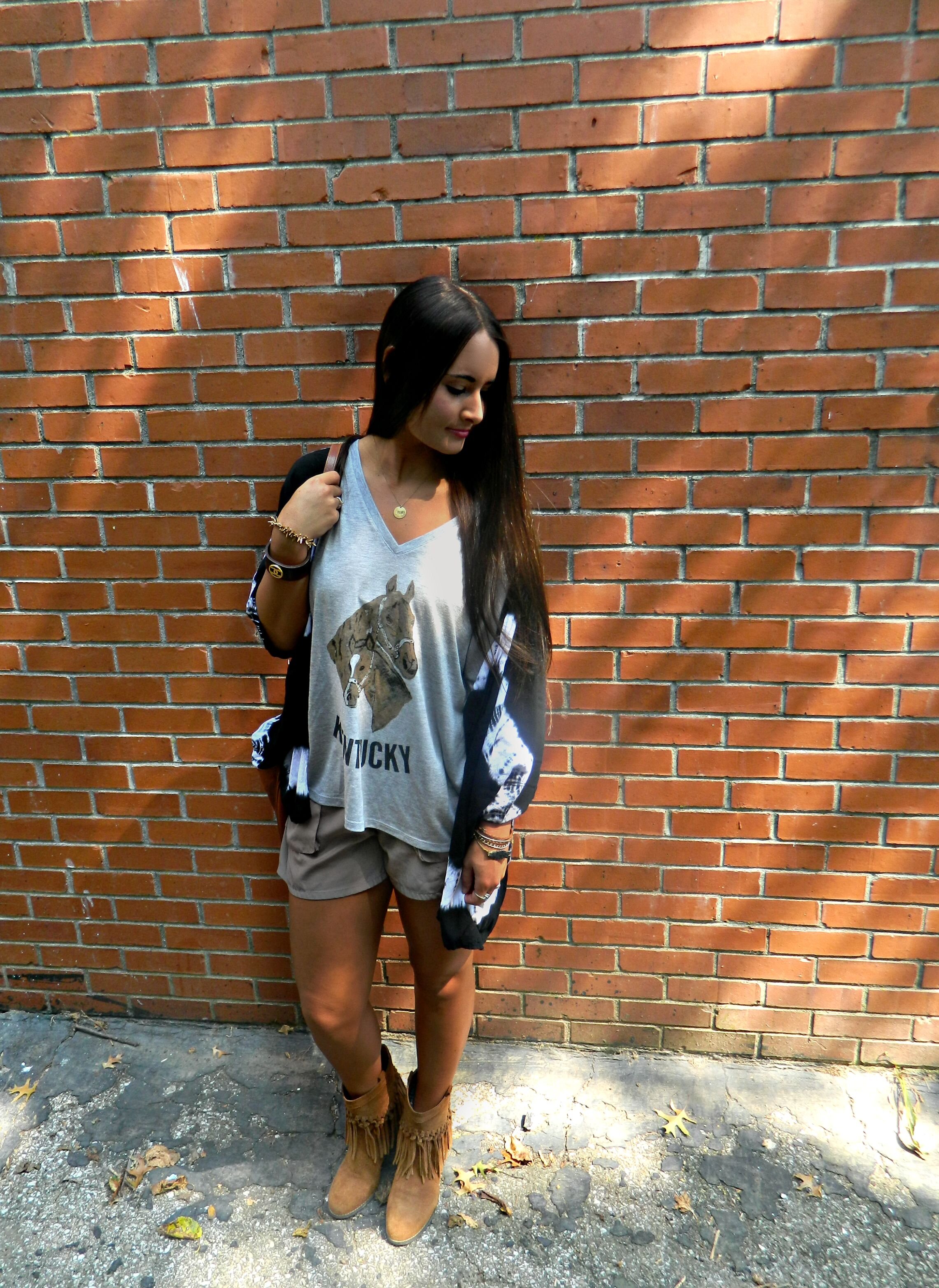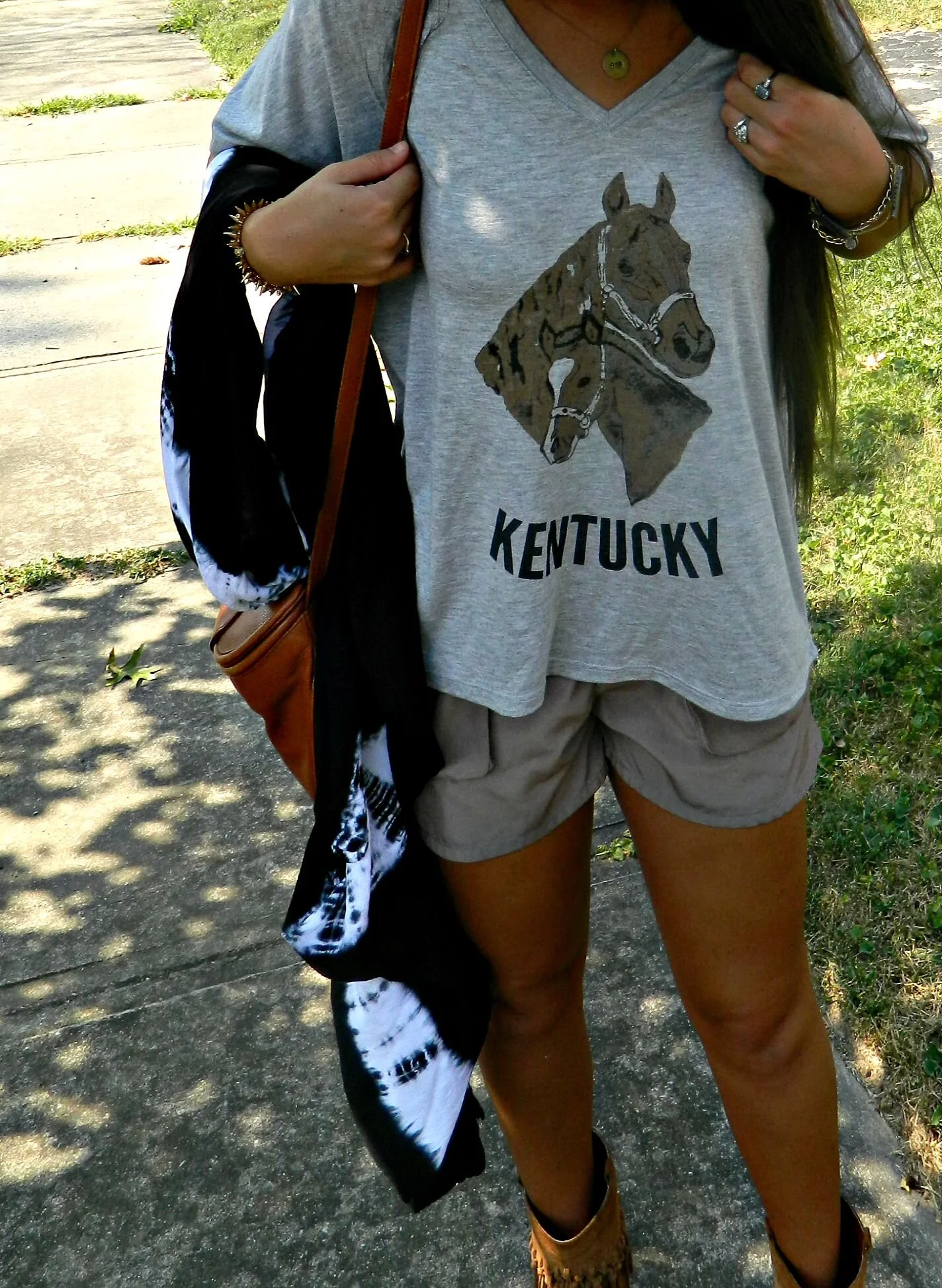Sometimes a vintage tee is just too good to not share! Like the Kentucky souvenir horse tee that I found a few years back at a church yard sale. I squealed out loud when I uncovered it in the piles of clothes stacked on fold-out tables in the church rec room. I was so pleased with my 10 cent treasure which was already perfectly worn-in and faded, and I wore it constantly. I always got so many compliments on it and everyone wanted to know where they could get one. So when the wonderful folks at Kentucky Brewed Tees offered to print some custom tees for us, it was the first thing that came to my mind! They worked so hard to perfectly reproduce all the details of the original tee and I am so thrilled with how they turned out. They are available in three different styles that all take on a totally different look: classic baseball tees, retro ringer tees, and these super modern slouchy v-neck tees. This slouchy tee is my new FAVE t-shirt- it is SO comfy and soft and has the most flattering cut that you can dress up or down. I gave it a boho-chic spin by pairing it with some shorts and a printed kimono, my favorite fringe boots, vintage horse purse, and an armful of bangles. Shorts with boots is my favorite outfit combo for transitioning into fall. The easiest way to make this look work is by wearing a long-sleeve on the top and keeping the silhouette slouchier and less-fitted from the waist up. Which of the new tees is your favorite? I can't wait to see how you style them too!
