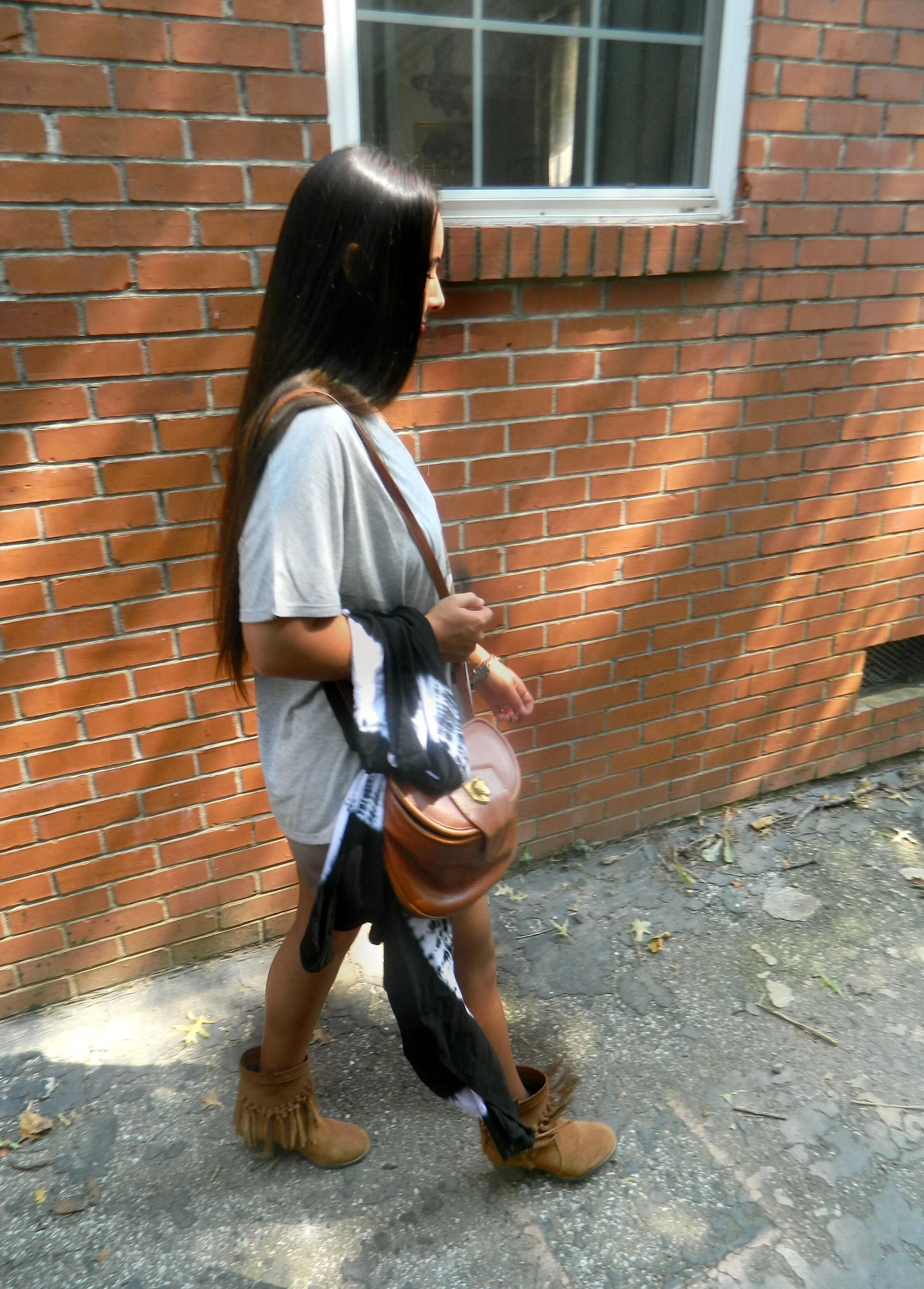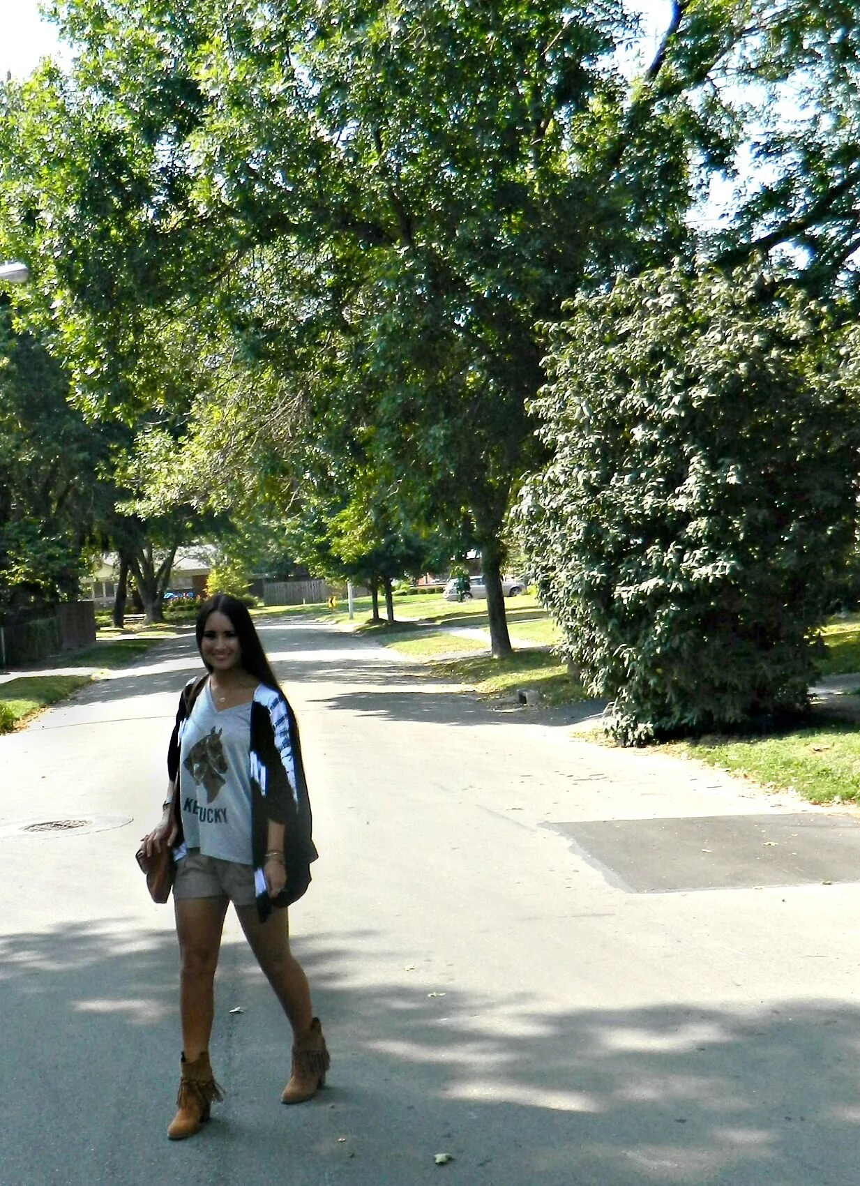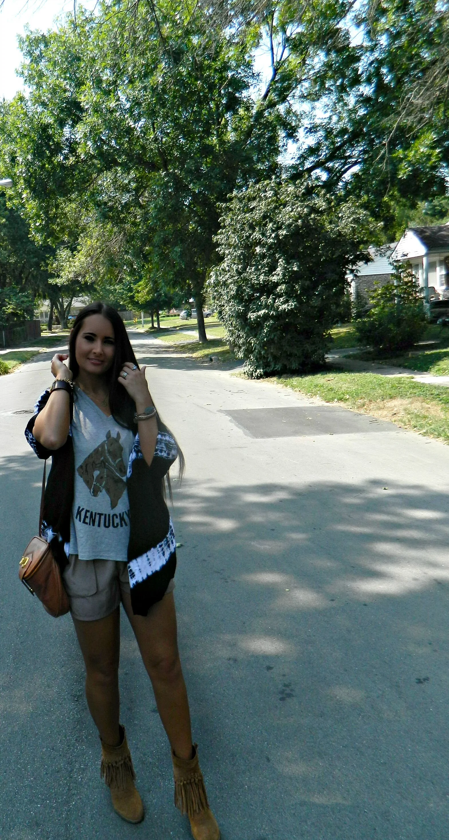 Sometimes a vintage tee is just too good to not share! Like the Kentucky souvenir horse tee that I found a few years back at a church yard sale. I squealed out loud when I uncovered it in the piles of clothes stacked on fold-out tables in the church rec room. I was so pleased with my 10 cent treasure which was already perfectly worn-in and faded, and I wore it constantly. I always got so many compliments on it and everyone wanted to know where they could get one. So when the wonderful folks at Kentucky Brewed Tees offered to print some custom tees for us, it was the first thing that came to my mind! They worked so hard to perfectly reproduce all the details of the original tee and I am so thrilled with how they turned out. They are available in three different styles that all take on a totally different look: classic baseball tees, retro ringer tees, and these super modern slouchy v-neck tees. This slouchy tee is my new FAVE t-shirt- it is SO comfy and soft and has the most flattering cut that you can dress up or down. I gave it a boho-chic spin by pairing it with some shorts and a printed kimono, my favorite fringe boots, vintage horse purse, and an armful of bangles. Shorts with boots is my favorite outfit combo for transitioning into fall. The easiest way to make this look work is by wearing a long-sleeve on the top and keeping the silhouette slouchier and less-fitted from the waist up. Which of the new tees is your favorite? I can't wait to see how you style them too!