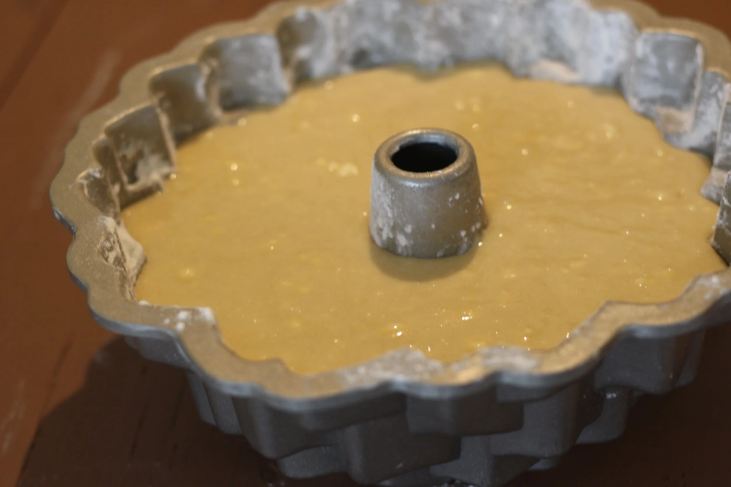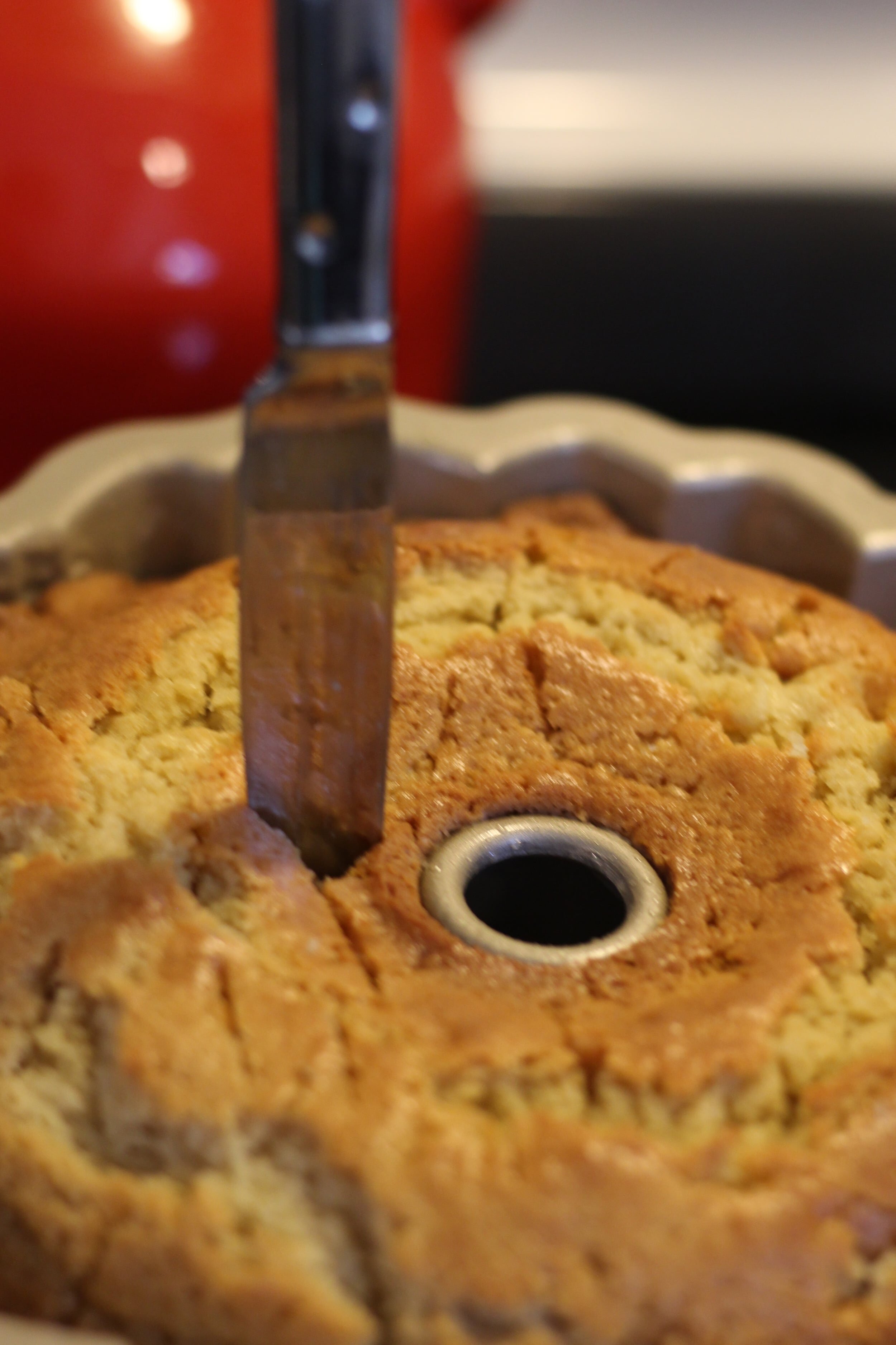 Pour your batter into your greased bundt pan. Bake at 325 for 65-75 minutes or until an inserted toothpick comes out clean.