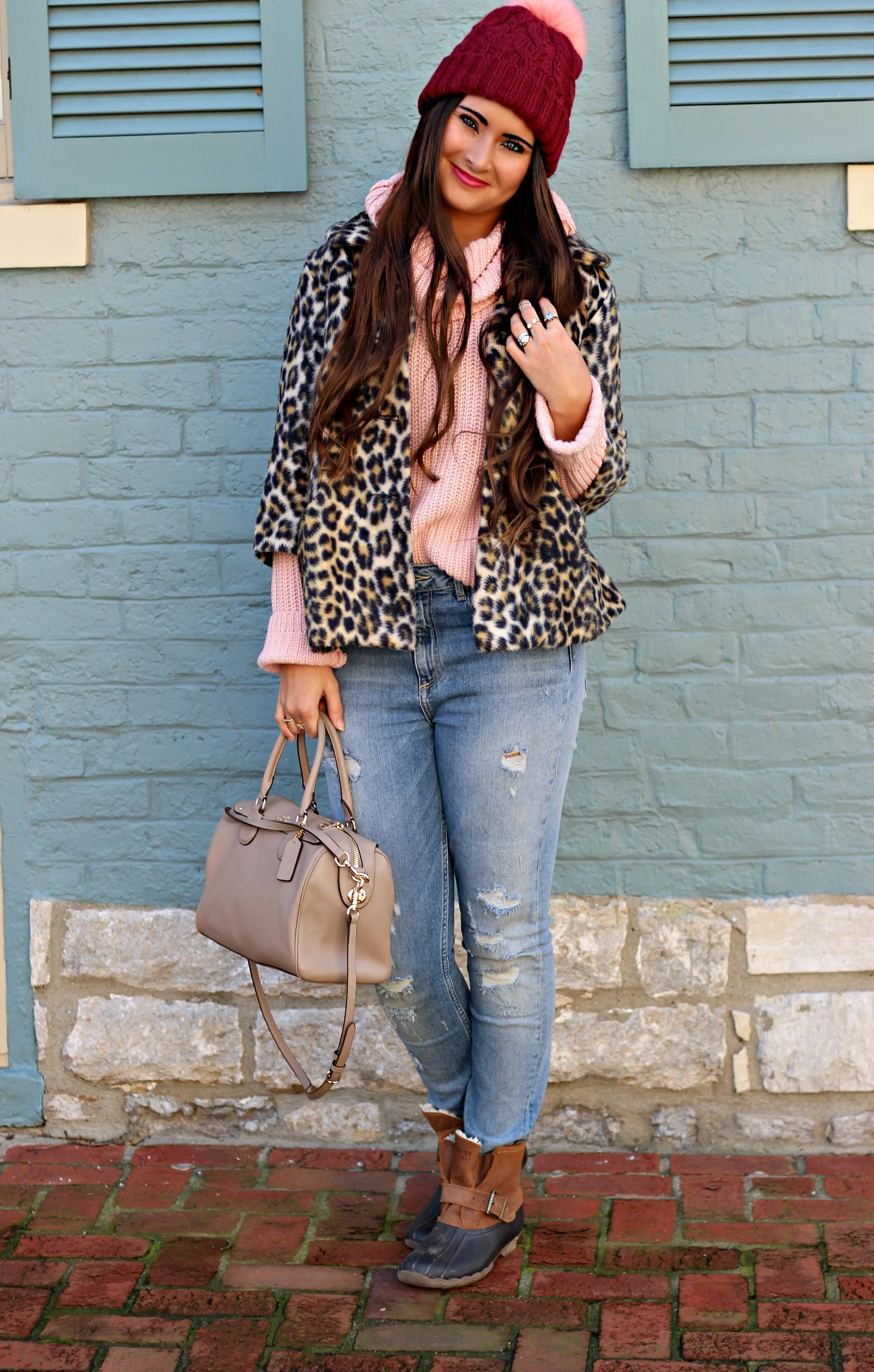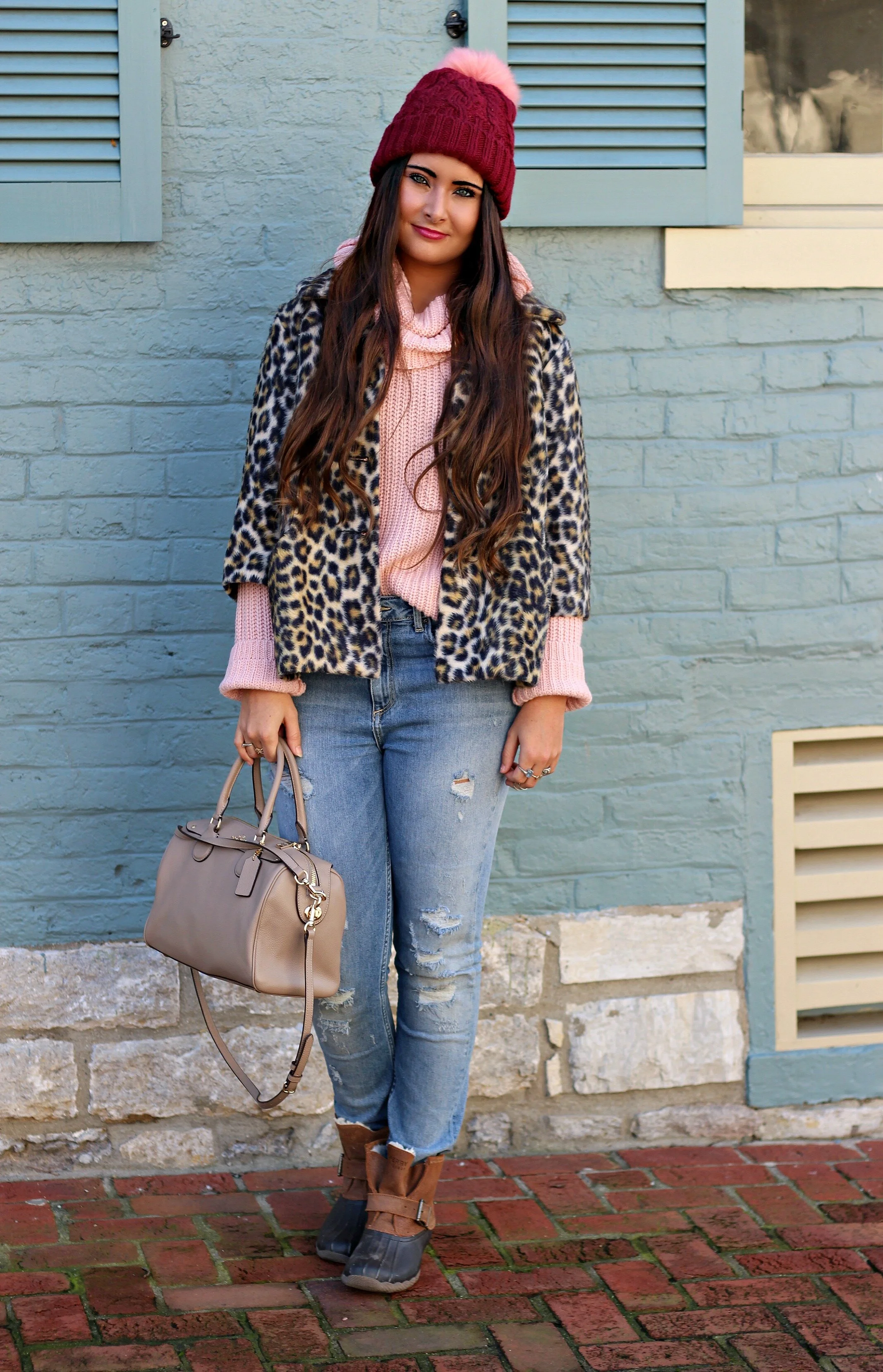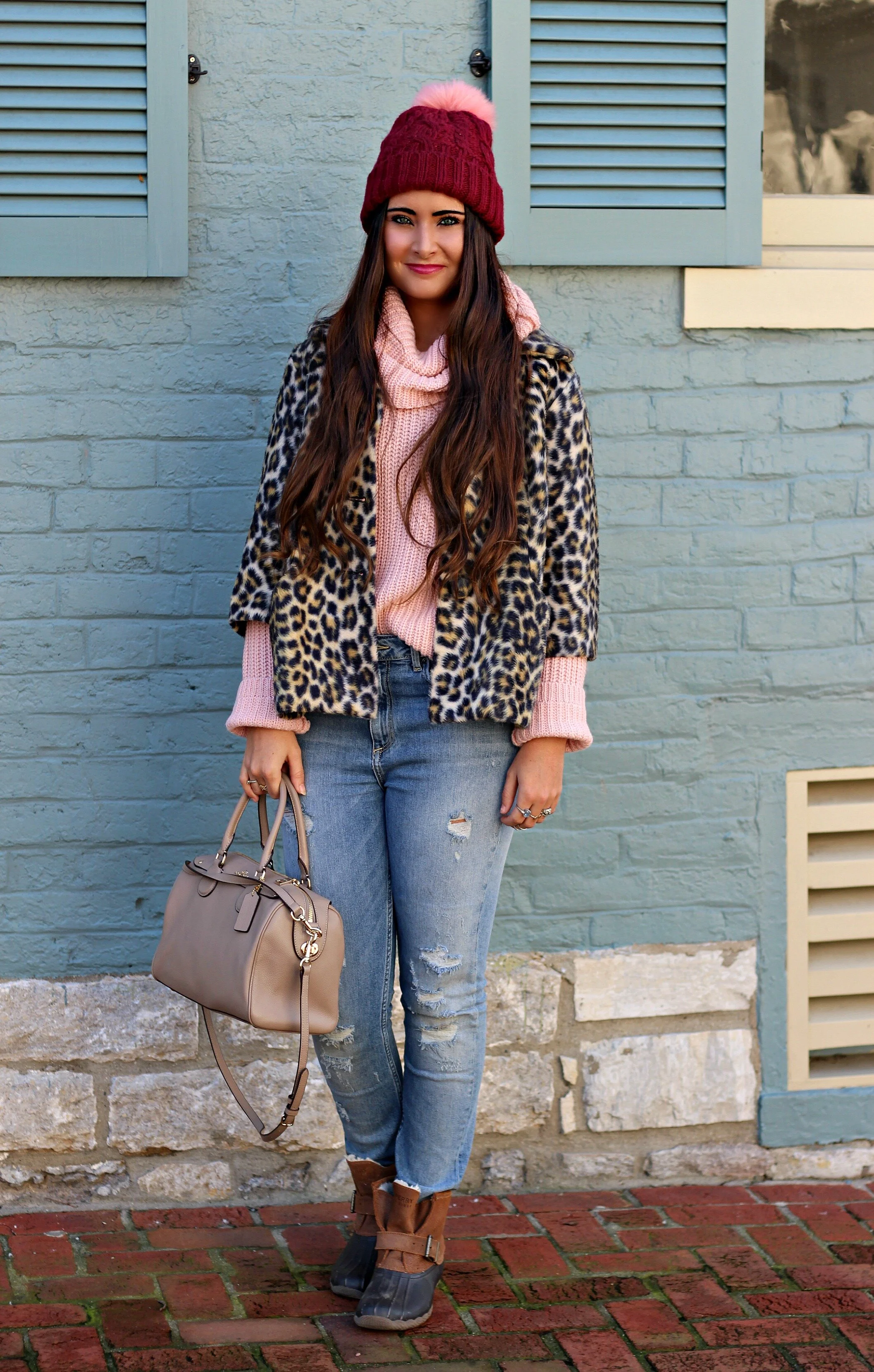 Nothing brightens up a winter wardrobe like a pop of cotton-candy pink! Chunky knits also seem extra cozy in pale pastels and pair oh-so perfectly with faux furs and animal print jackets. I just love the color combination and cheerful look of this fur pom beanie from Anthropologie- I seen to keep planning all my outfits around it lately. It's currently unavailable online, but check your local stores and they may have a few left (it came in several different but equally adorable color combinations!). I paired it with one of my favorite slouchy knit sweaters (from Target last year- similar here), and H&M jeans. For an extra pop of pattern I threw on this vintage leopard coat, one of my treasured vintage staples that I found many years ago at a flea market (for $10!). Finally, if you are looking to buy some duck boots this season, I highly recommend the Rip Water Duck Boots from Sperry. They are shorter than the traditional duck boot, you can slip them on so easily, and they are lined in the softest, warmest shearling- truly the perfect winter boot. They are so comfortable that I end up wearing them all day and forget that I have them on!