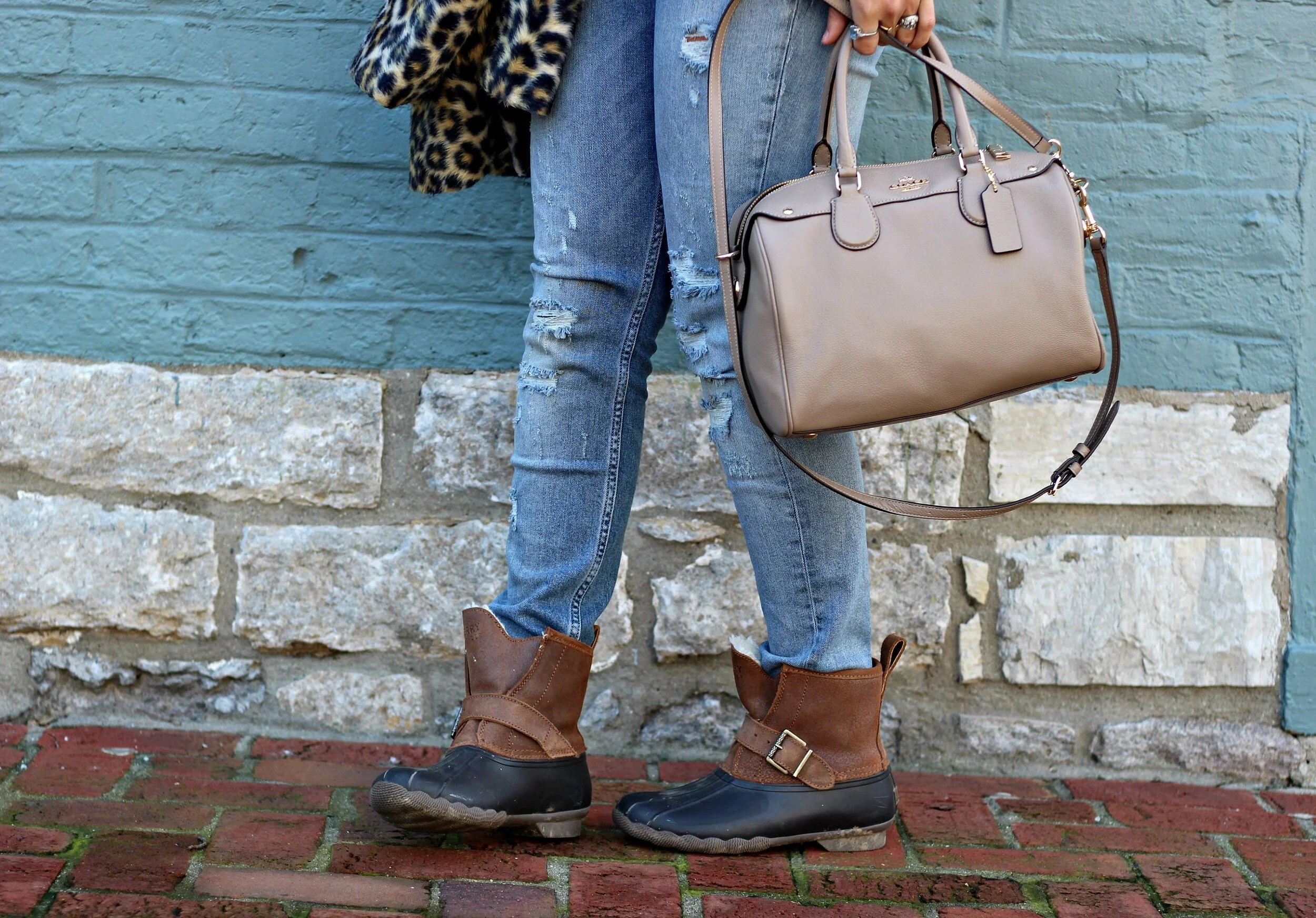 Fur Pom Hat: Anthropologie (similar here) | Slouchy Turtleneck: Target (old- similar here) | Rip Water Duck Boots: Sperry | Leopard Coat: Vintage (similar here) | Denims: H&M Slim High Ankle Trashed Jean | Purse: Coach Prairie Satchel