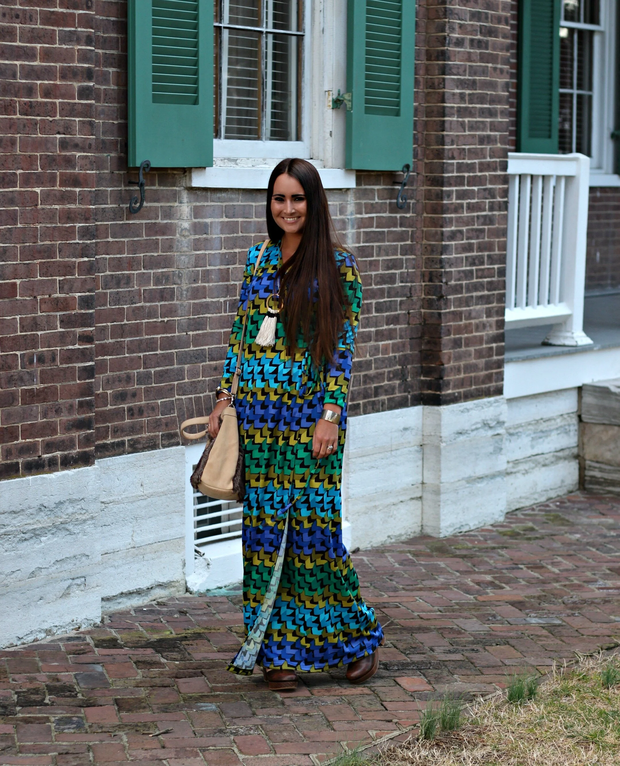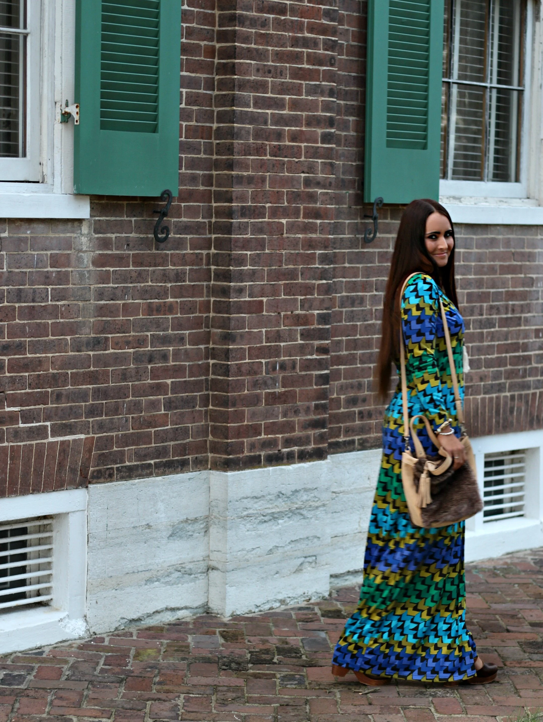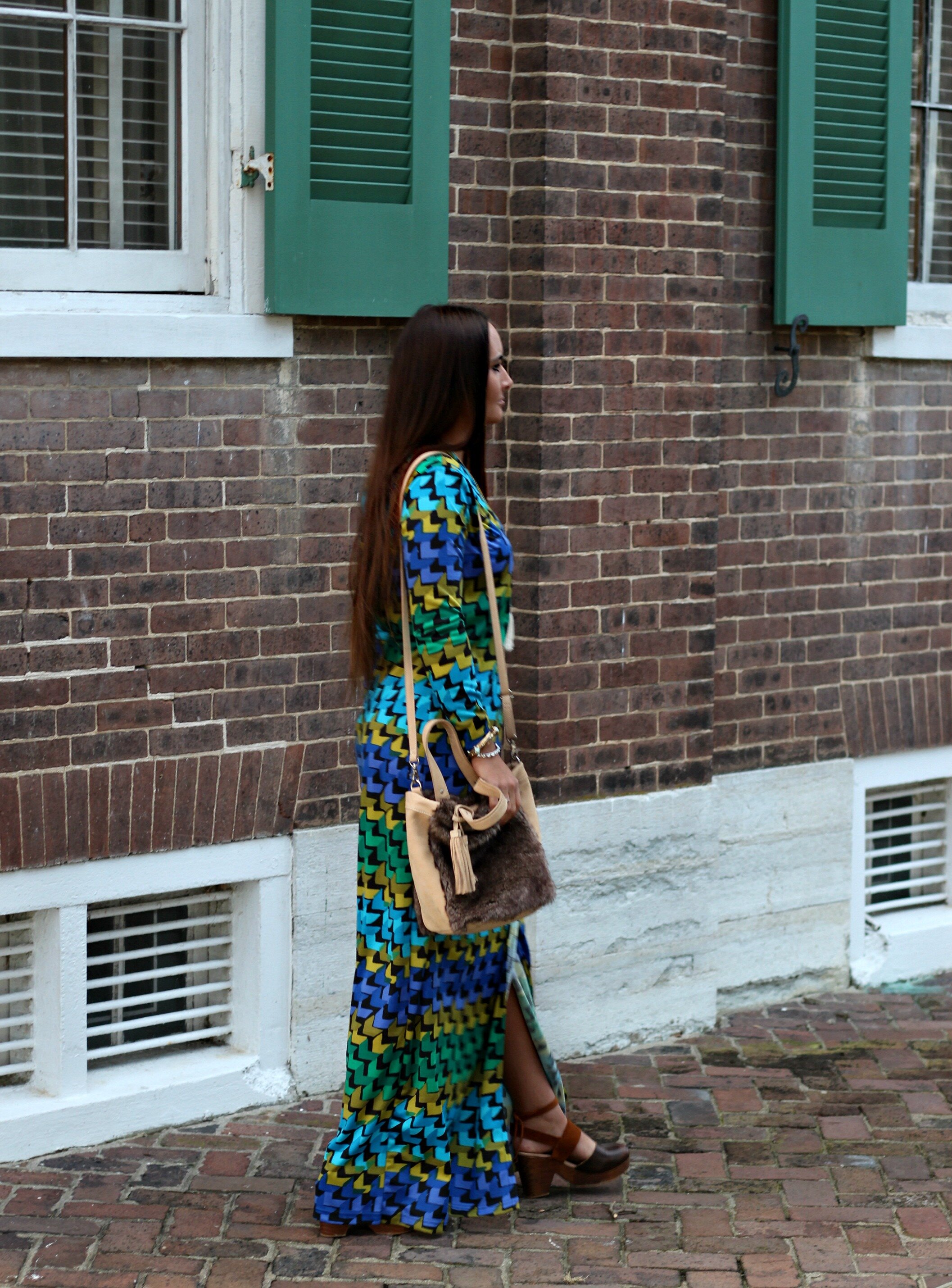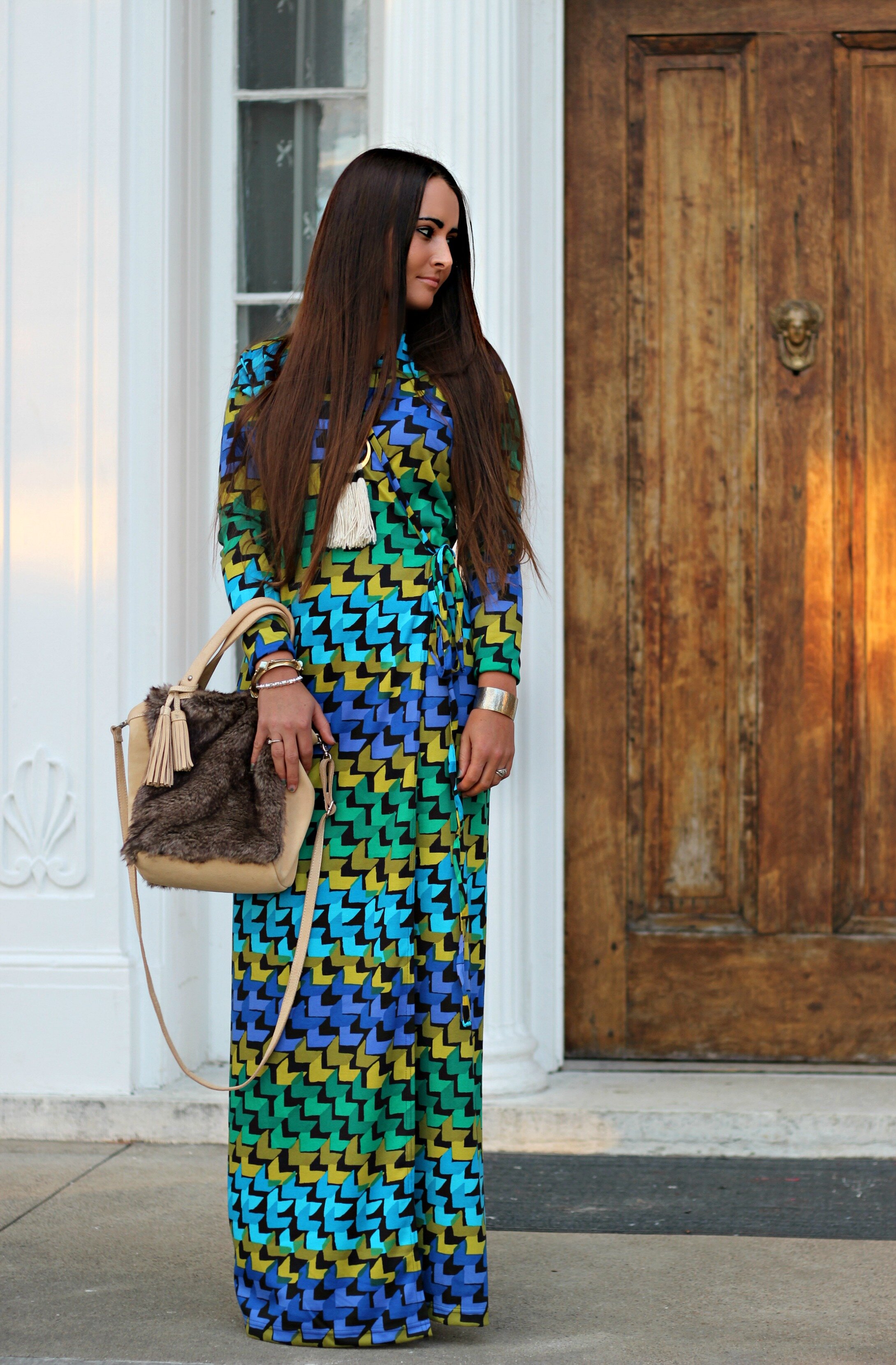 The wrap dress is one of the most classic and versatile silhouettes of all time that is flattering on just about every body type. Though the style originated in the 1930's-40s, fashion designer Diane von Fürstenberg is most well-known for "inventing" the wrap dress. Her signature printed wrap dresses premiered in the early 70's and are still extremely popular today. I immediately fell in love with this bright and bold wrap dress from The Shabby Apple boutique because of the classic vintage-inspired silhouette and bohemian print. The Shabby Apple is the cutest online boutique that specializes in vintage-inspired clothing and swimwear, and I am so thrilled to have found them! I played up the 70's bohemian vibe of the dress with these Free People leather clogs, faux fur Anthropologie purse, tassel necklace, and vintage bangles. The material of this maxi is so soft and comfortable, and also casual enough to dress up or down. Did I mention the dress is also long-sleeve so it's perfect for year-round wear? Be sure to check out Shabby Apple for more adorable wrap dresses, maxis, and more!