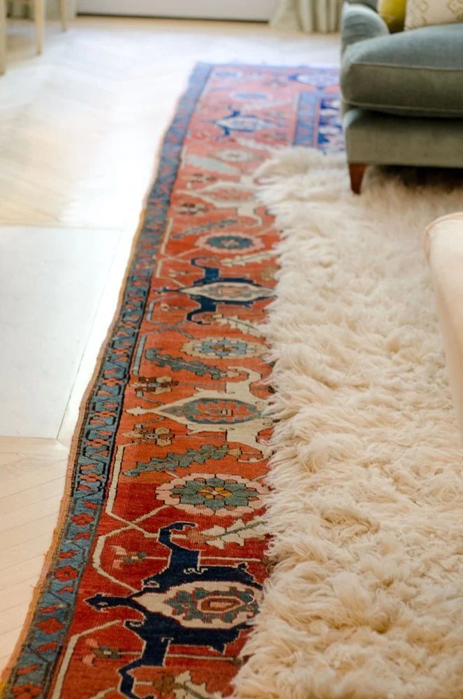 Vintage rugs are a rare find but one of the most coveted vintage items that make such a huge impact in a space. What makes a vintage rug any better than a brand new one? It's hard to duplicate the gorgeous and unique colors, designs, and worn-in look that vintage rugs have. For this reason, I much prefer vintage rugs because they instantly give a room that cozy, lived-in look. I've shared my love of sheepskins on the blog before, but when we found this full-size vintage lambskin rug, I was overflowing with design inspiration. Texture is such a huge element of styling your home and a sheepskin is such an effortless way to add it! Check out some of my favorite ways to style this piece below and you can shop multiple sizes and shapes of sheepskin rugs in our shop!