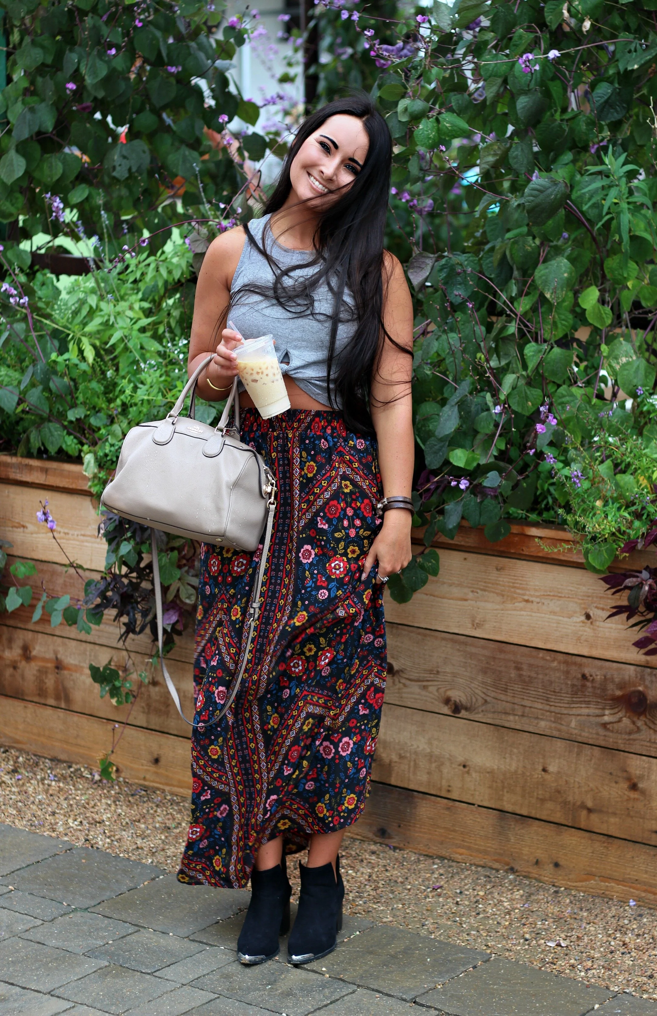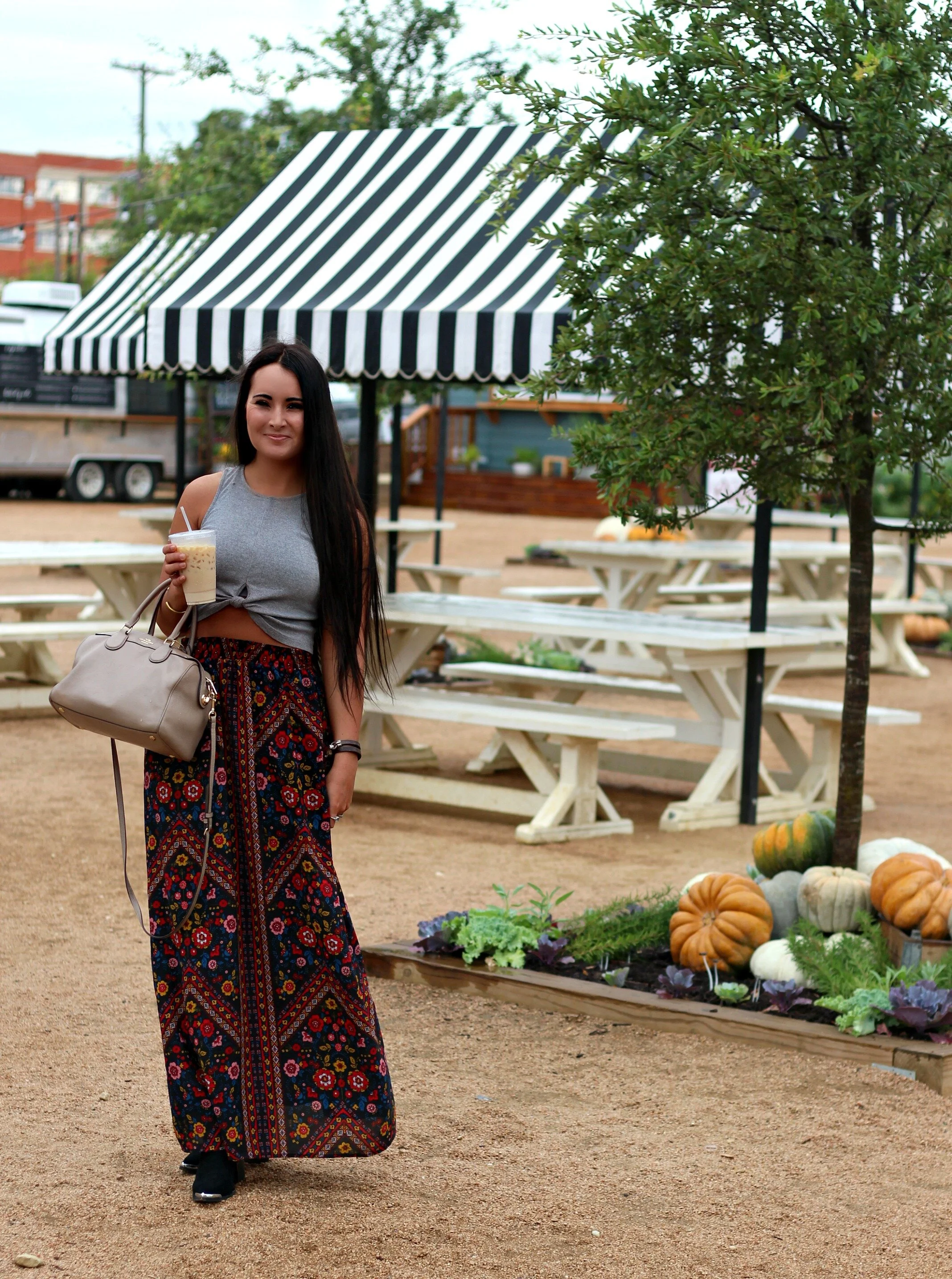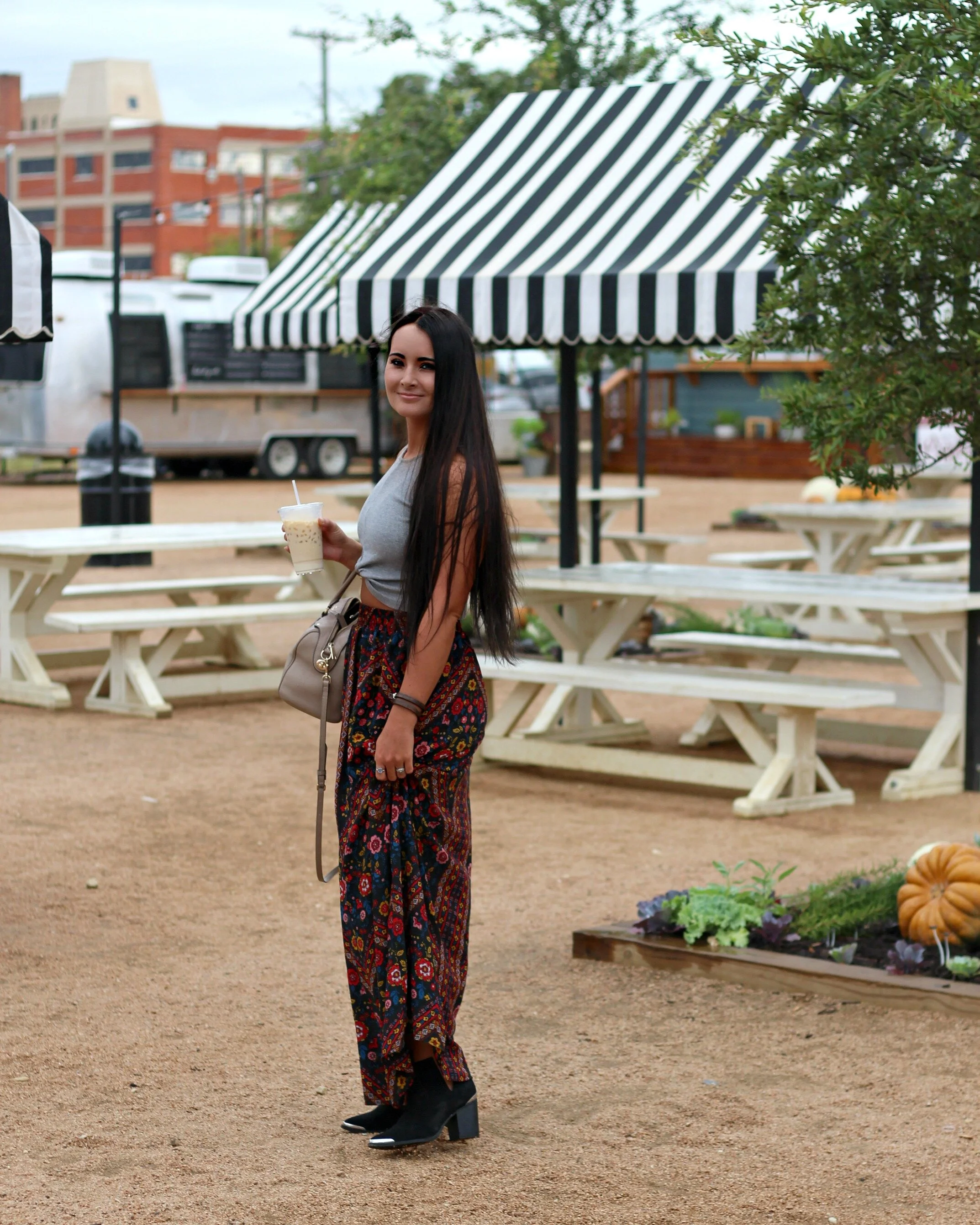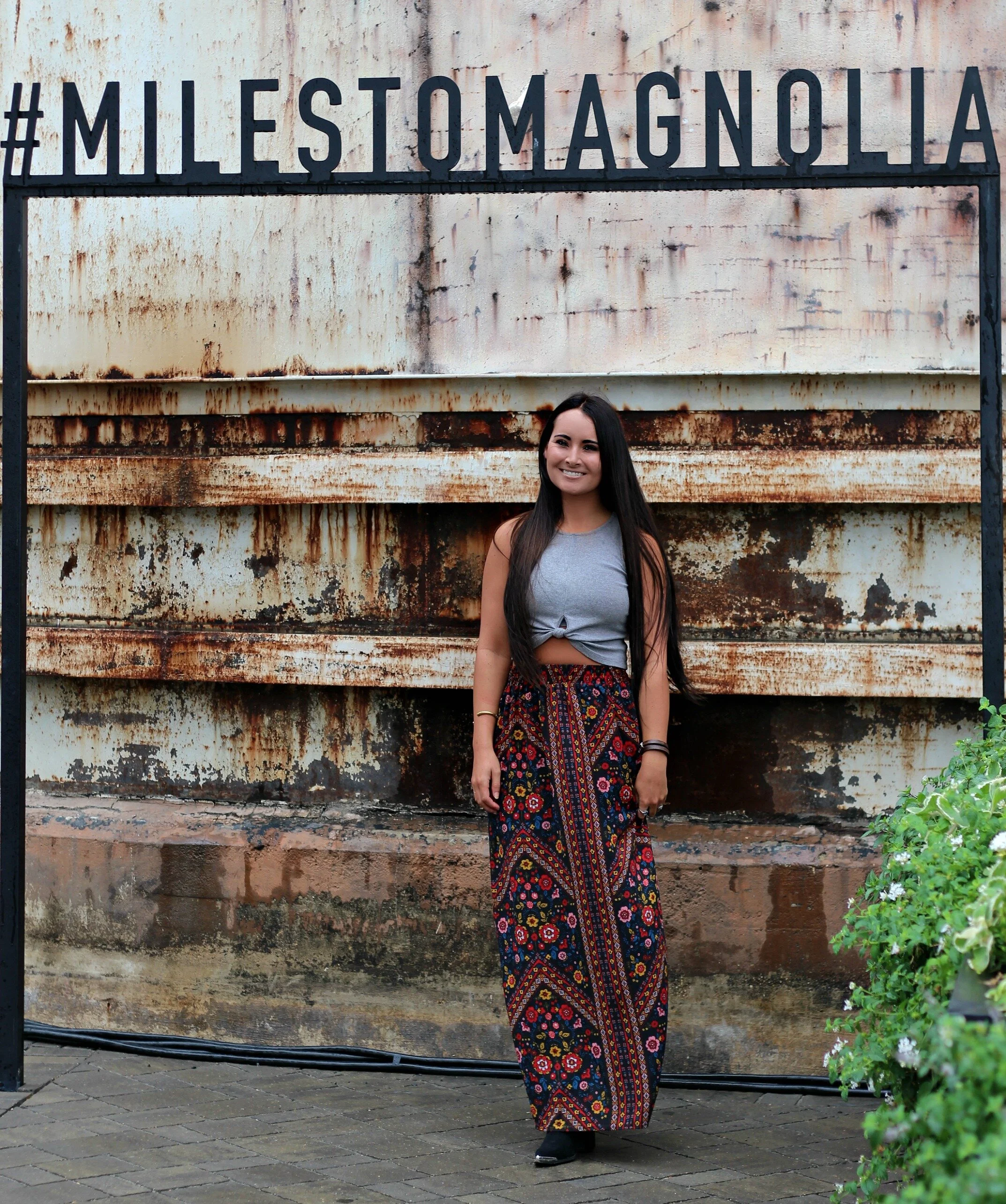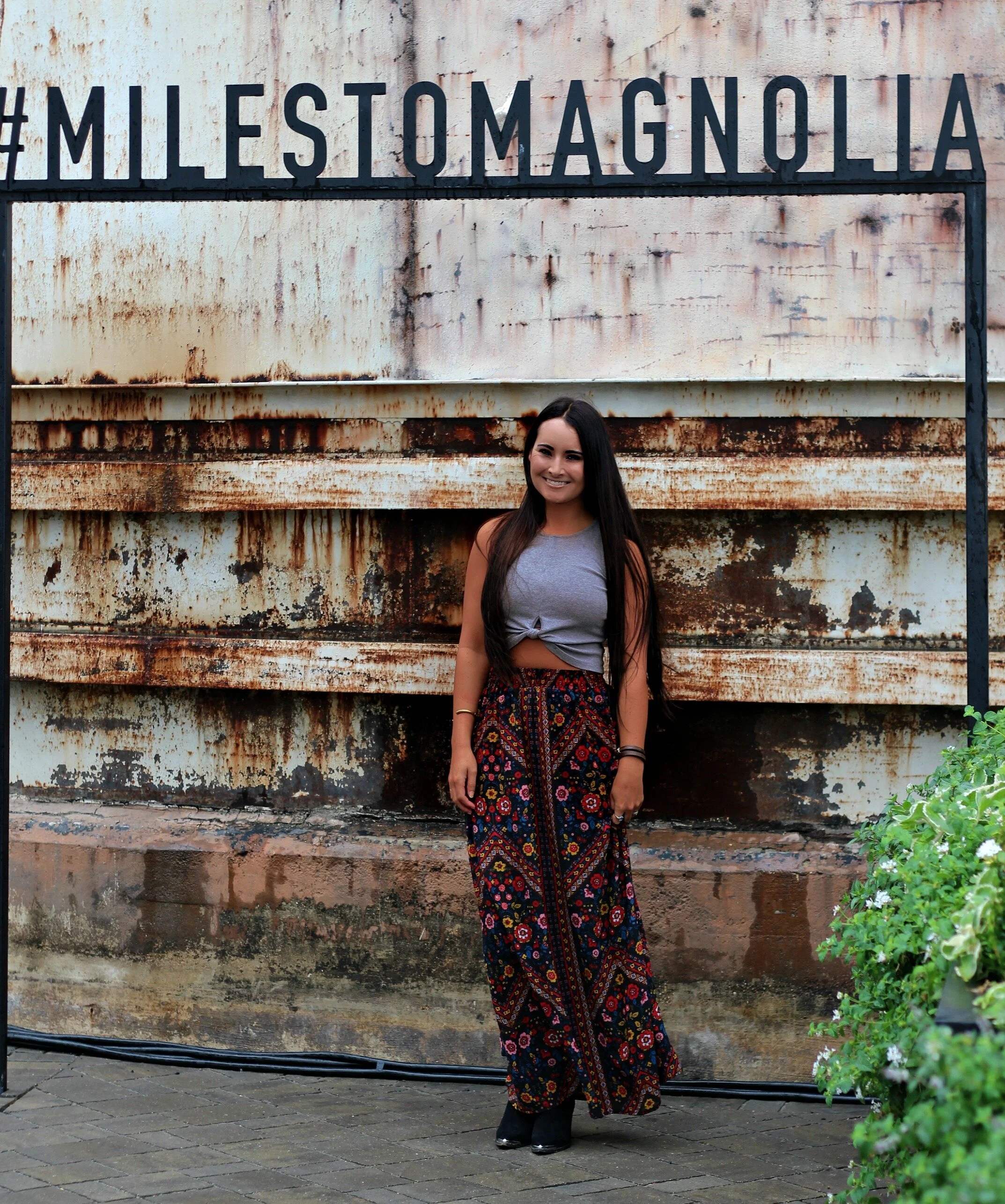 I still feel like this entire weekend was a dream! Everything about the Magnolia market and Silobration was just perfect and so magical. I feel so blessed to have been able to finally visit this place in person that I have admired from afar for so long and followed so closely. Every inch of the grounds is meticulously designed and cared for, and you can see Chip and Joanna's fingerprints on every detail. I'll be sharing more details about our entire Waco visit on the blog this week, but for now I wanted to begin by sharing one of my outfits from the trip! We got lucky with some great weather and it was pretty mild and perfect in Waco the entire weekend. I packed this fall floral maxi because I knew I could pair it with a variety of different tops whether it was warm or a little cooler out. I love the vintage-looking print that is so reminiscent of 70's florals! Of course I had to wear my boots in Texas so I paired it with my favorite western booties and a simple little crop top. A perfect little outfit for browsing the market, walking through the silo grounds, and exploring Waco. I'm already planning my next trip back!