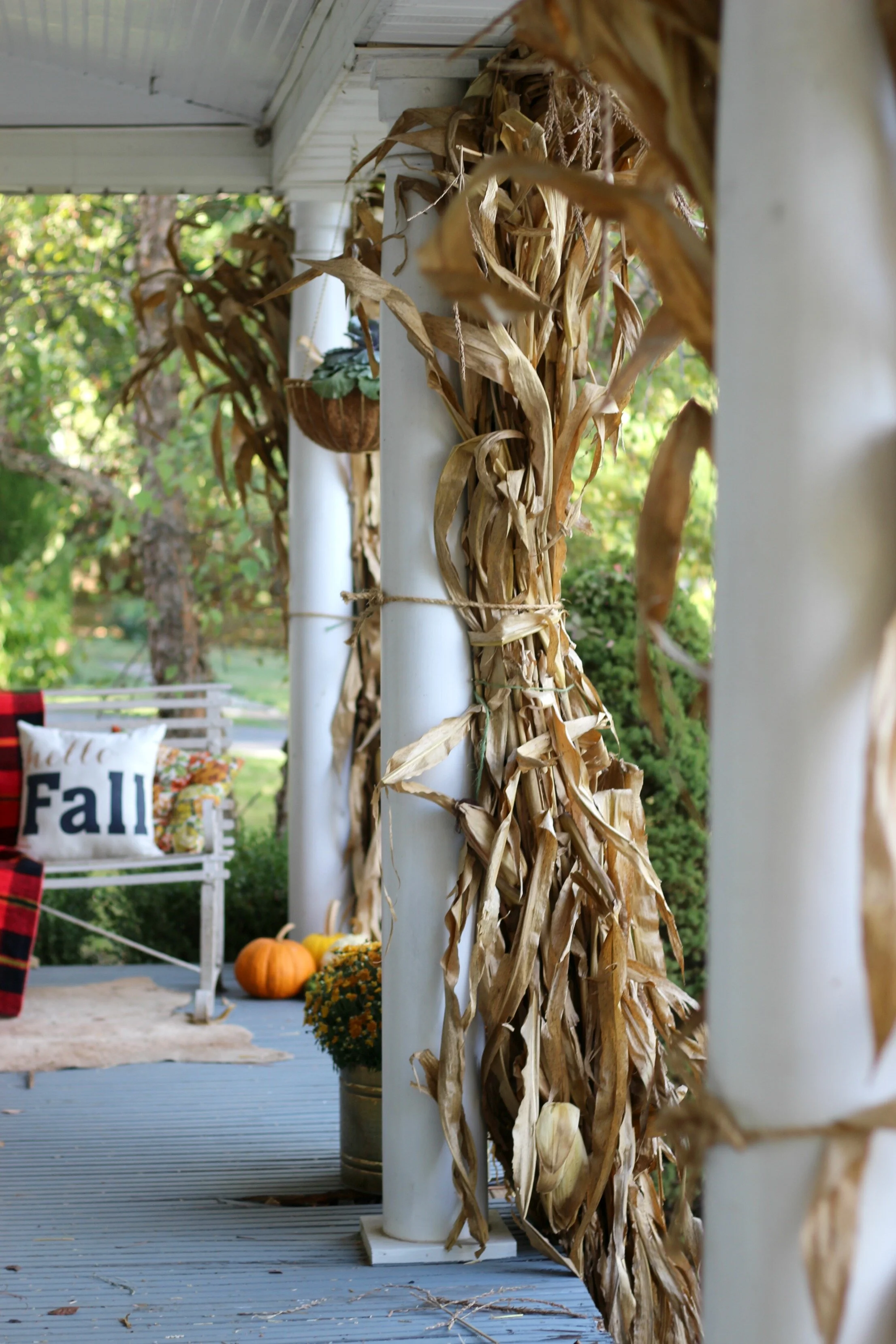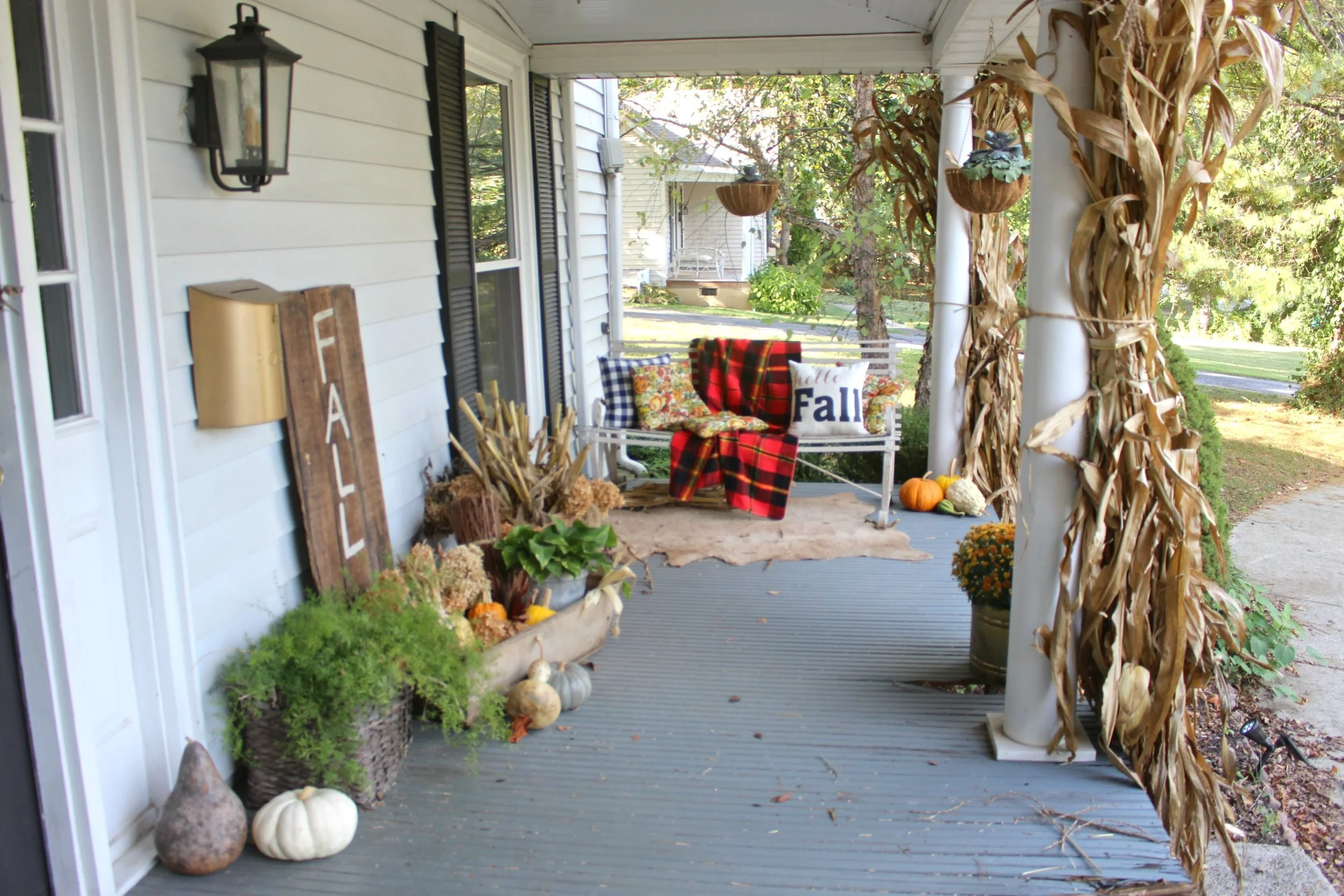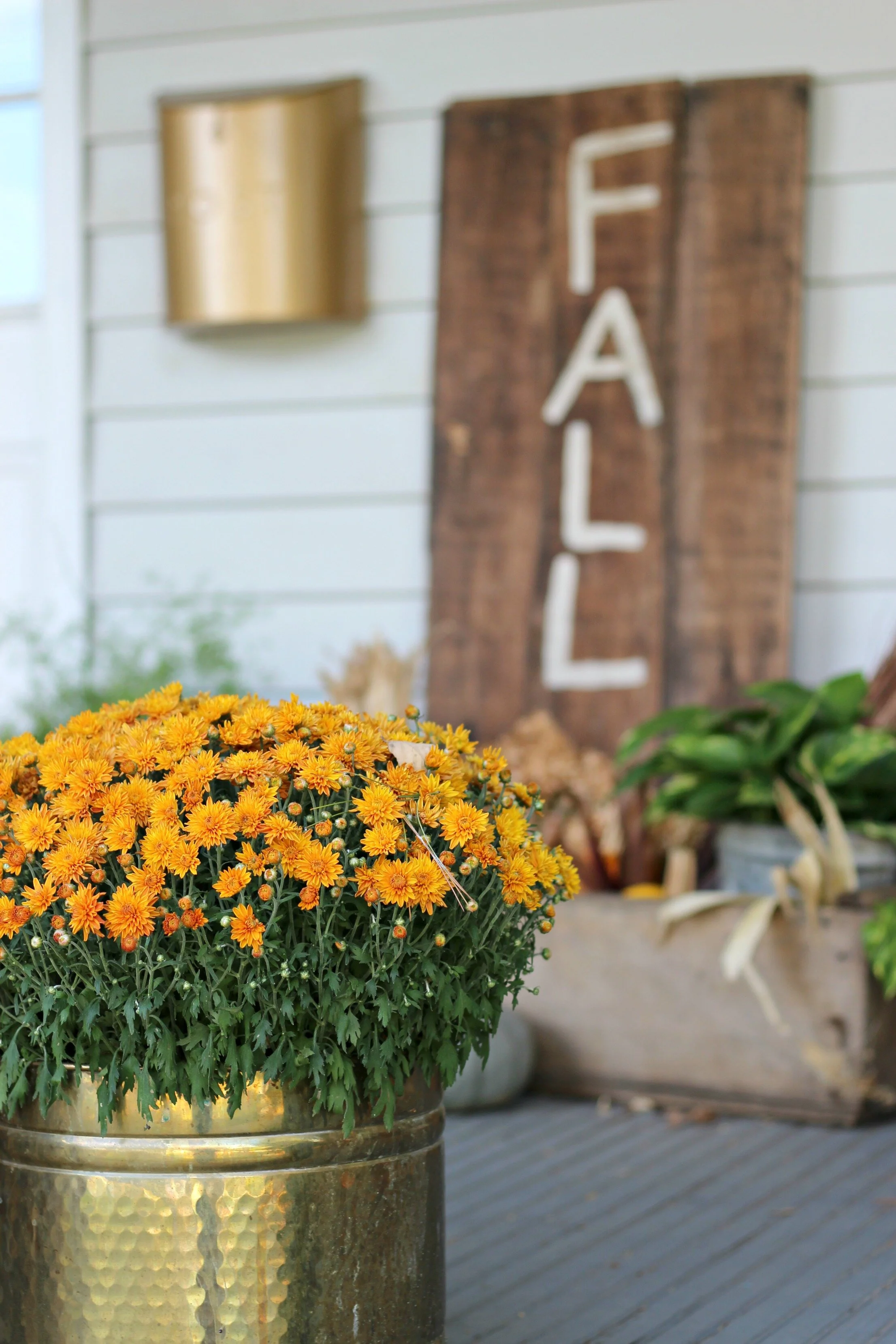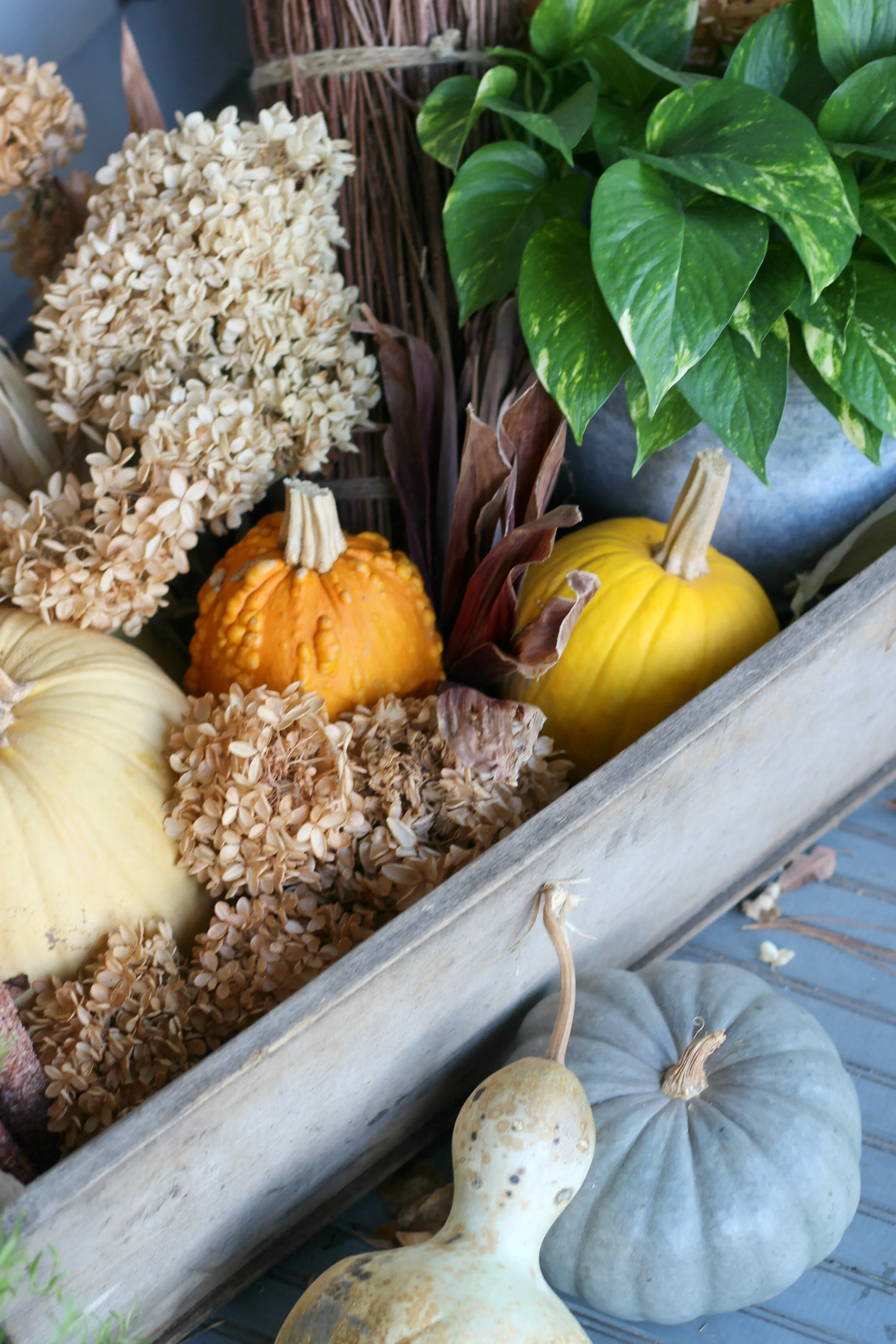 No southern porch is complete without some mums and I love the pop of color they add especially in these vintage brass planters. This little area by the door is probably my favorite little vignette on the porch. I used an old piece of barnwood to make this vertical sign a couple years back. It says "FALL" on one side and "JOY" on the other so I can use it for both fall and Christmas decorating. In front of it I used an old wooden trough to hold some pumpkins, gourds, plant, sticks, and dried hydrangeas. I also used a vintage basket beside it to hold a cluster of some more dried hydrangeas (I can't ever get enough!) and cornstalks.