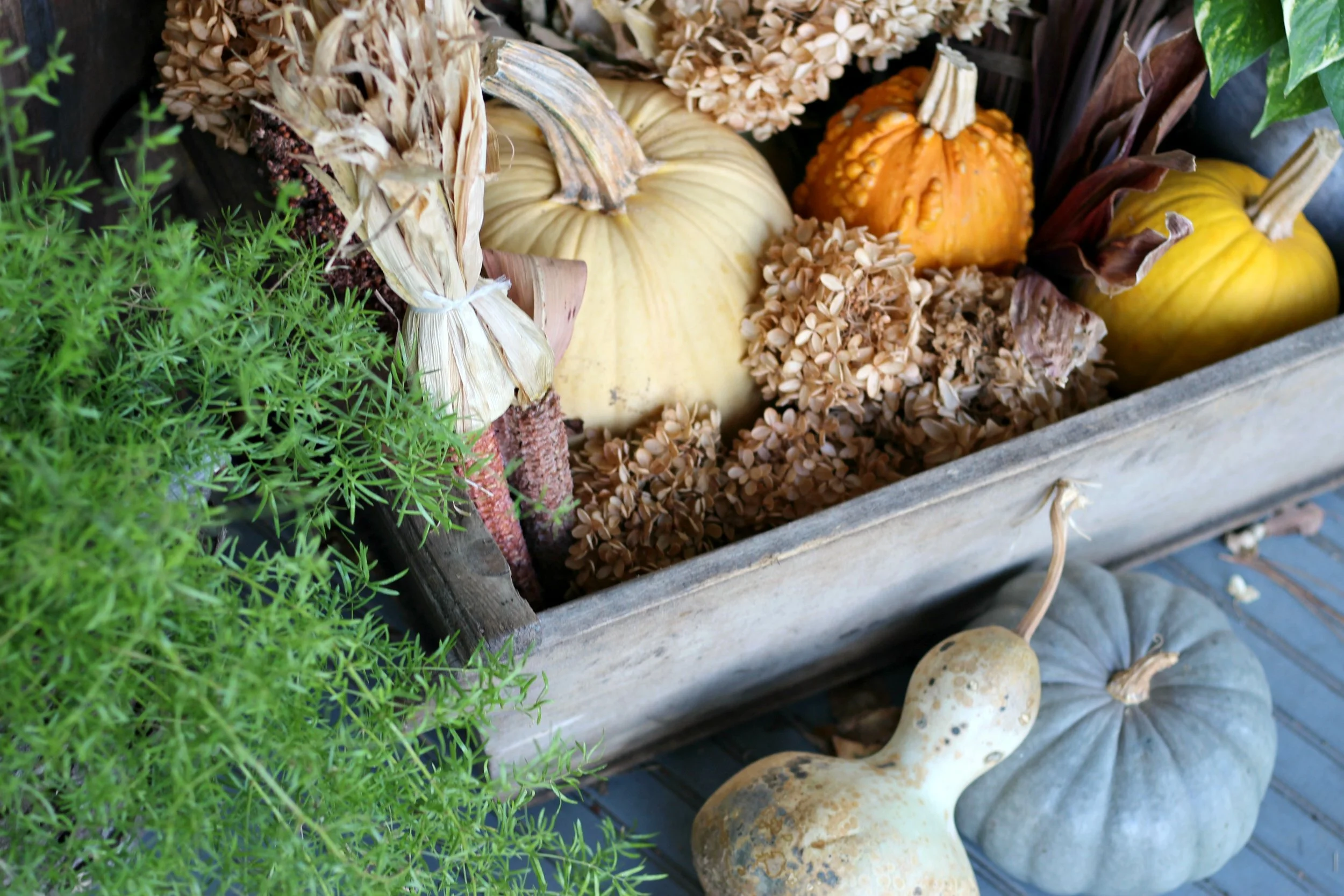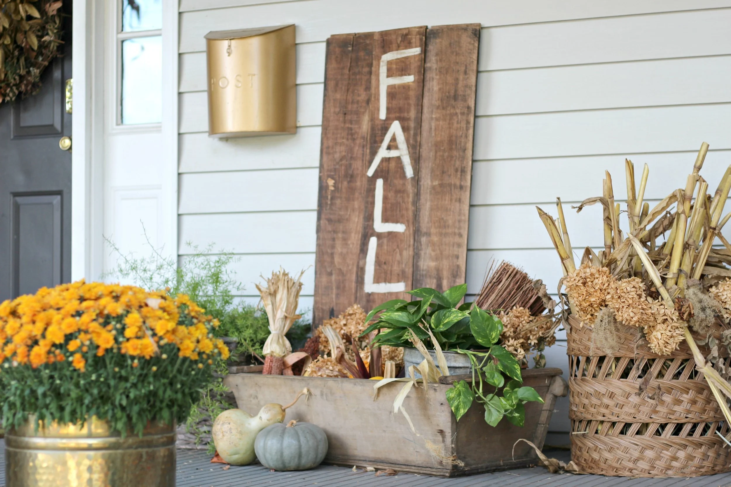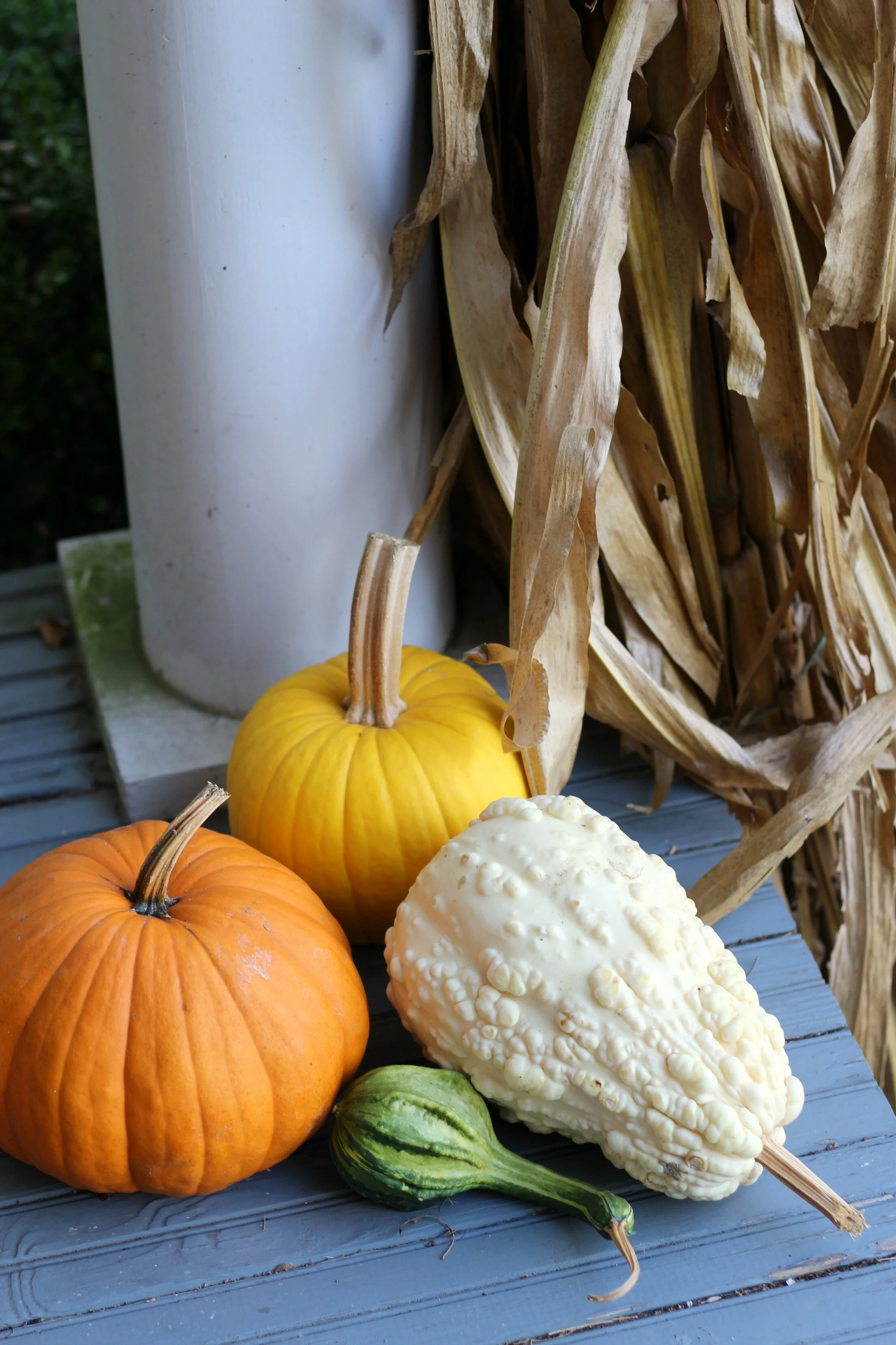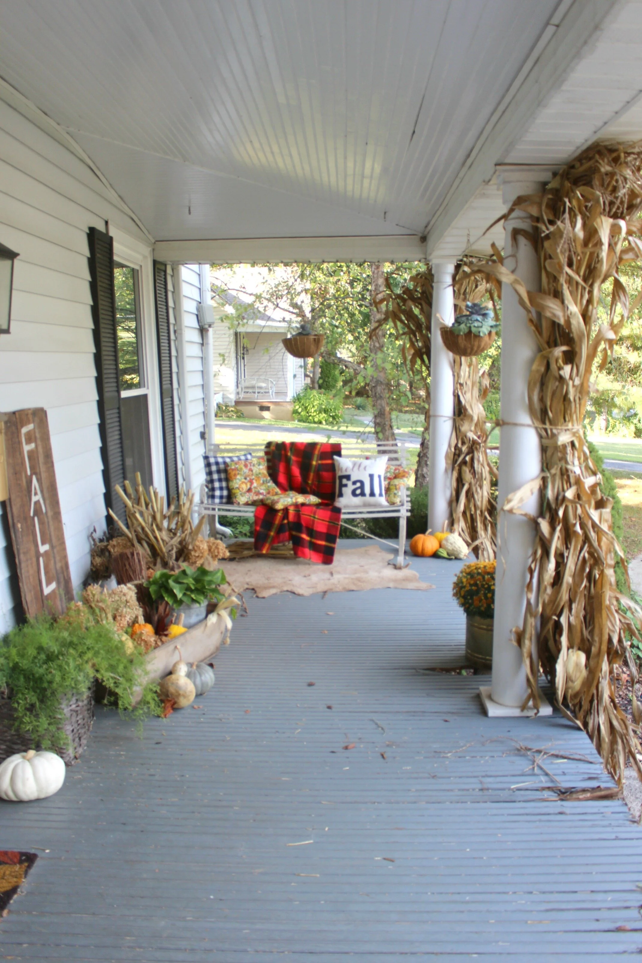 No southern porch is complete without some mums and I love the pop of color they add especially in these vintage brass planters. This little area by the door is probably my favorite little vignette on the porch. I used an old piece of barnwood to make this vertical sign a couple years back. It says "FALL" on one side and "JOY" on the other so I can use it for both fall and Christmas decorating. In front of it I used an old wooden trough to hold some pumpkins, gourds, plant, sticks, and dried hydrangeas. I also used a vintage basket beside it to hold a cluster of some more dried hydrangeas (I can't ever get enough!) and cornstalks.