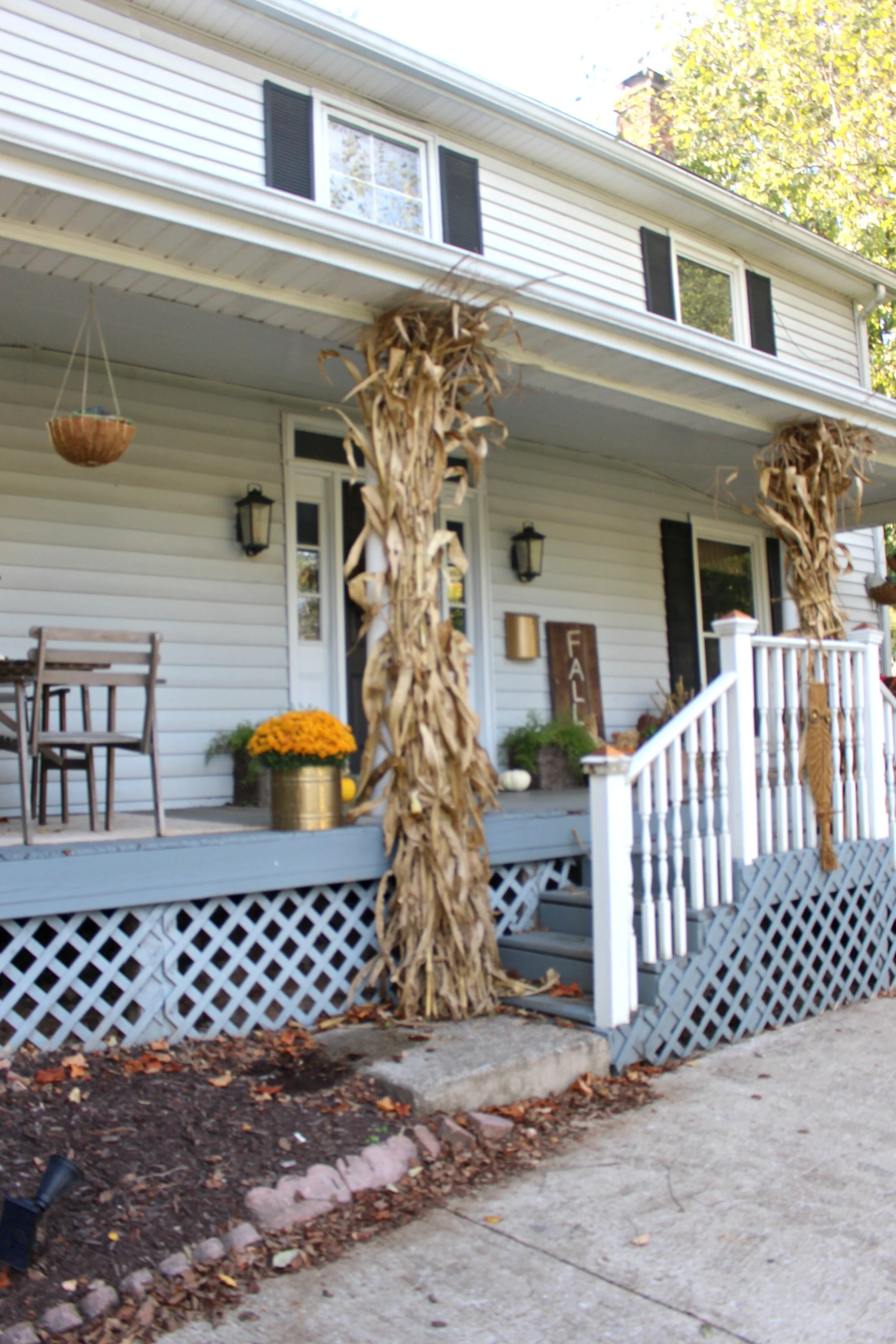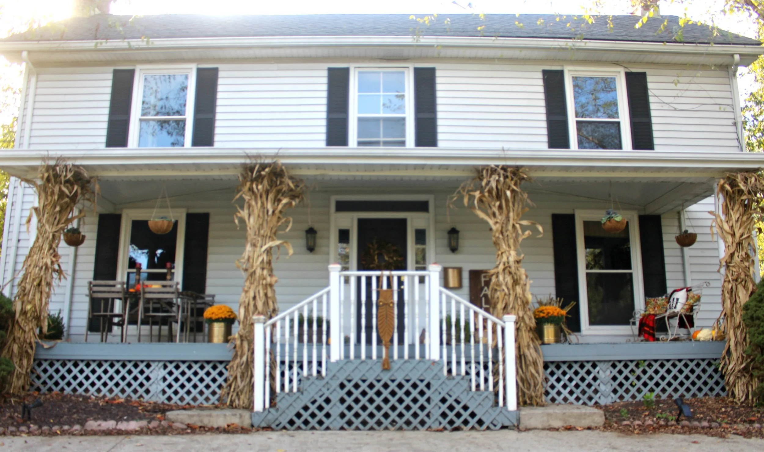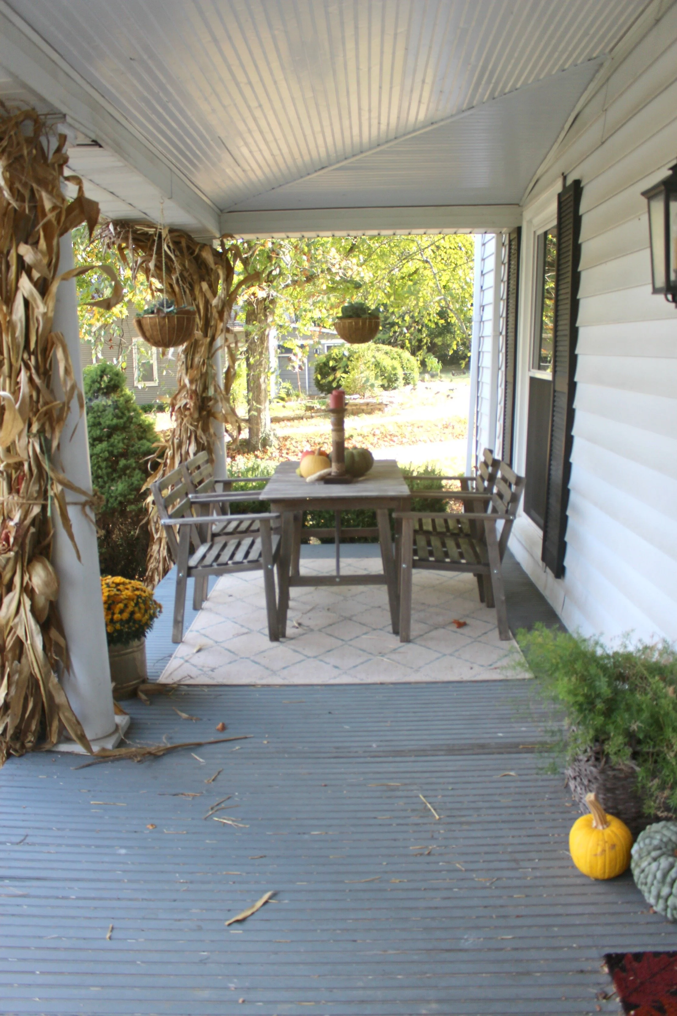 One of my favorite part of the new house is our giant front porch! Even though the old floor boards need a little work (hopefully will get to this next spring/summer), it is such a wonderful space to have and fun area to decorate! Right now we have one side set up with a small table and chairs and the other with a bench. We eventually want to definitely get a hanging porch swing for here. The center of the porch is where our front door is and there are a double set of stairs leading up to the porch from the circular driveway in front of our house.