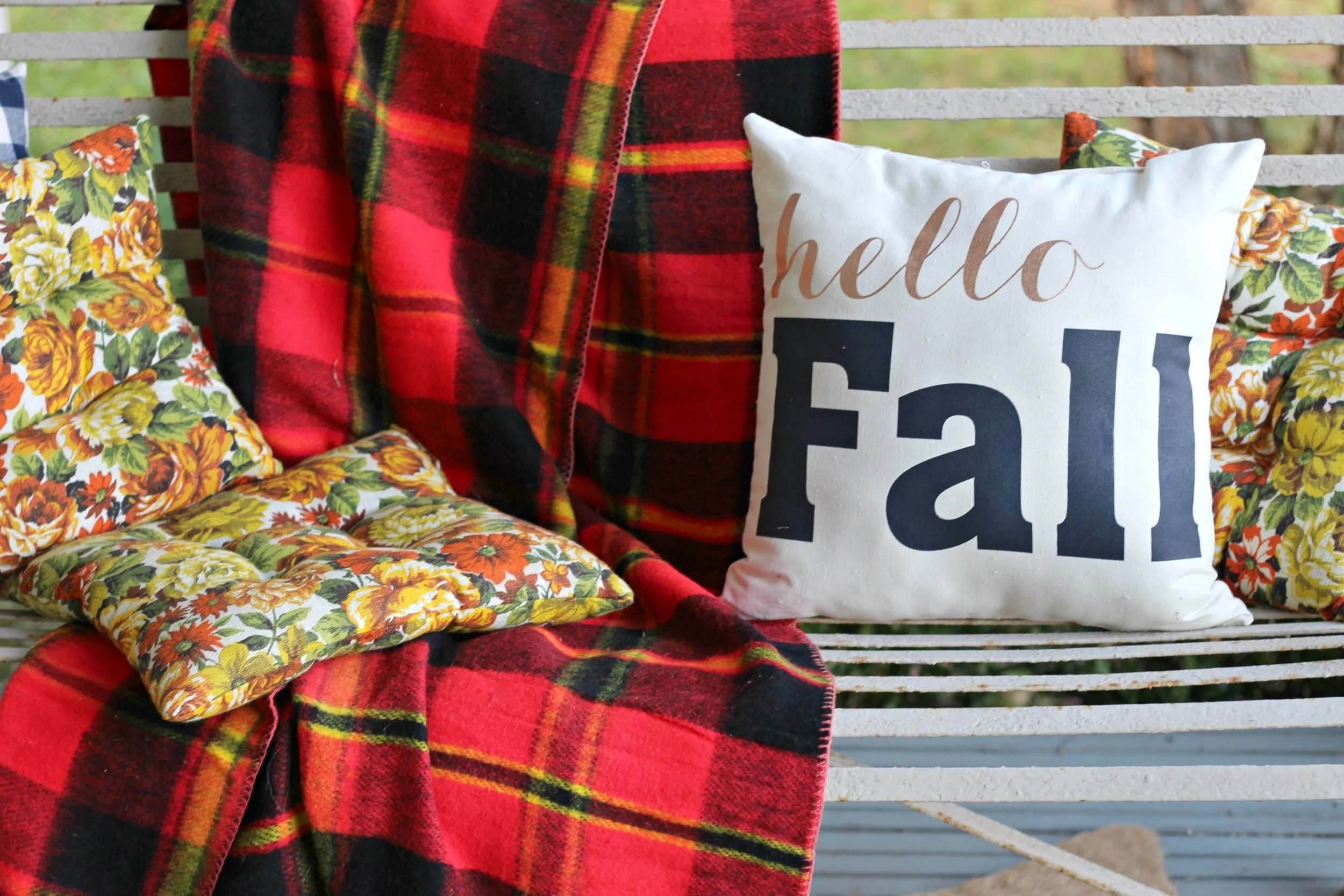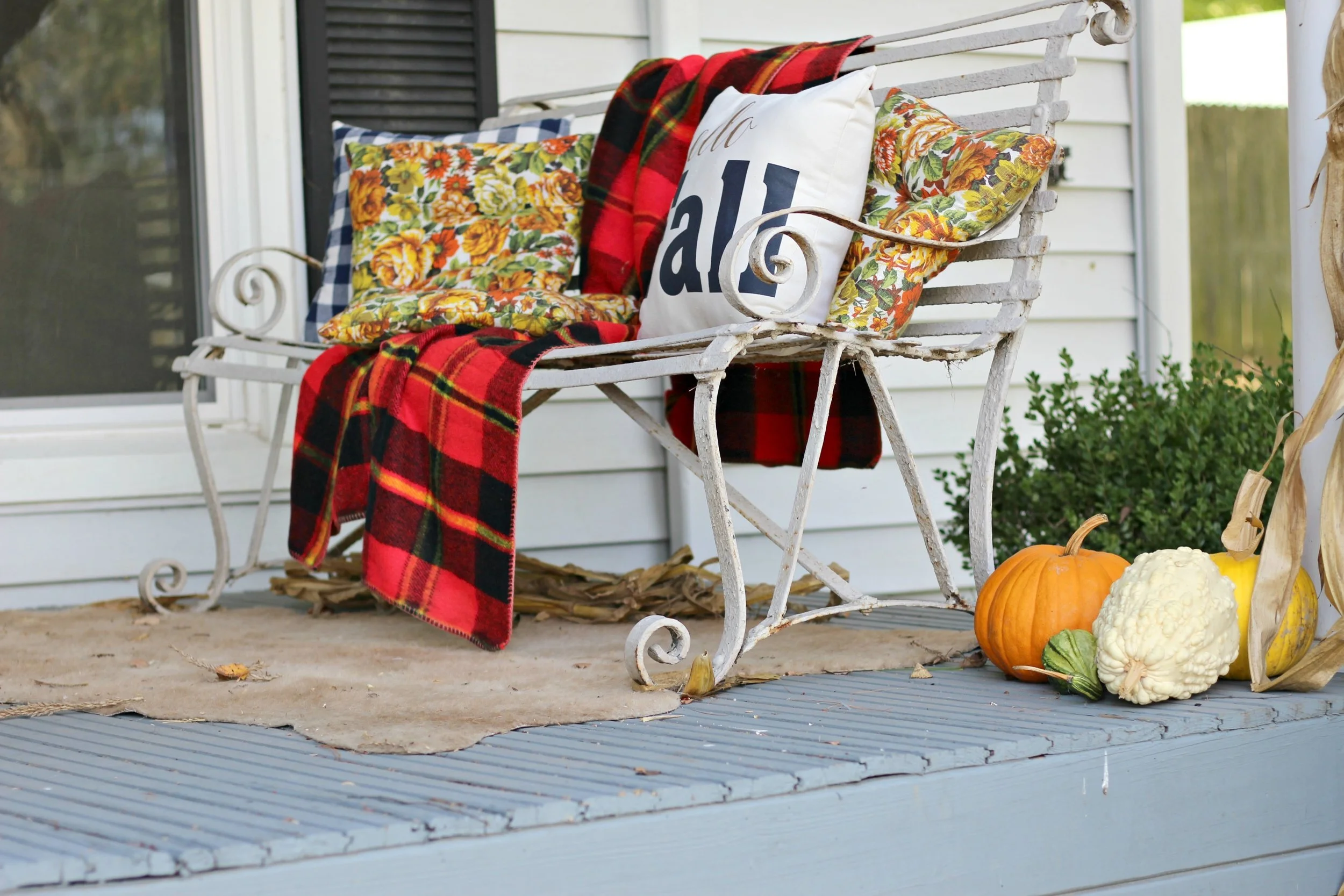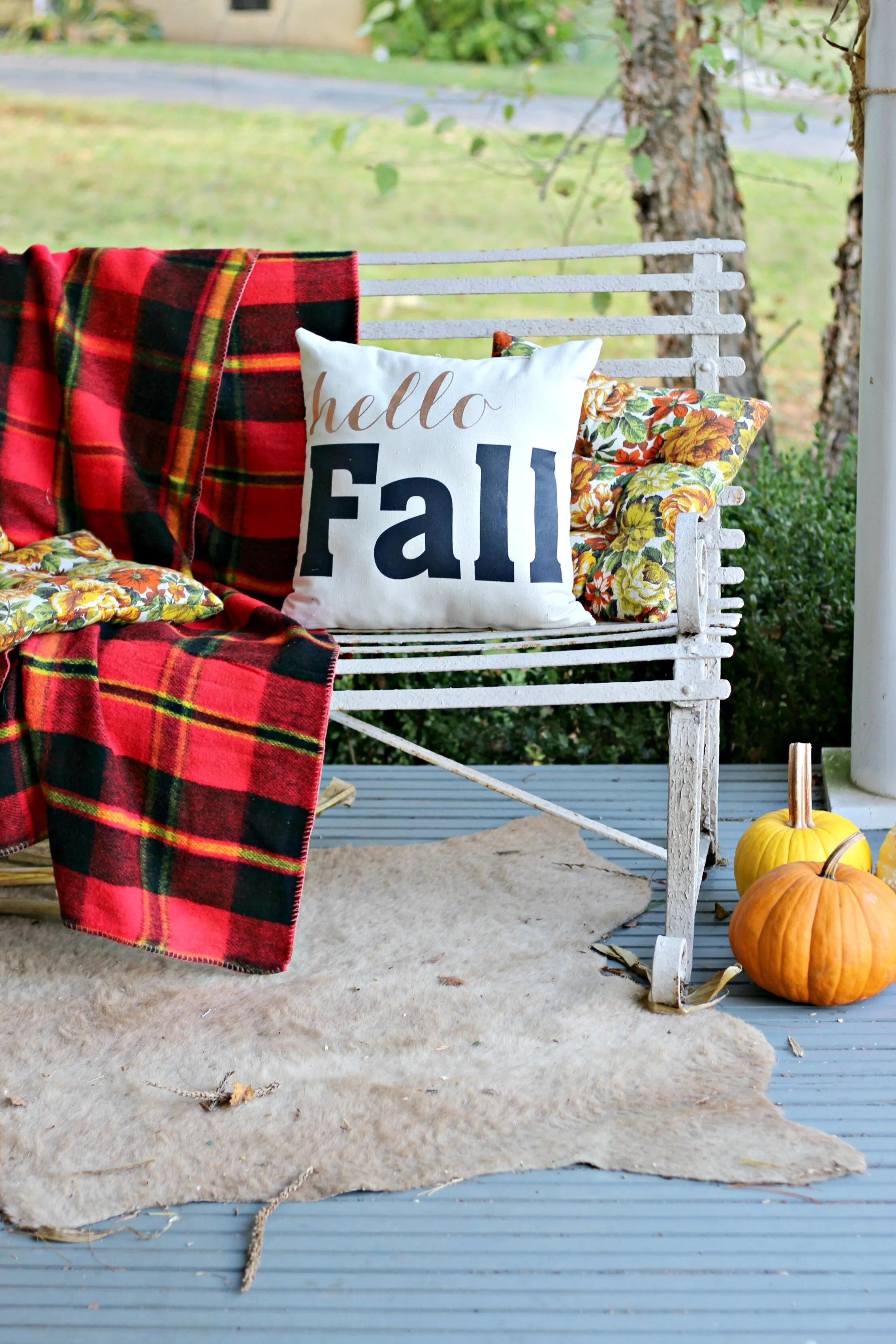 Since this area is protected from the rain I was able to pile my bench full of pillows + a cute plaid blanket. The floral pillows are vintage barkcloth that I found at an estate sale, while the gingham + "Hello Fall" pillow were steals from the Target Dollar Spot. The wool blanket is also a vintage find and a perfect pop of color.
