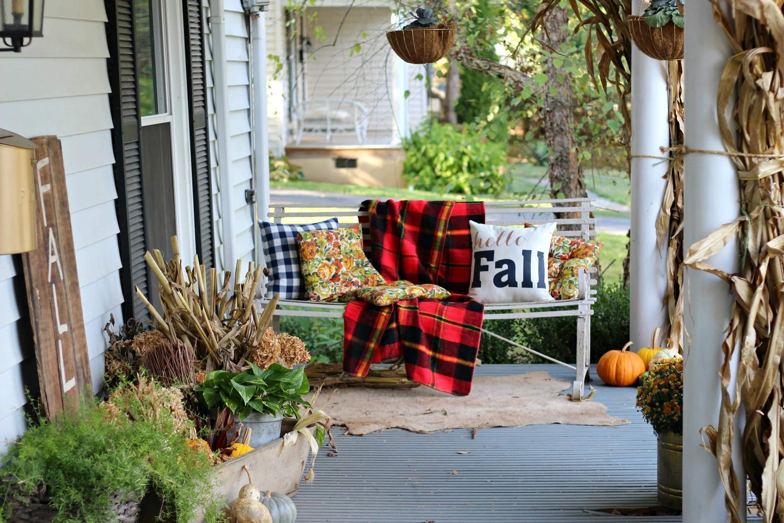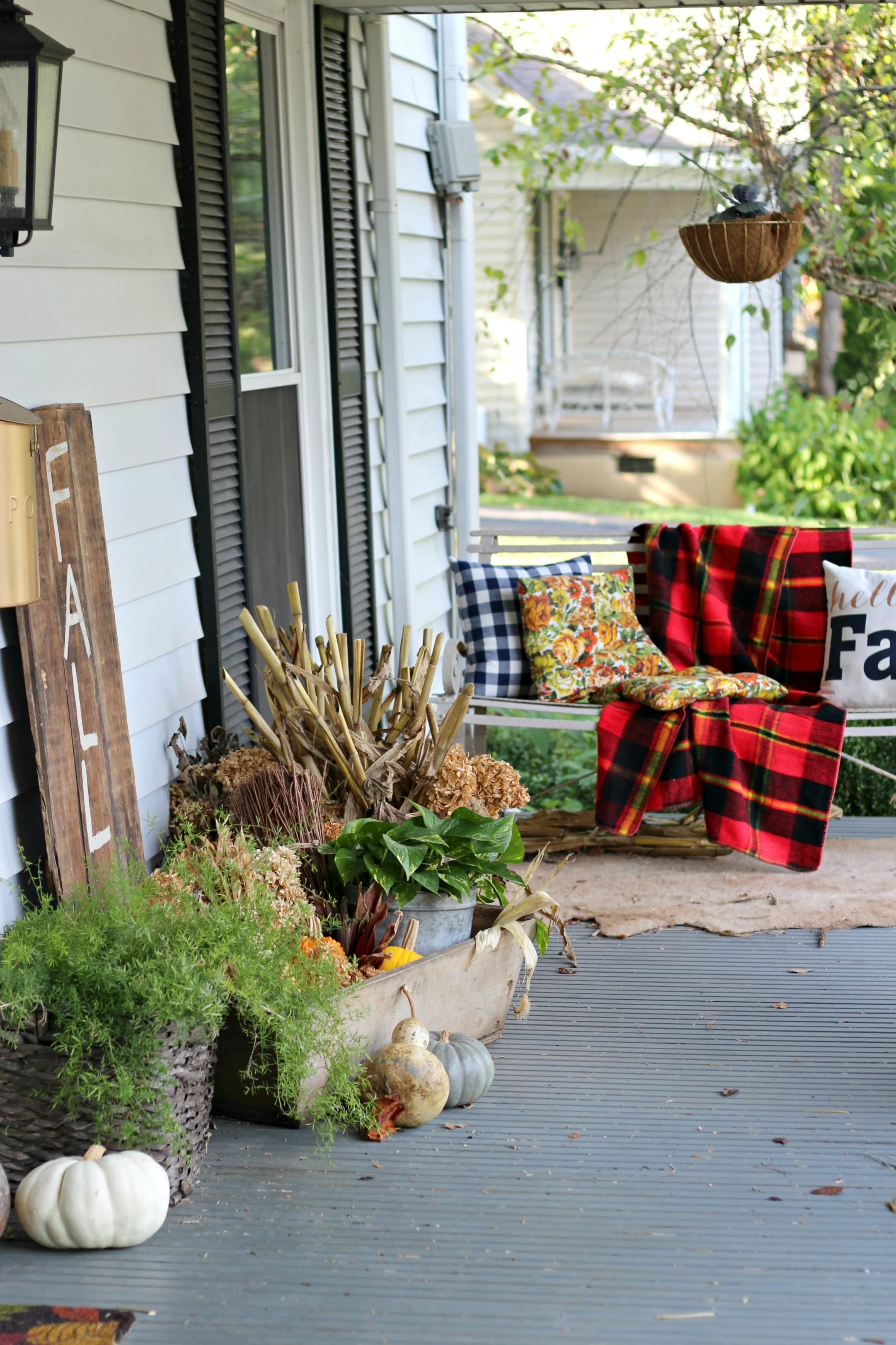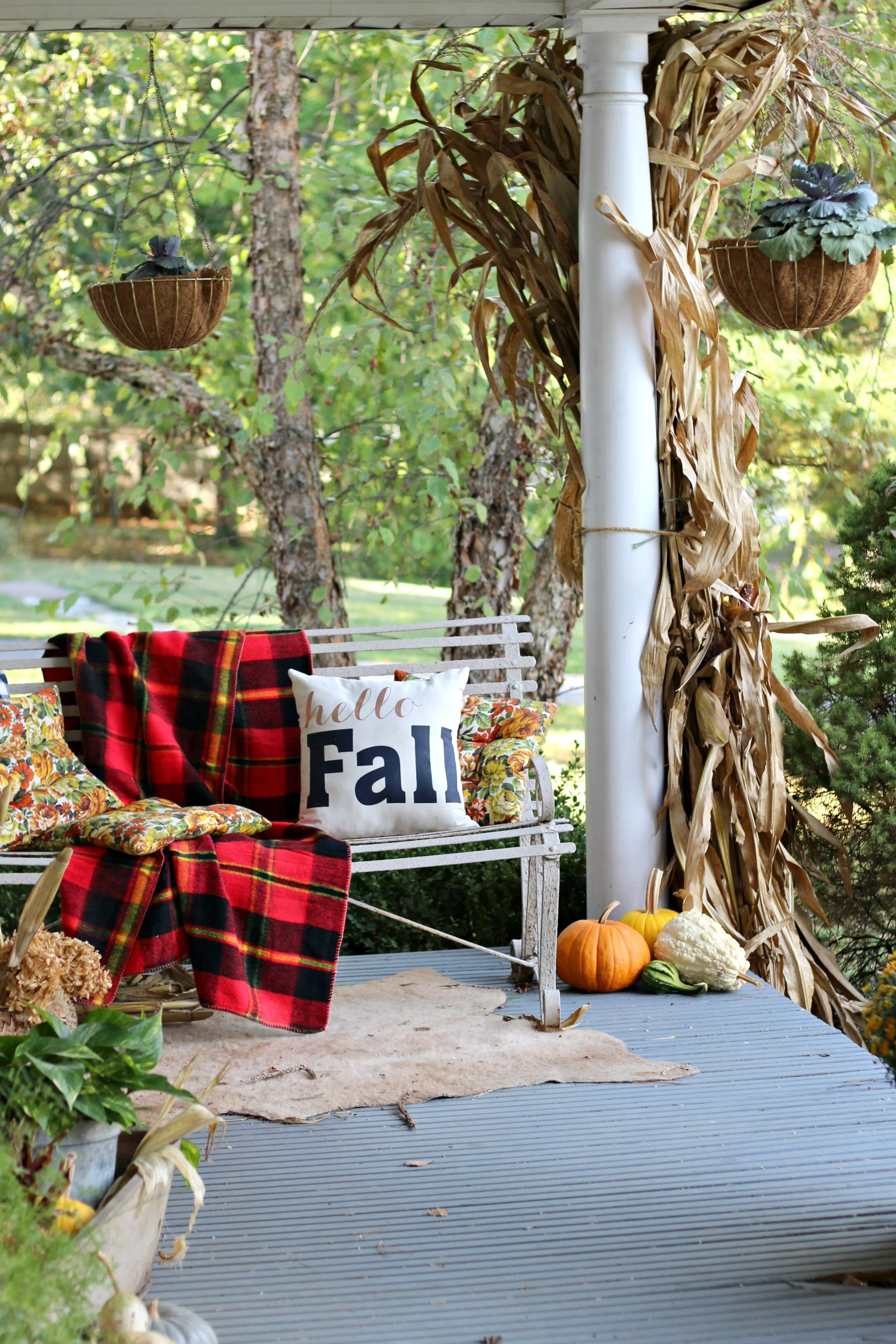 Since this area is protected from the rain I was able to pile my bench full of pillows + a cute plaid blanket. The floral pillows are vintage barkcloth that I found at an estate sale, while the gingham + "Hello Fall" pillow were steals from the Target Dollar Spot. The wool blanket is also a vintage find and a perfect pop of color.