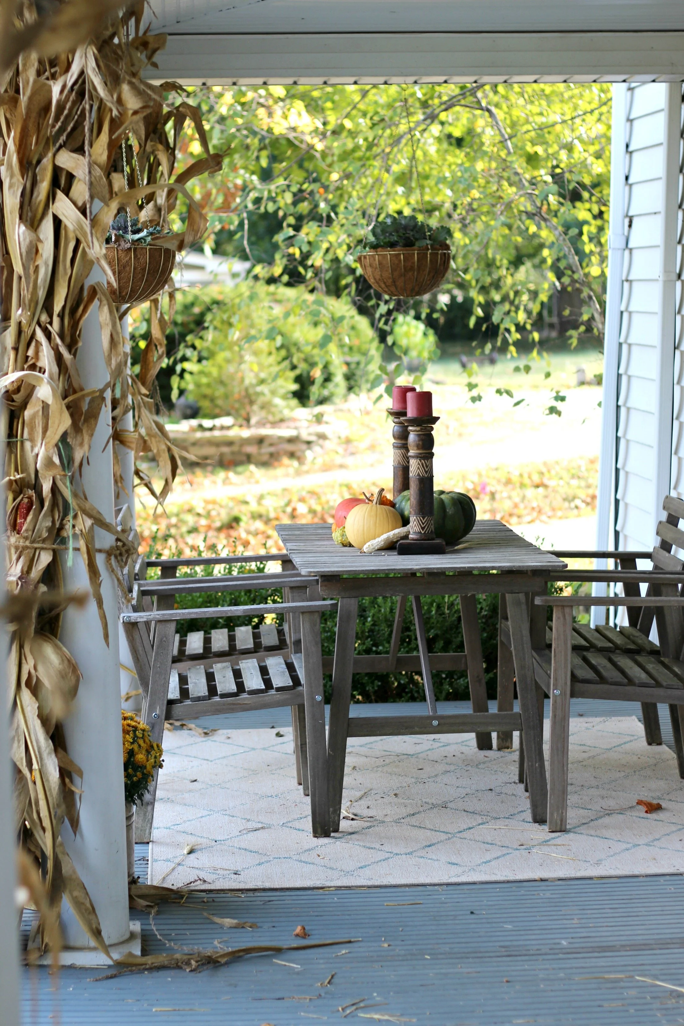 We lucked out on finding this cute little IKEA dining set a garage sale and it's the perfect size for the porch. I created a simple centerpiece on the middle of the table with a few different colored pumpkins + wooden candlesticks. I also found the hanging gold planters at a garage sale and filled them with my favorite fall plants: cabbages + kale!