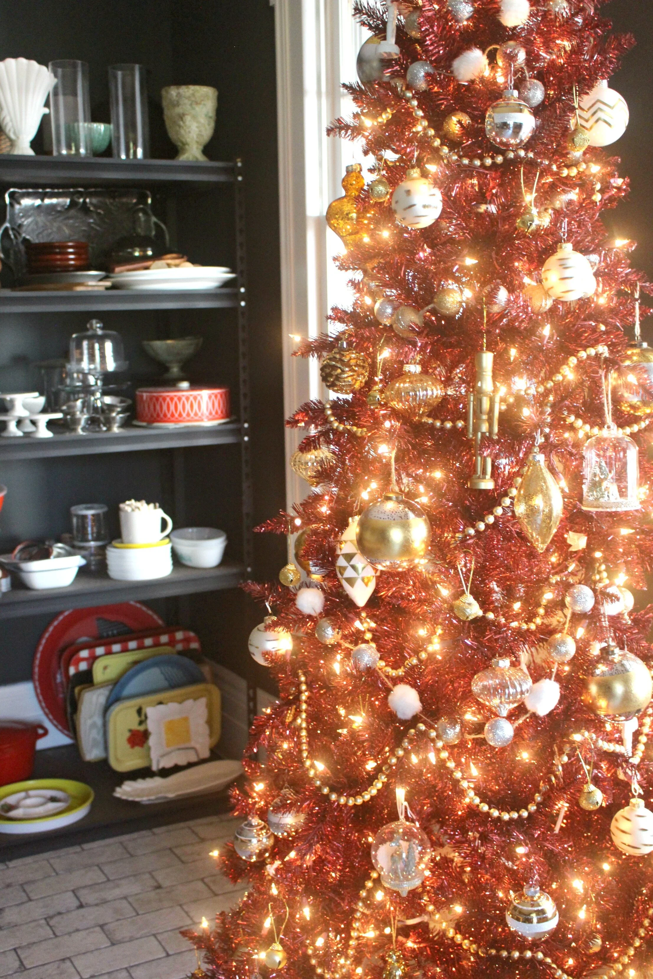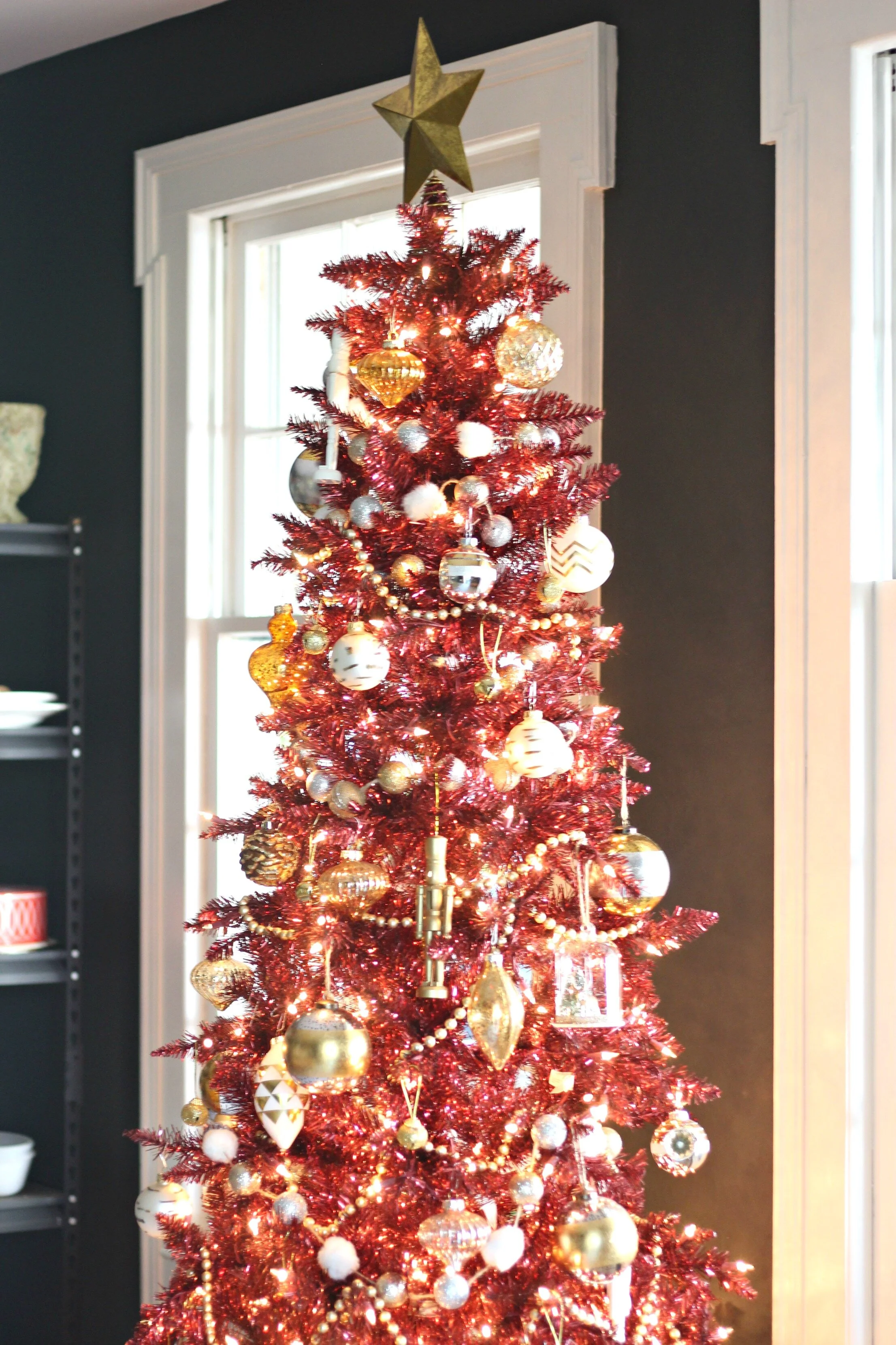 I knew I wanted a uniquely colored tree to really pop against the dark walls in this room. Thanks to Hayneedle, I was able to find THE PERFECT deep red tinsel tree and they were generous enough to send it to me to style for this room. If you have never heard of Hayneedle it is a one-stop online shop for home decor and you can find really great prices on just about everything, furniture, bedding, kitchenware, lighting, and more! I am always a bit nervous ordering trees online that I can't see in person, but I was SO pleasantly surprised when the tree arrived! It is extremely beautiful and expensive-looking and has more than enough lights that are a beautiful golden color when lit. I decorated it with lots of gold and metallic ornaments to play off of all the brass and gold details I have in this room, including our chandelier.