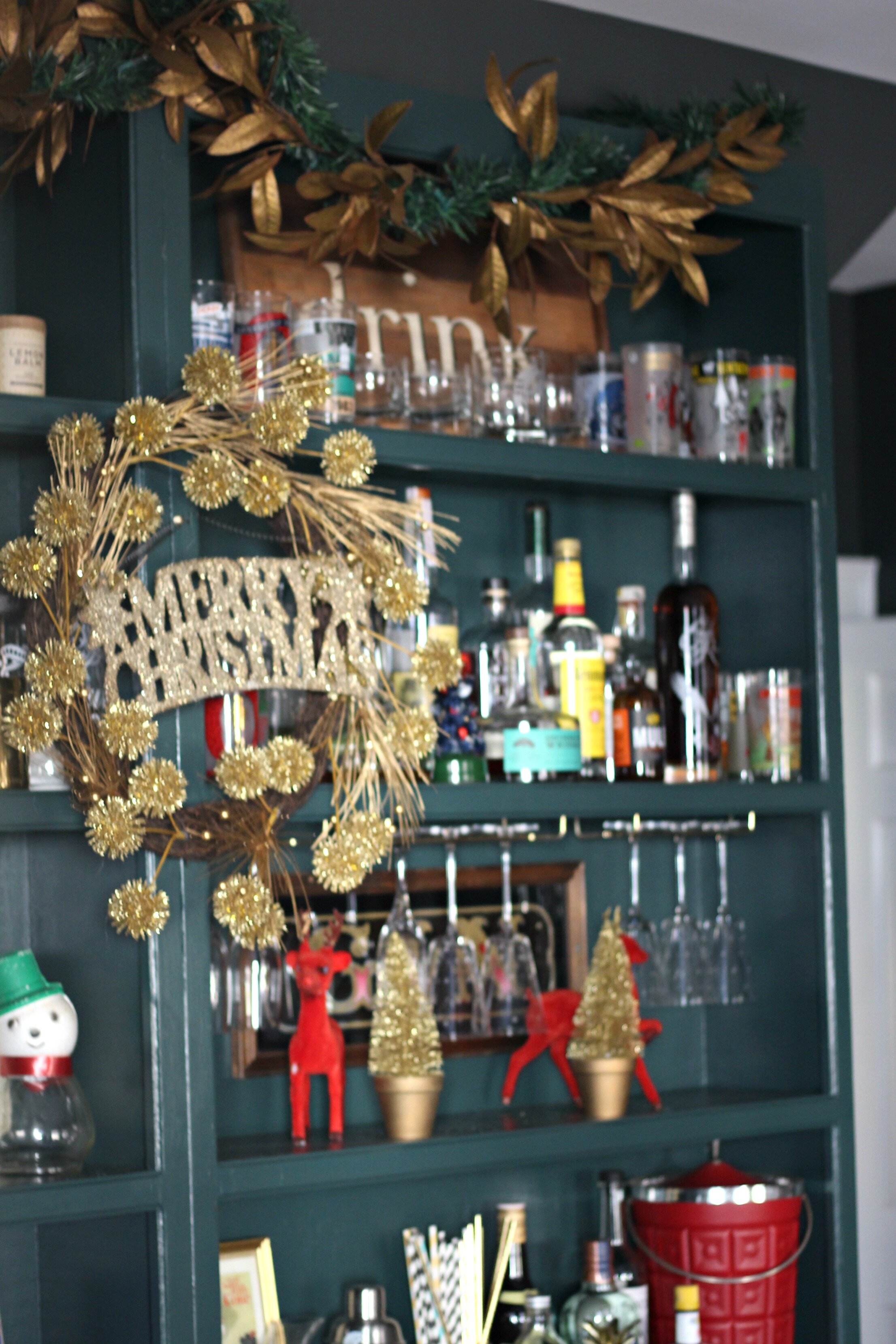 On our open shelving, I added some pops of gold as well, including garland at the top and a fun wreath hanging over the shelves. I also mixed in some of my favorite little vintage Christmas keepsakes, like these flocked deer, Christmas store signs, and my Santa cookie jar. I'm not quite finished with the entire room yet and still have a few finishing touches to add, but I wanted to go ahead and share a preview of my progress so far! Enjoy!