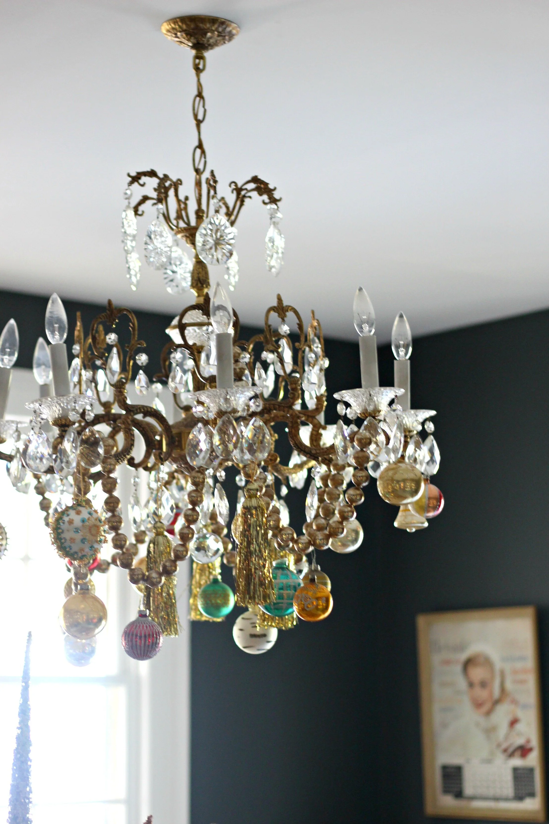 Speaking of the chandelier, it might be my favorite part of the Christmas decorations in here. I was inspired to hang lots of vintage ornaments and garland from it from pictures I had seen on Pinterest, and I love the finished look! It is such a beautiful and glamorous centerpiece for the room and a perfect way to display vintage or heirloom ornaments.